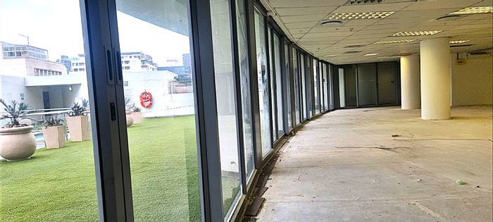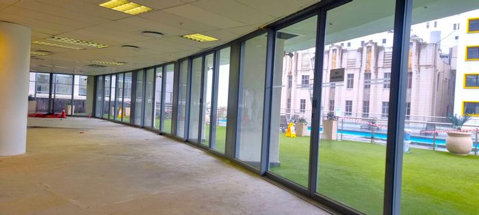 Creative two-level office in iconic Mandela Rhodes Place, centered on an animated atrium with cafés and hotel reception; linked open-plan shells (642 m²) lead to a sun‑splashed poolside patio.