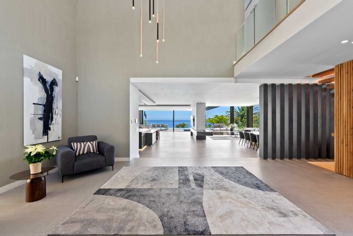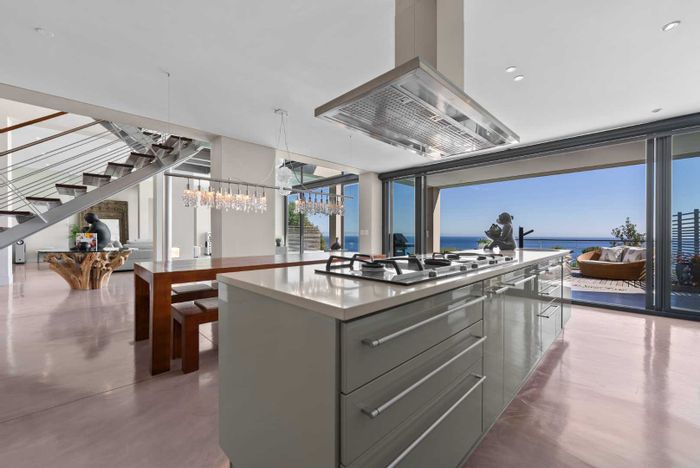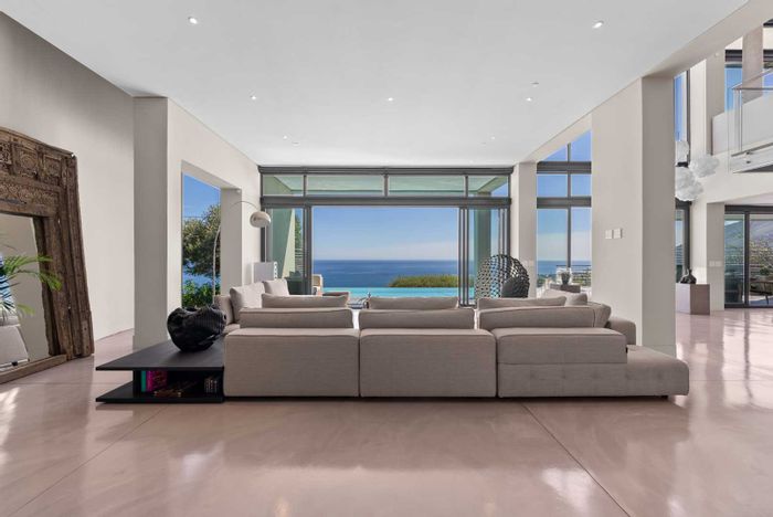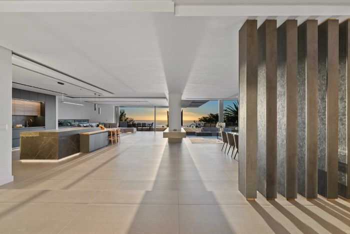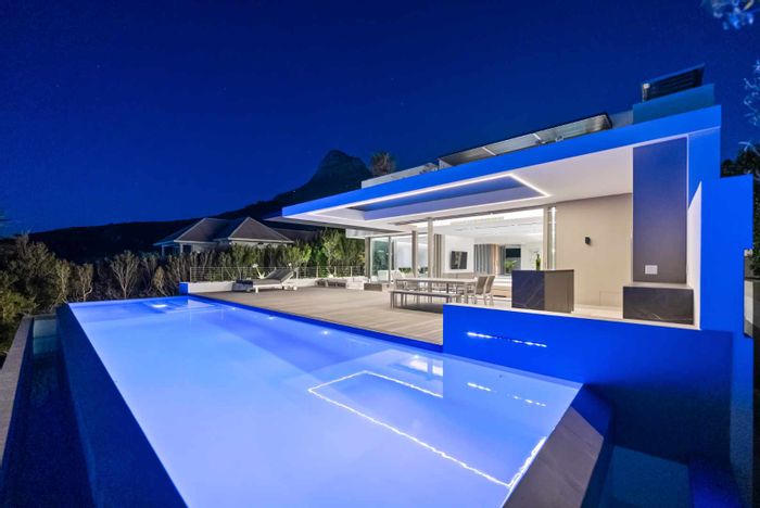 Entertain overlooking 360° Atlantic, Lion’s Head and Twelve Apostles from a Camps Bay villa with rim-flow pool, floor-to-ceiling glass and separate flatlet — six bedrooms, staff quarters.