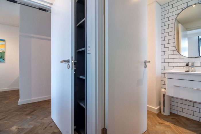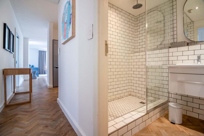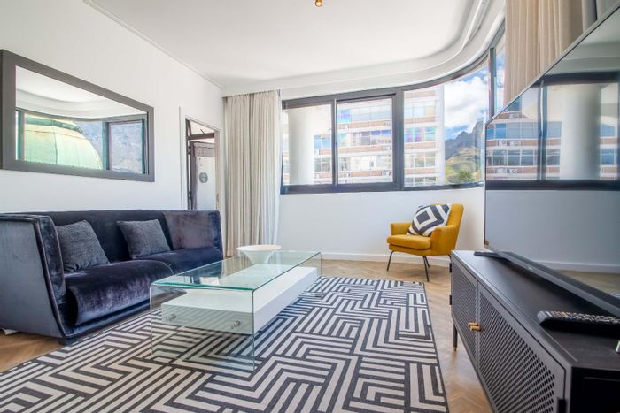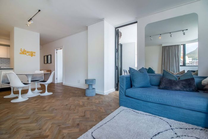 Robert Silke–designed, furnished apartment in Cape Town’s legal district, an easy walk to Kloof Street and Company Gardens, with open-plan living, balcony with mountain views. 2 beds, 2 baths, parking.