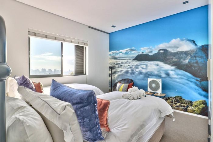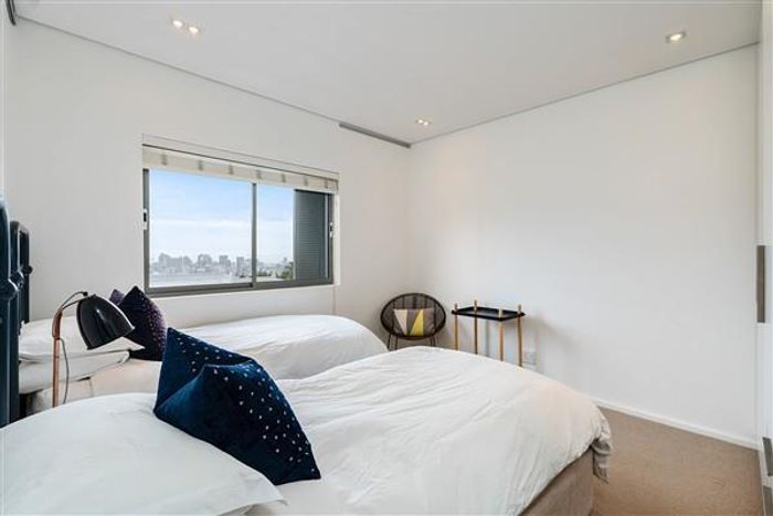 Enjoy elevated urban living with panoramic city, harbour and Table Mountain views on the Higgovale–Oranjezicht border in Queensbury Mansions; modern Smeg/Bosch kitchen, direct lift access, three bedrooms, two baths.