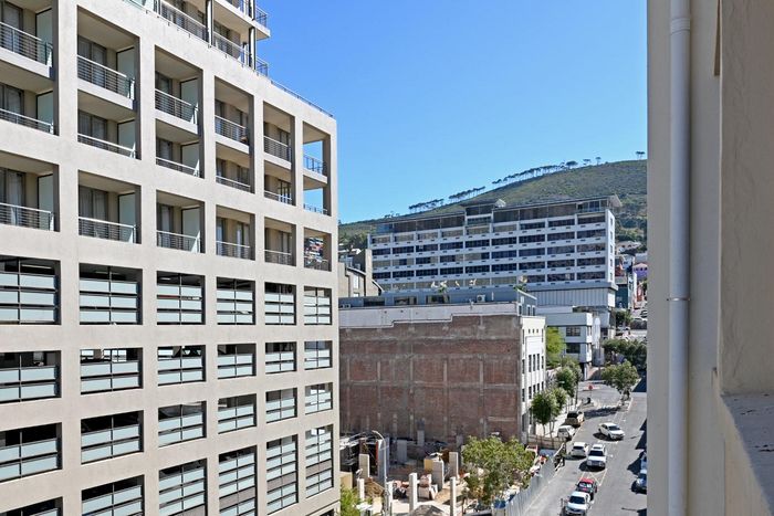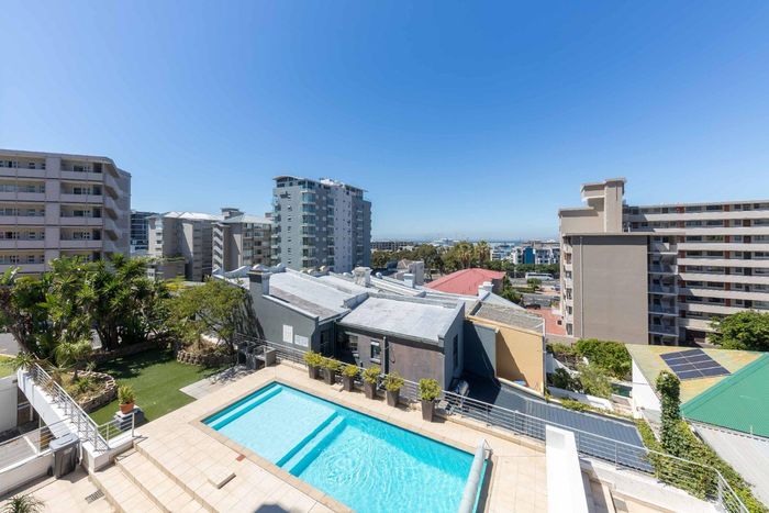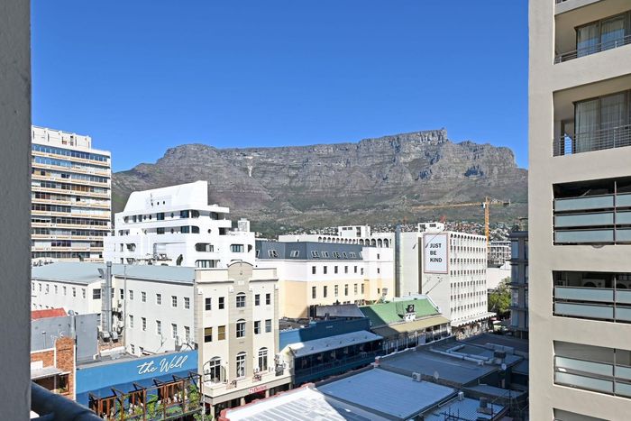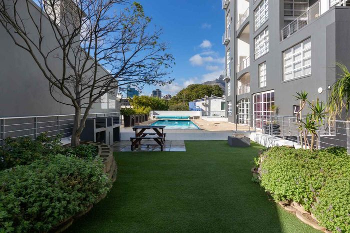 Lock-up-and-go urban living on Church Square with partial Table Mountain views; turnkey, furnished with Bosch appliances and pool access — two bedrooms, two bathrooms and secure parking.