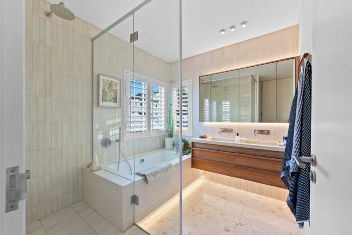 Pet-friendly Vredehoek flat high on the hill, steps from nature walks, cafes and cycling tracks. Spacious open-plan kitchen/living, solid wood floors, north-facing balcony; two bedrooms with renovated en-suite bathrooms.
