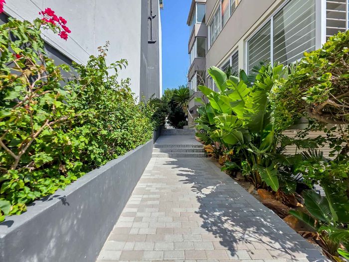 Seaside living steps from the promenade, cafés and boutiques — top-floor one-bedroom, one-bathroom apartment with private balcony overlooking a lush communal garden, soaring ceilings, wooden floors and open-plan kitchen.