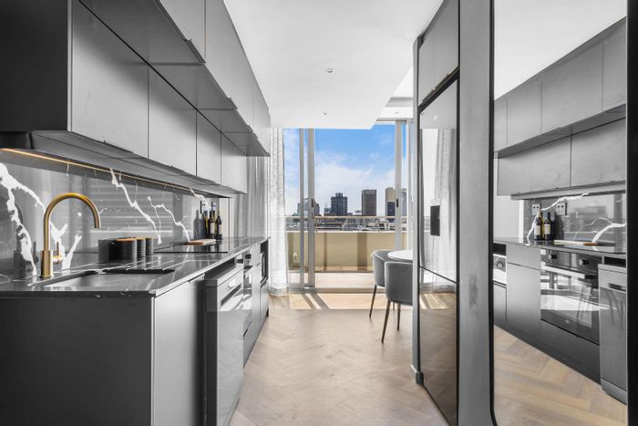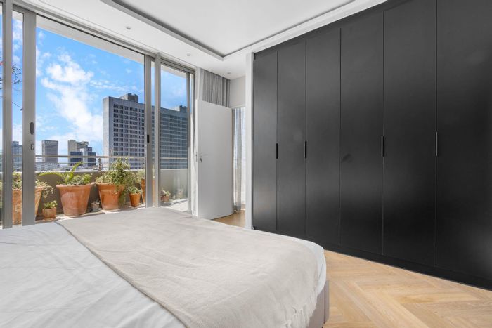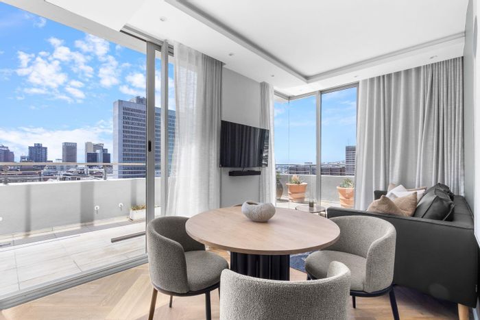 High-floor urban retreat with panoramic Table Mountain and Lions Head views, steps from trendy Harrington Street eateries. Features rooftop pool, gym, biometric security; unfurnished, one bathroom and covered parking.