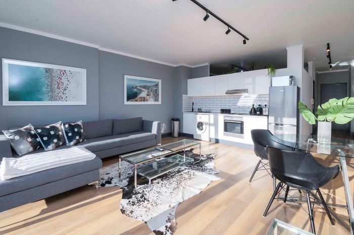 Urban pied-à-terre on Keerom Street, blending Victorian charm with bold modern design; fully furnished two-bed, two-bath apartment with open-plan living and balcony overlooking Table Mountain.