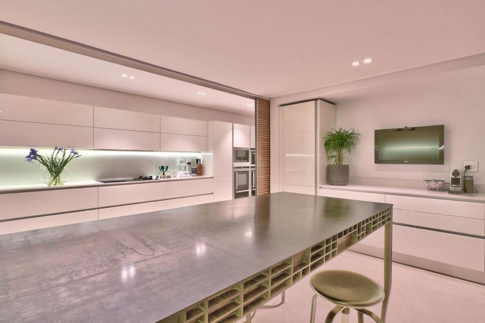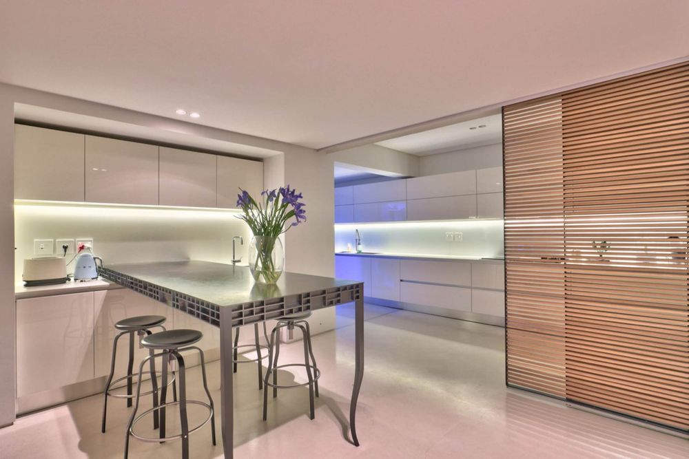 The open plan kitchen, a one of a kind, from the clean, crisp design to the walk in fridge with a view and bamboo dividers.