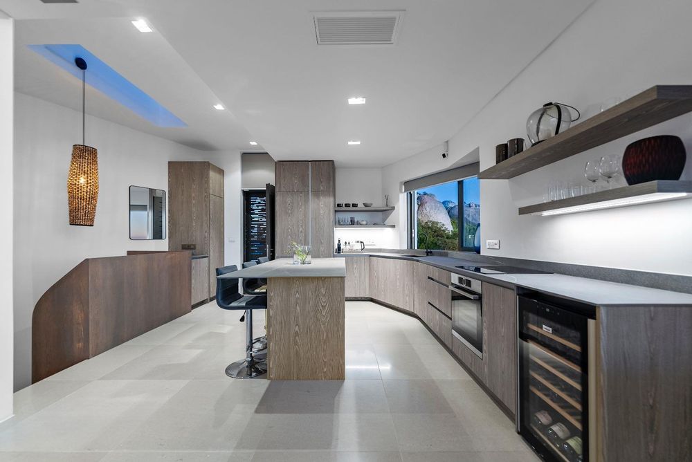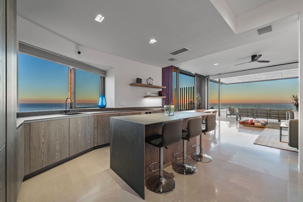 > Well appointed kitchen with high end finishes and sweeping mountain and ocean views