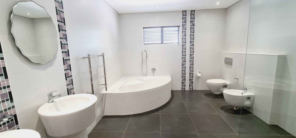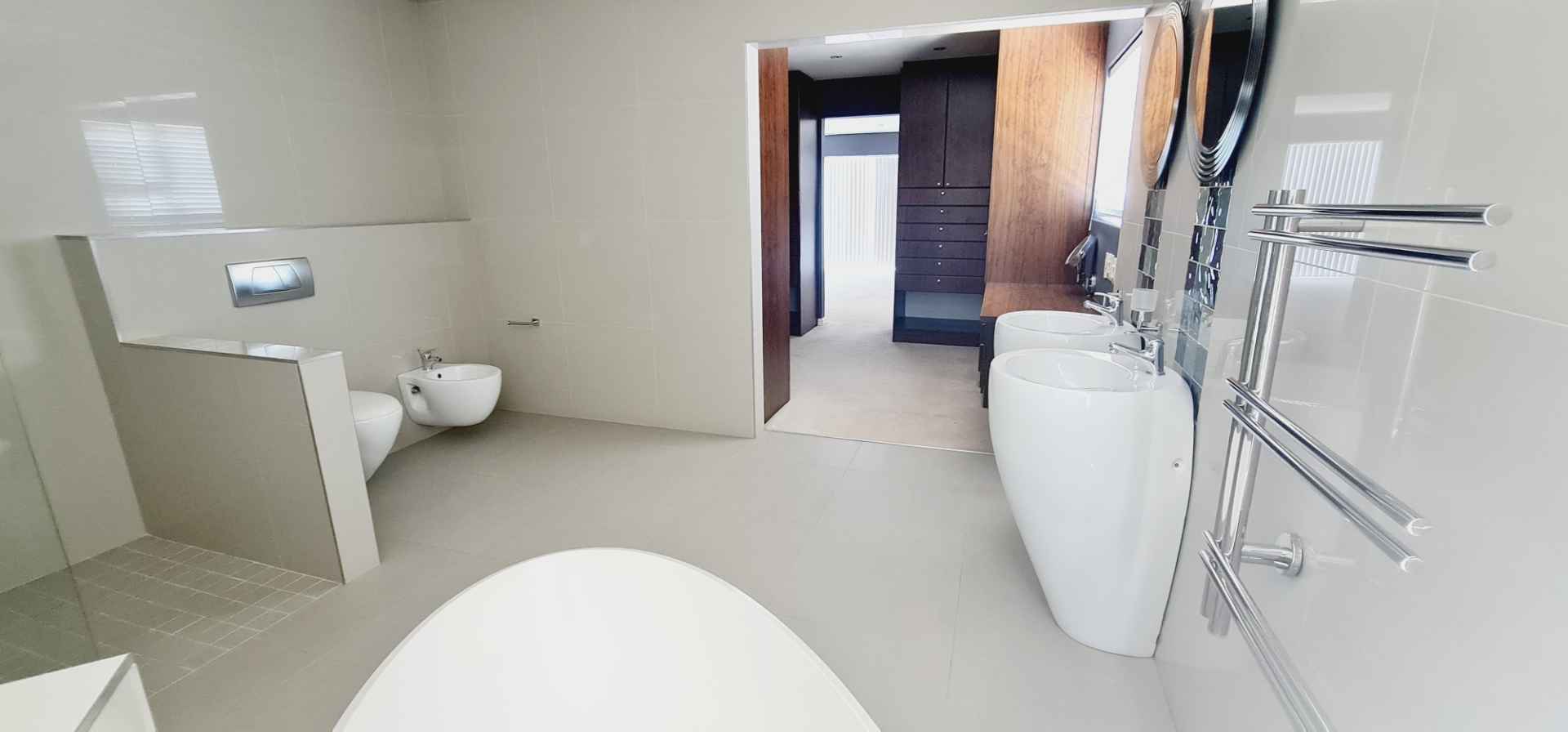 The upper level also features the second main bedroom suite — a truly impressive space complete with a spacious walk-in dressing room, generous cupboard space and an expansive ensuite bathroom with a luxurious bidet. Waking up to uninterrupted views of Table Mountain is simply part of everyday life in this extraordinary home.