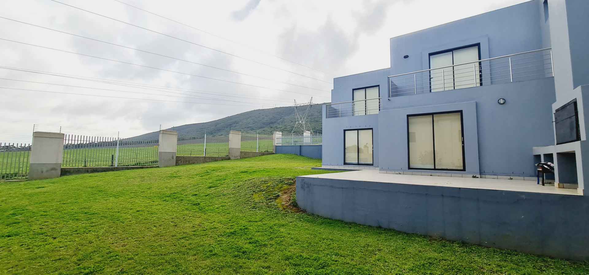 Glass doors open onto an expansive entertainment patio with a built-in braai, perfectly positioned to overlook the lush lawn and the magnificent vineyard views beyond — the ideal setting for long summer evenings and relaxed weekend gatherings.