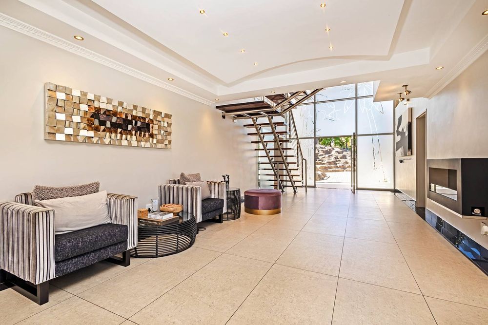 A striking glazed entrance welcomes you into light-filled, open-flow living spaces where the designer kitchen, dining area, and fireside lounge blend seamlessly, all oriented toward a magnificent outdoor terrace. Here, a sculpted rock pool, framed by manicured greenery and an outdoor shower, sets the tone for relaxed yet sophisticated entertaining, complemented by a covered braai pavilion designed for year-round enjoyment as the sun sets over the city skyline.