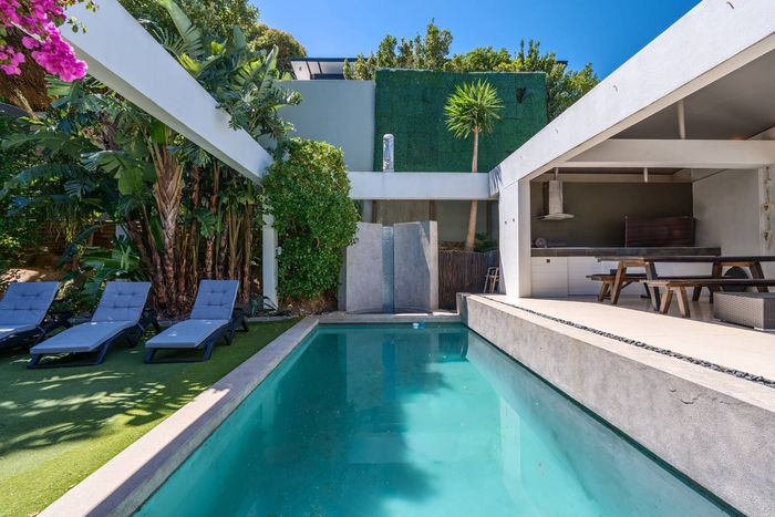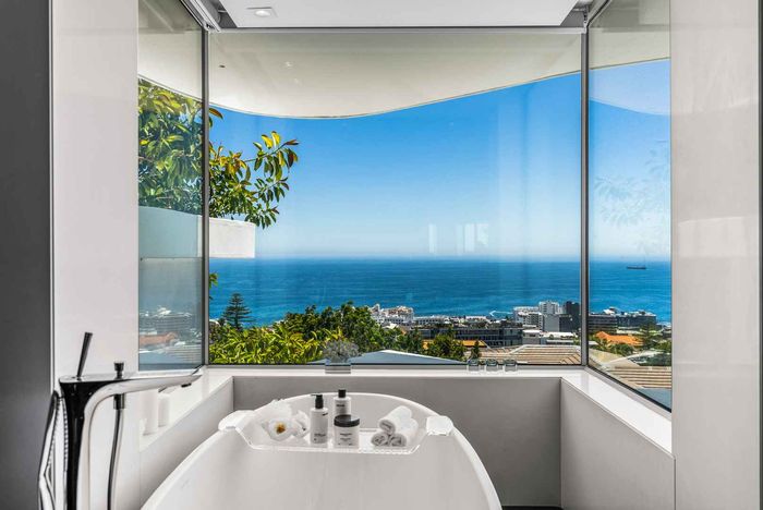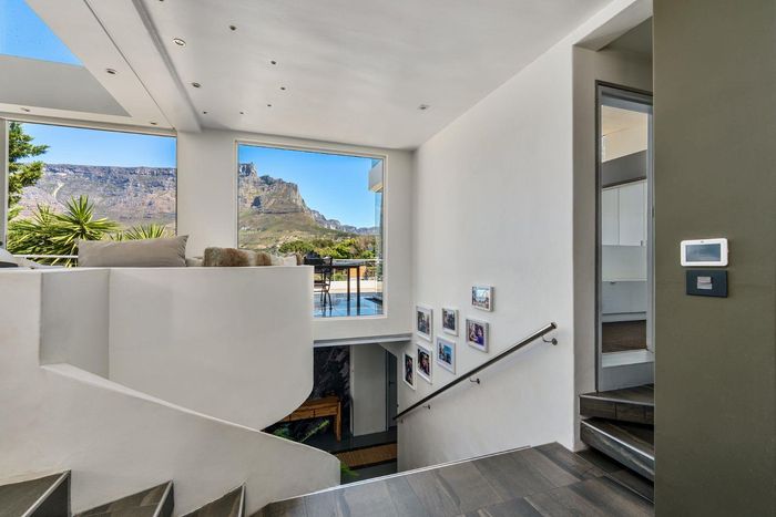 Entertain with panoramic Table Mountain views from sun-drenched terraces and a courtyard pool with built-in braai in Tamboerskloof — four bedrooms, three bathrooms and double garage.