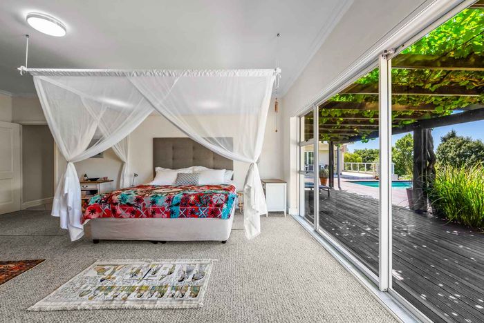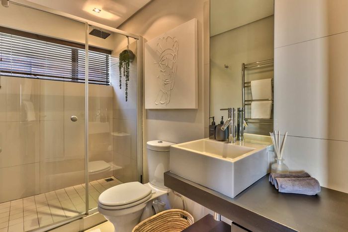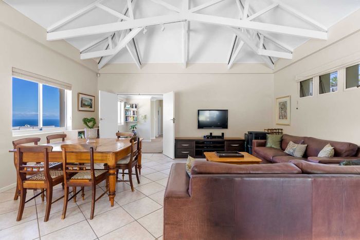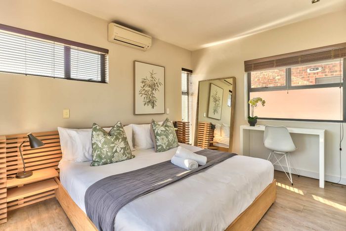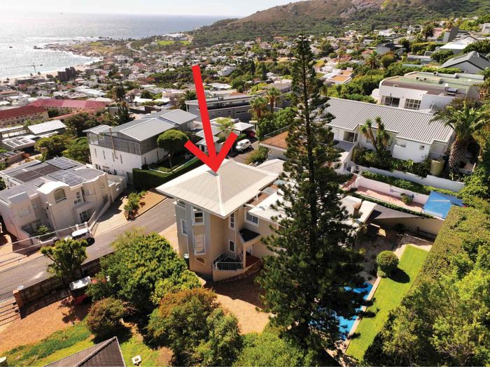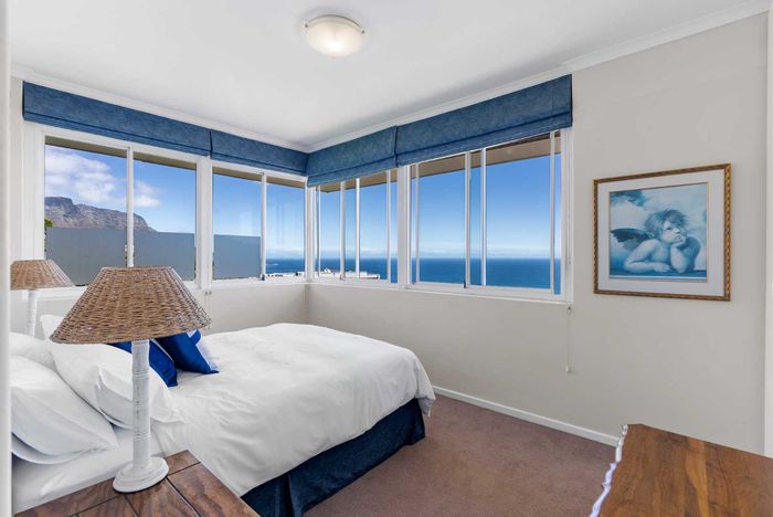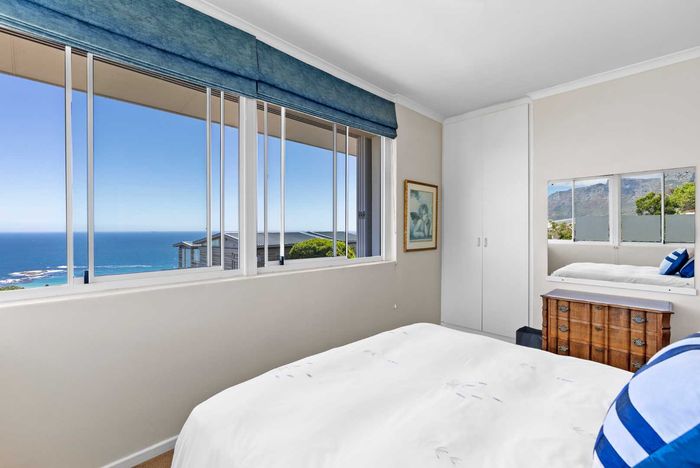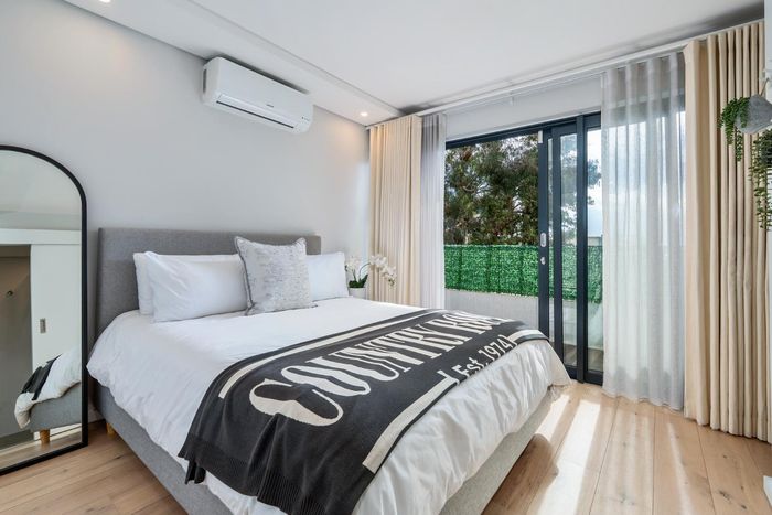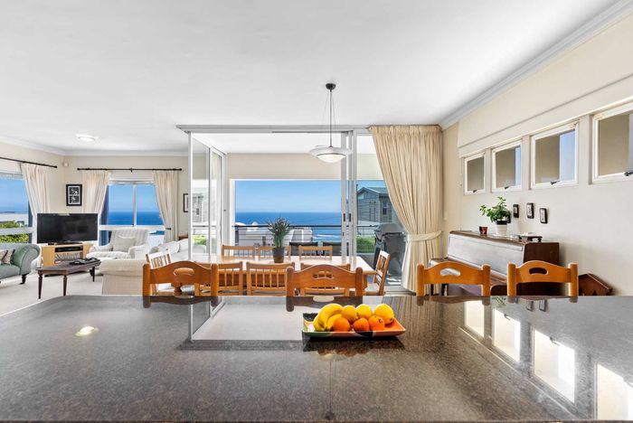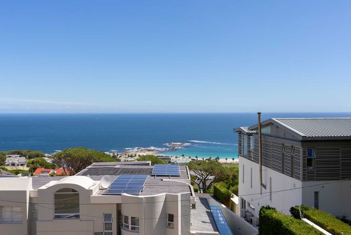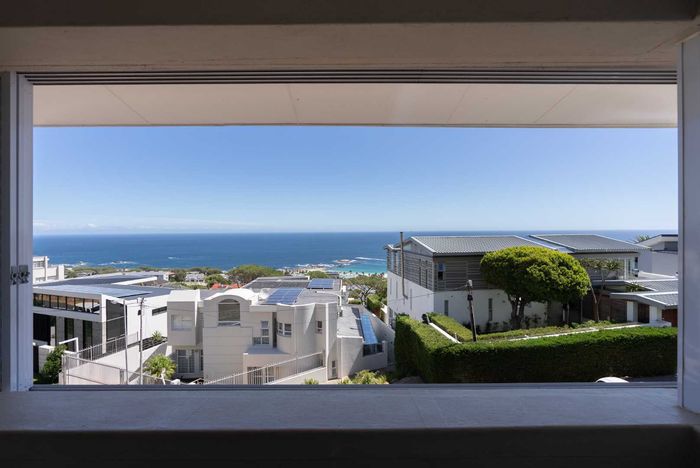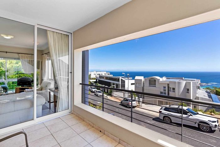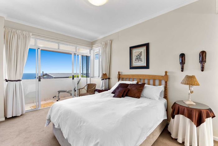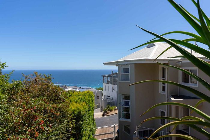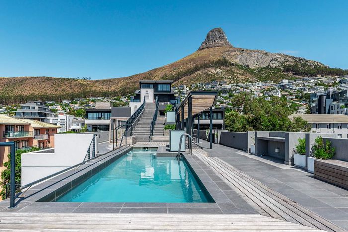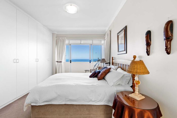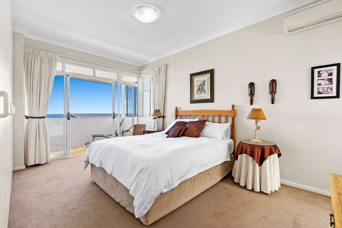 Enjoy ocean-view balconies, rooftop pool and braai, walking distance to shops and restaurants — stylish open-plan living with gas fireplace, wooden floors, aircon; two en-suite bedrooms, two undercover parking bays.