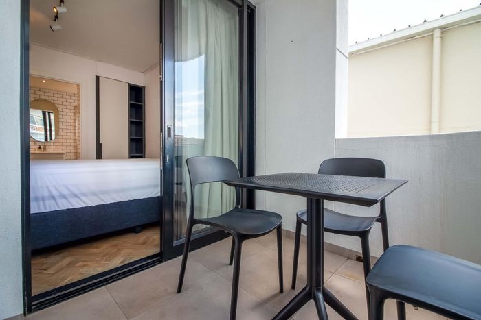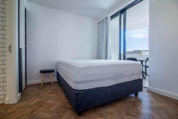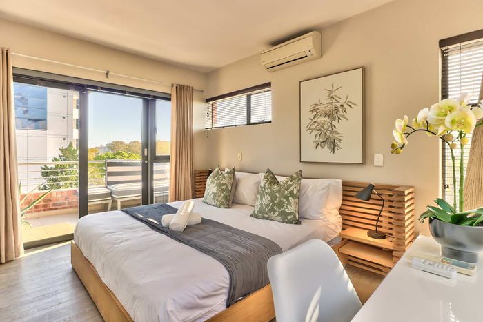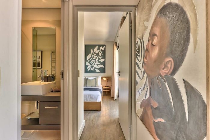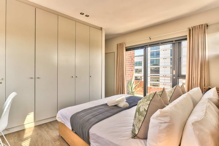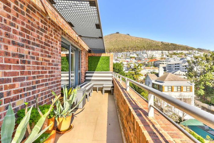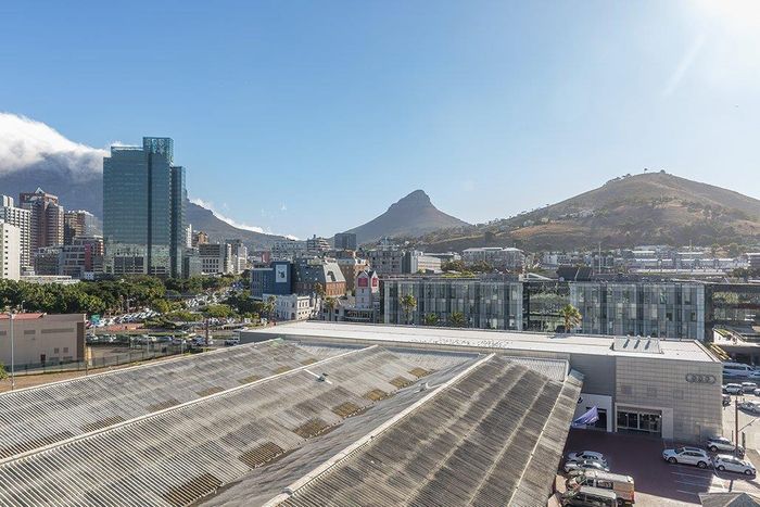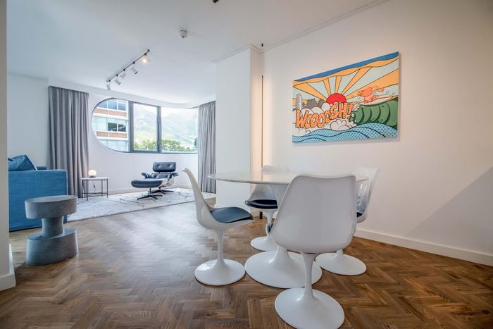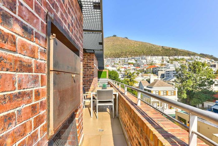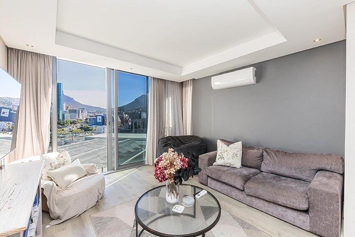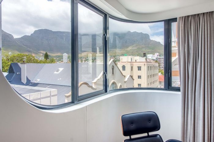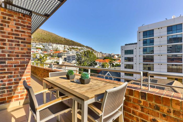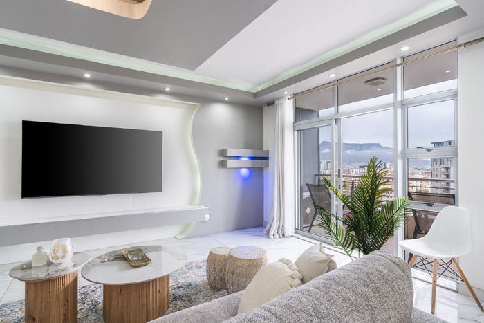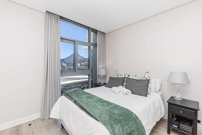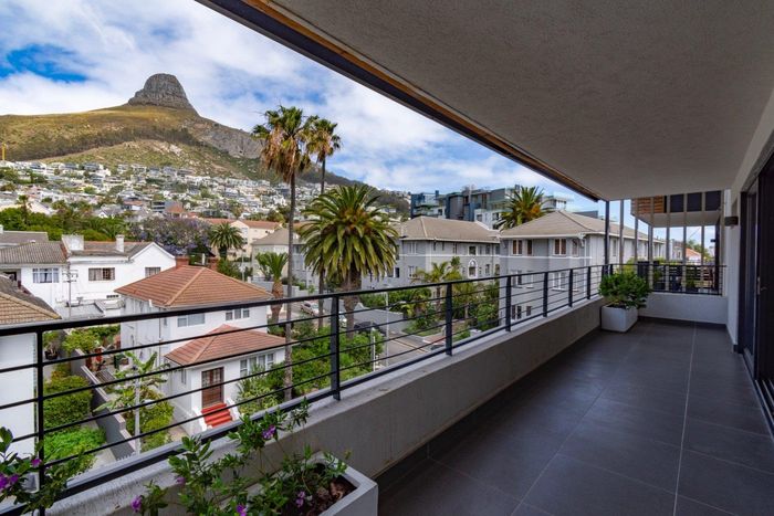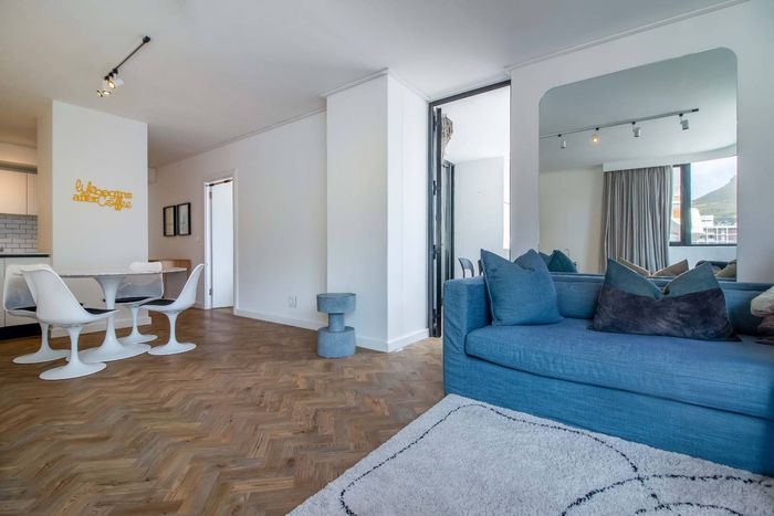 Enjoy vibrant Cape Town living in Green Point, steps from the park, with a wraparound balcony framing Signal Hill and stadium views — two beds, two baths, one park bay.