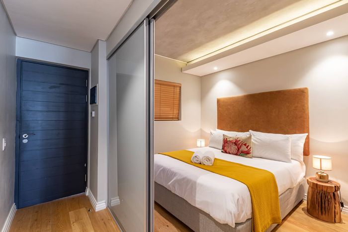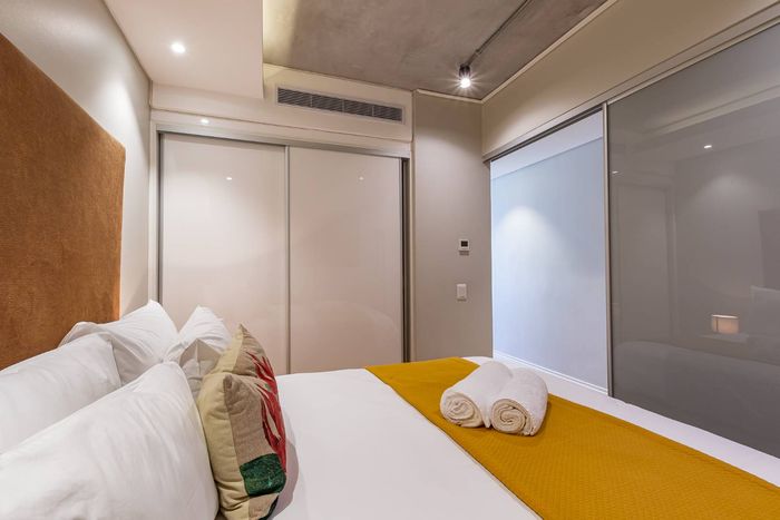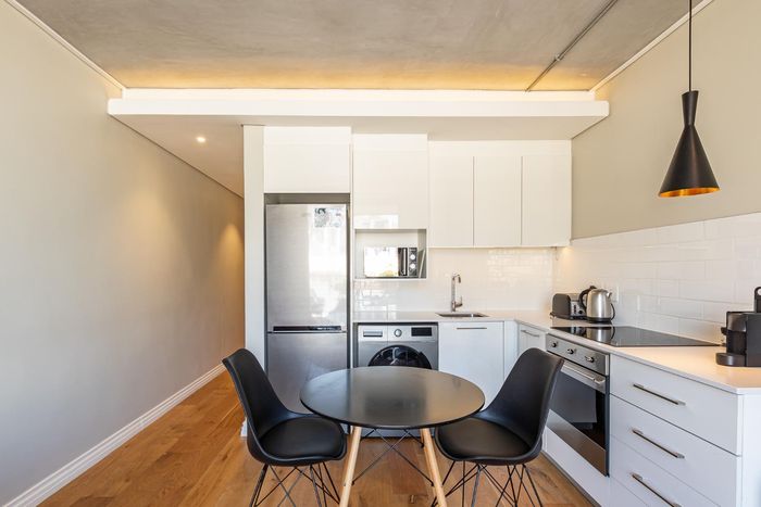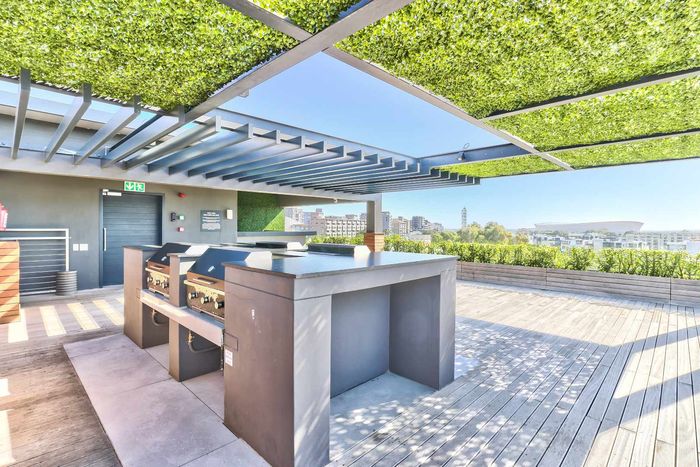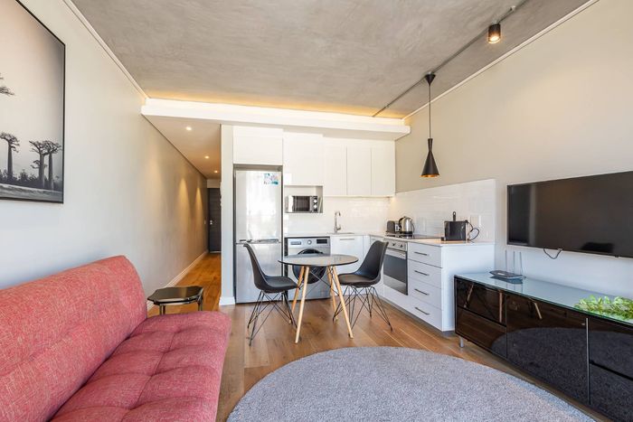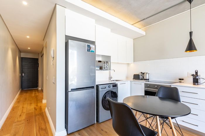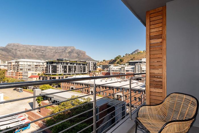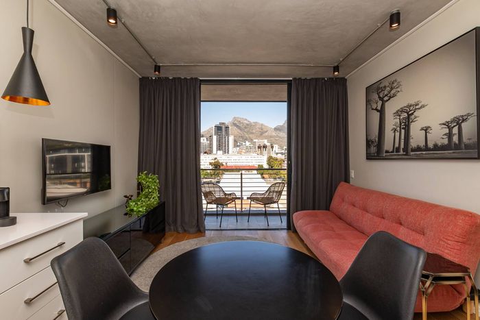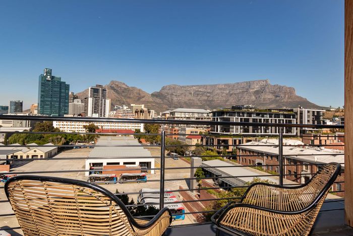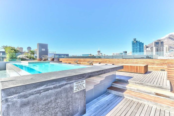 City-edge living with panoramic Table Mountain views and rooftop pool/bar — enjoy De Waterkant vibrancy, balcony sundowners, vida e caffè downstairs; one bedroom, two secure bays.
