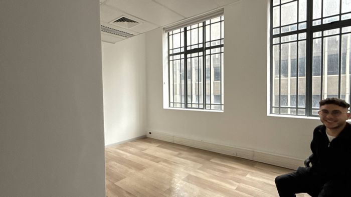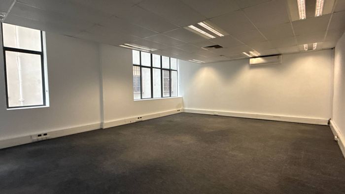 171m² office space in Cape Town CBD with open-plan layout, kitchenette, shared bathrooms, and secure parking available.