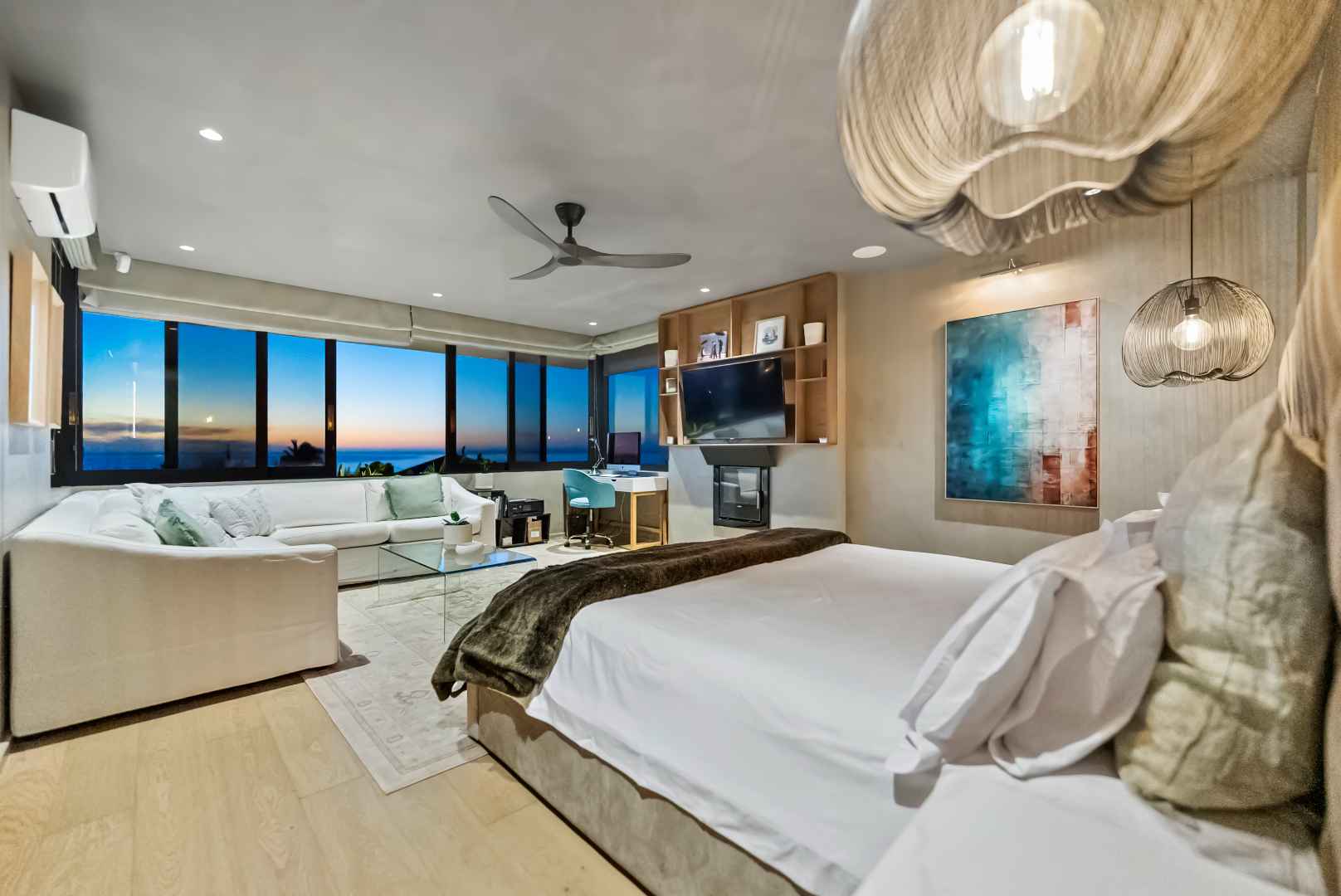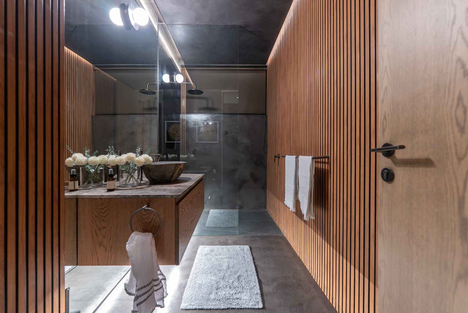 Both the lounge and dining areas are fitted with cozy fireplaces, perfect for cooler evenings. This level also includes a tastefully designed guest toilet and access to a zen-like garden at the rear of the house. A guest bedroom completes this level, offering comfort and privacy.