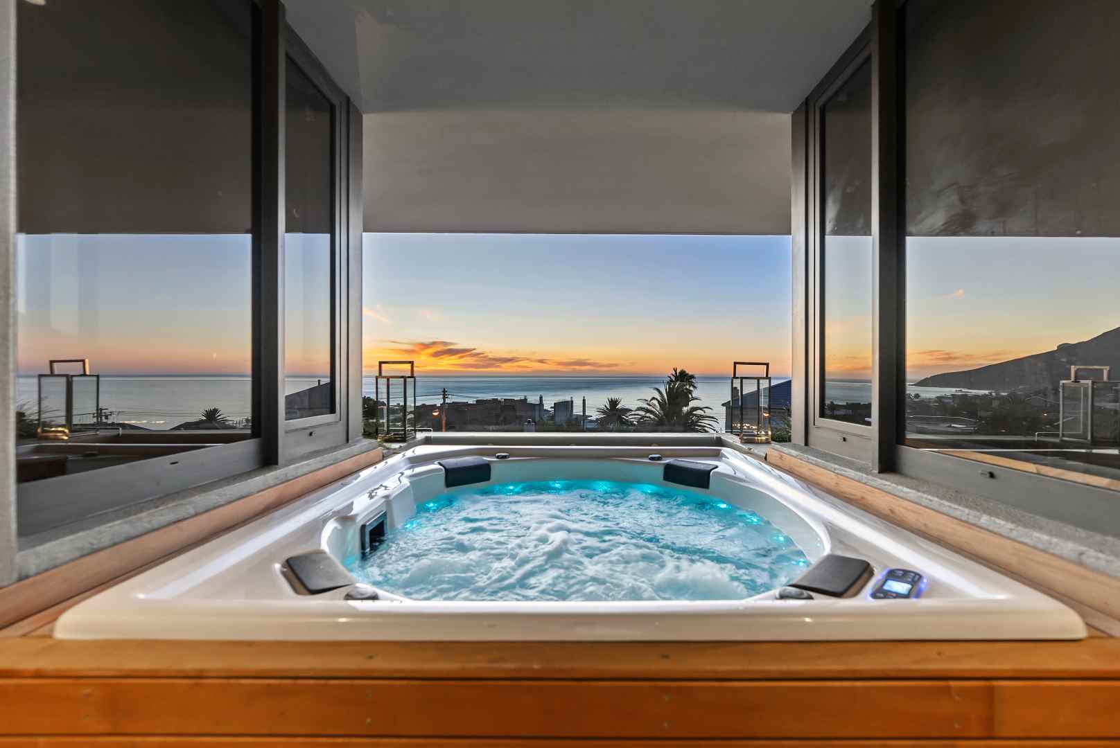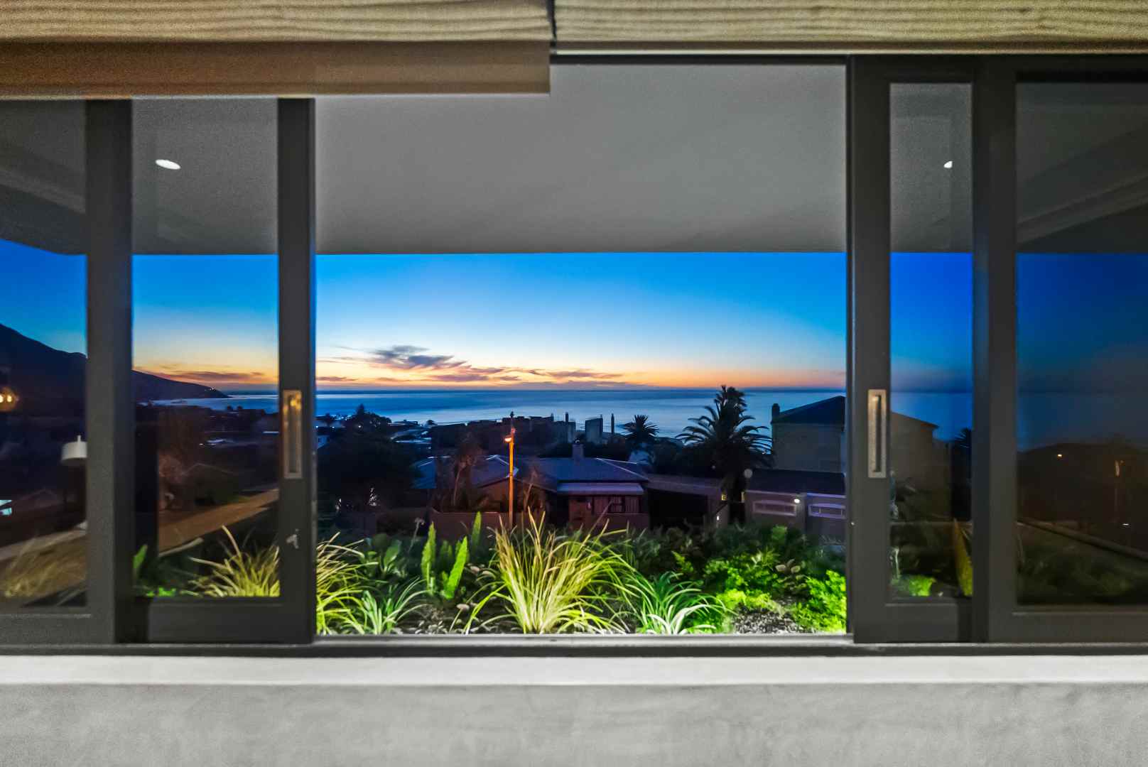Upon entering the home, you'll find yourself on the entry level, which features two spacious living areas seamlessly connected to an open-plan kitchen. This area flows effortlessly onto the entertainer's patio and pool area. The patio, located at the front of the house, is equipped with a built-in braai and provides ample room for both a lounge suite and a dining table. The pool is complemented by a side deck for sun loungers and is adorned with a charming Frangipani tree. With stunning views of the mountains and sea in the background, the patio offers a serene and peaceful retreat. Additionally, the front side of the house features a separate boma area, enhanced by ambient lighting and a Sonos sound system that transforms the atmosphere into something truly magical at night.