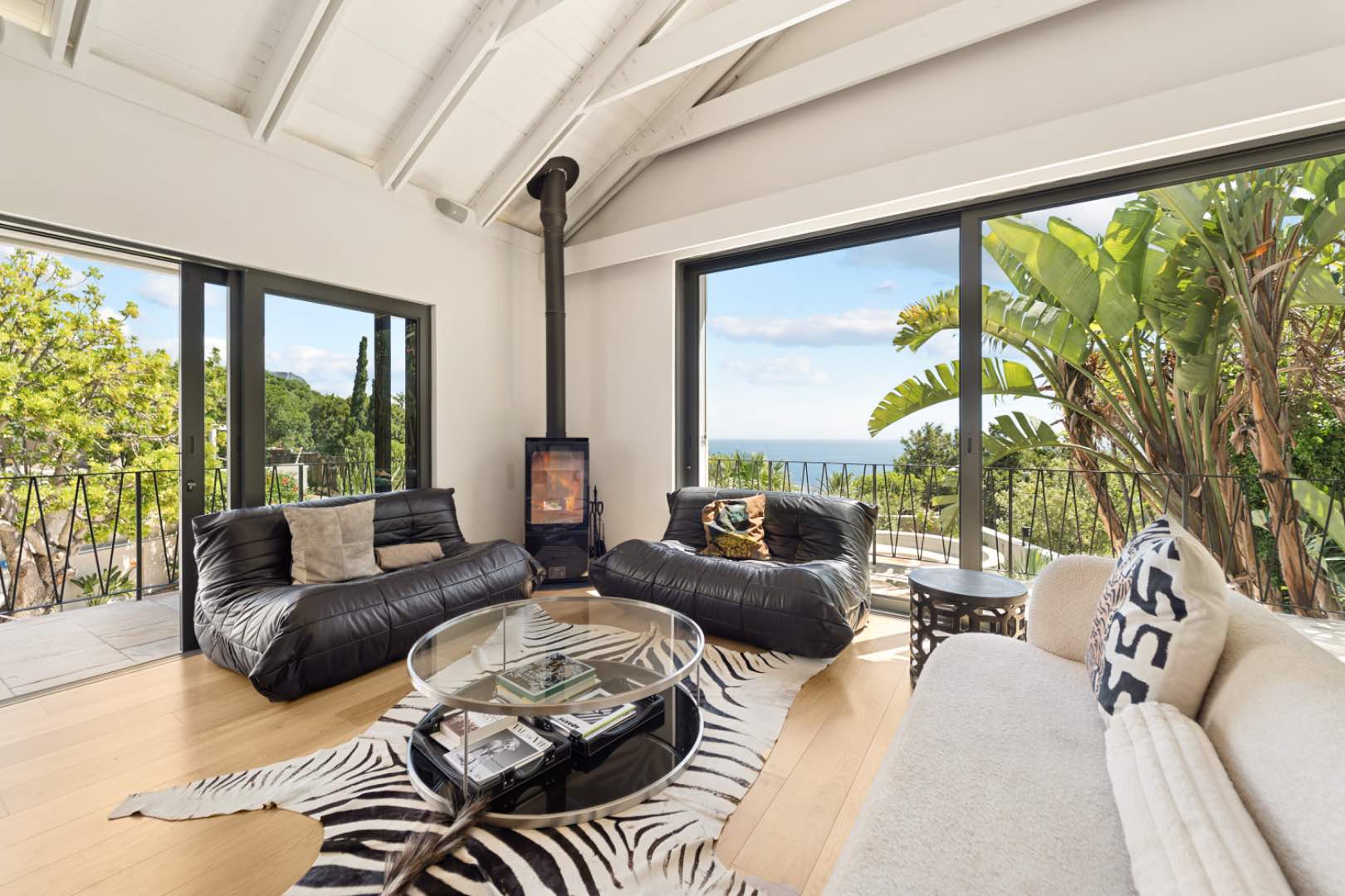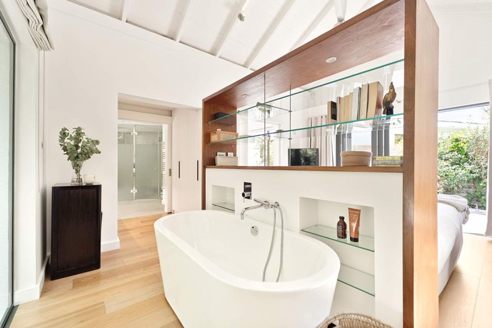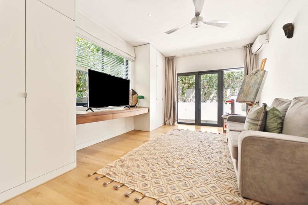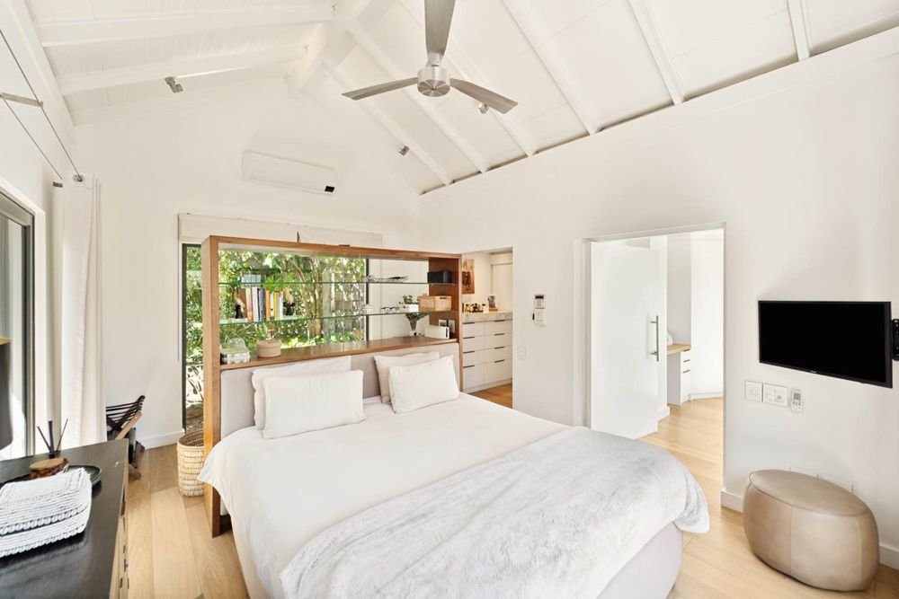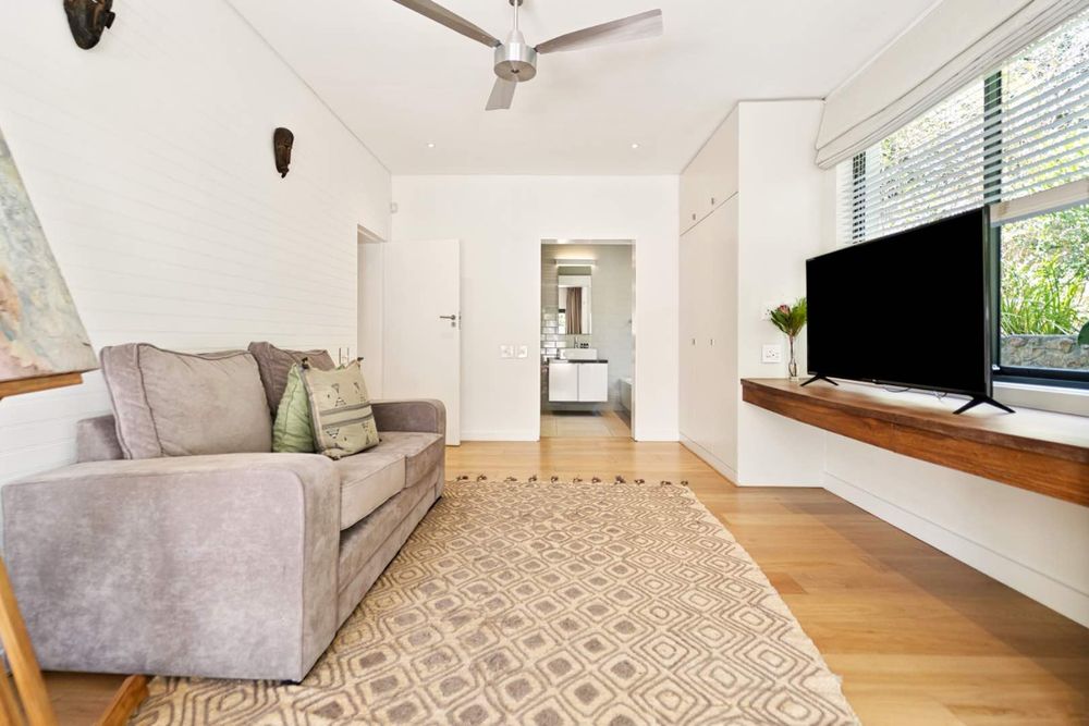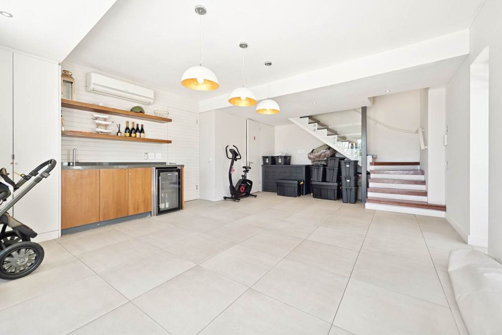 The main entrance of the house is on the second level, accessed through the front garden via a staircase. Double-volume ceilings with exposed trusses welcome you as you step into the open-plan living area featuring a dining room, lounge and, kitchen with a scullery. Glass doors surround the living area and slide open to connect with the outdoors, while the kitchen window frames Lion’s Head. The lounge features a slow combustion fireplace and overlooks the beach of Camps Bay. The entire upstairs is dedicated to comfort and sociable living with four bedrooms. The primary suite features a walk-in cupboard area, an en-suite bathroom and, a private courtyard. Three guest bedrooms, all leading on to the private back courtyard, complete the upper level. One of the guest bedrooms is en-suite while the other two share a well-appointed bathroom. There is also a guest toilet on this level for convenience.