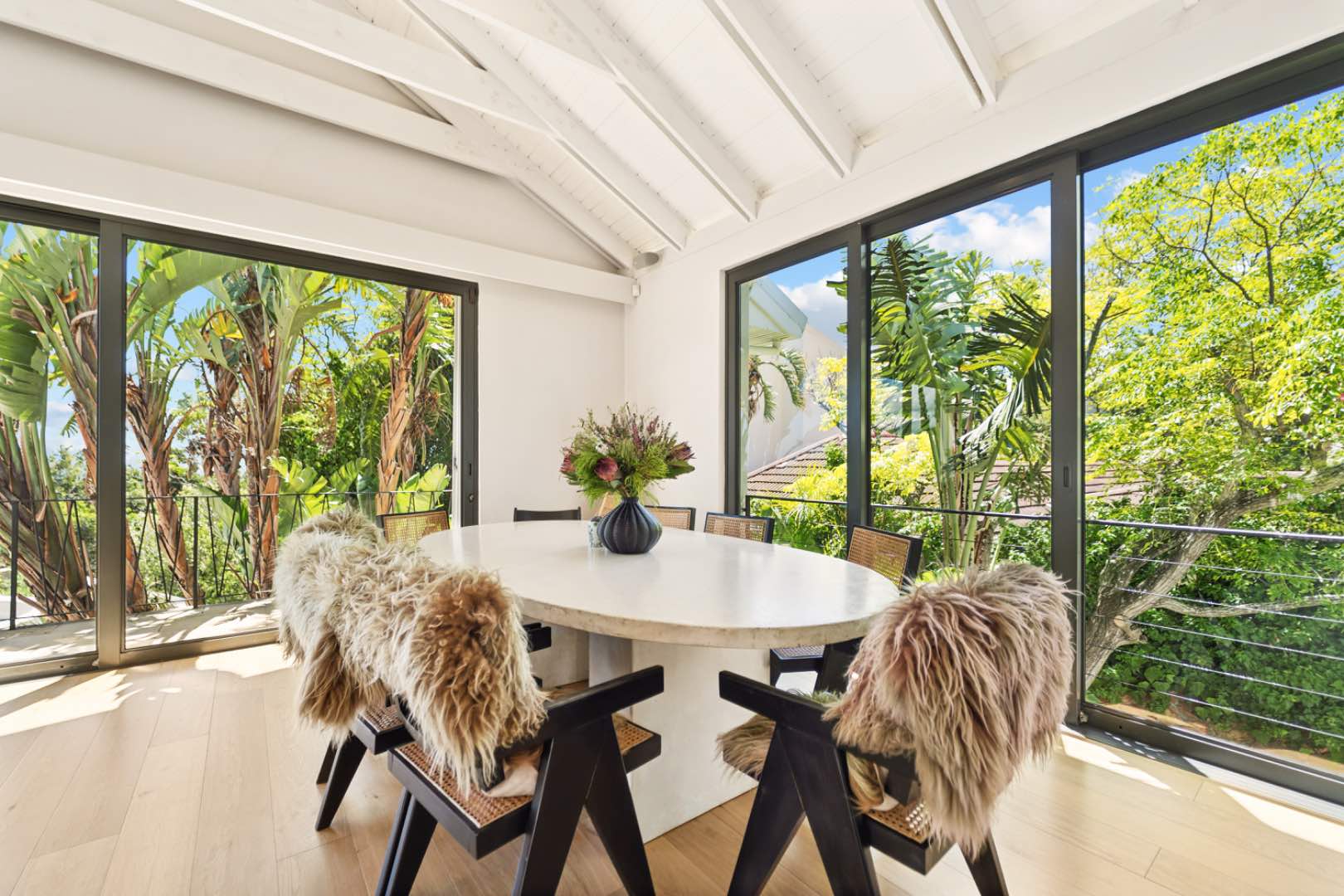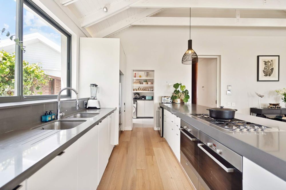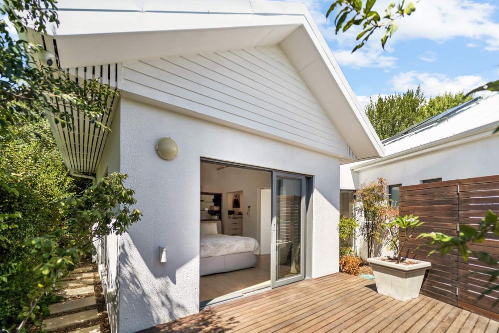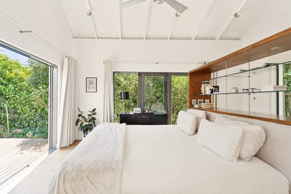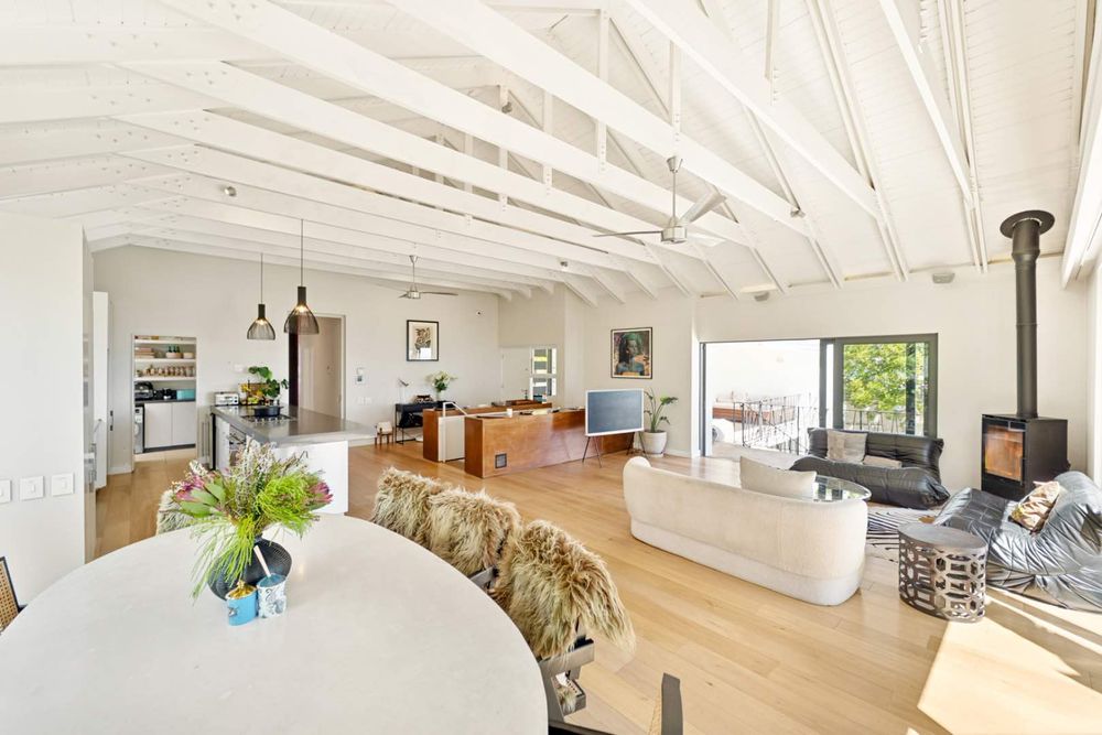 The main entrance of the house is on the second level, accessed through the front garden via a staircase. Double-volume ceilings with exposed trusses welcome you as you step into the open-plan living area featuring a dining room, lounge and, kitchen with a scullery. Glass doors surround the living area and slide open to connect with the outdoors, while the kitchen window frames Lion’s Head. The lounge features a slow combustion fireplace and overlooks the beach of Camps Bay. The entire upstairs is dedicated to comfort and sociable living with four bedrooms. The primary suite features a walk-in cupboard area, an en-suite bathroom and, a private courtyard. Three guest bedrooms, all leading on to the private back courtyard, complete the upper level. One of the guest bedrooms is en-suite while the other two share a well-appointed bathroom. There is also a guest toilet on this level for convenience.