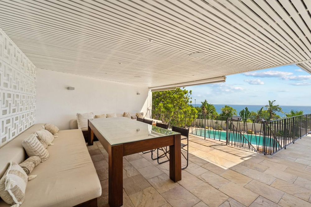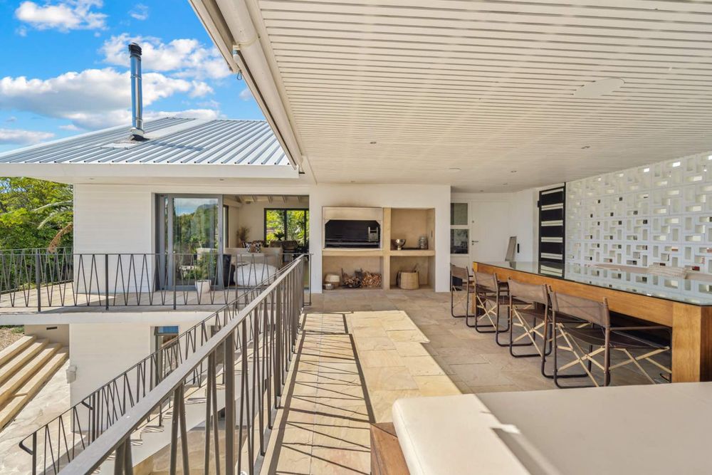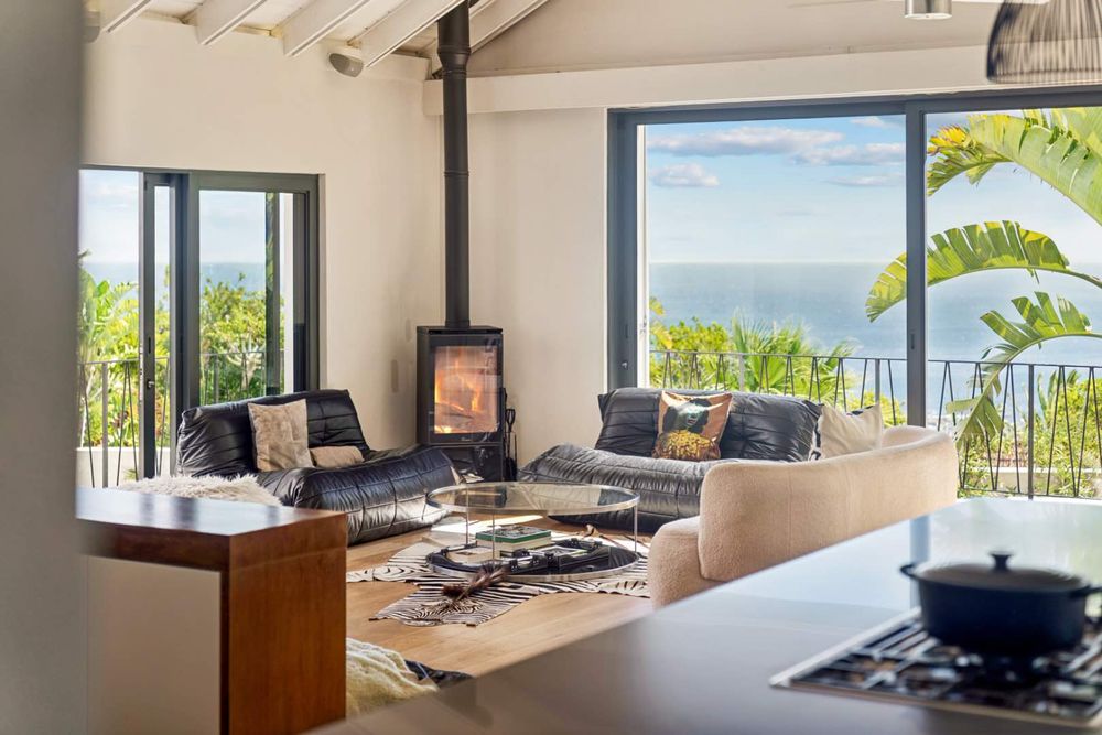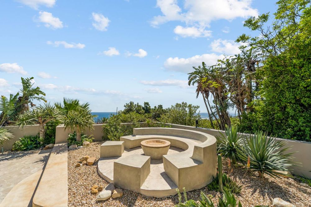 From the living area, step onto a covered terrace with a built-in braai and dining area that overlooks the ocean, the front garden and, a newly completed pool, complimented by a boma fire-pit area. The garden is well established with waterwise plants.