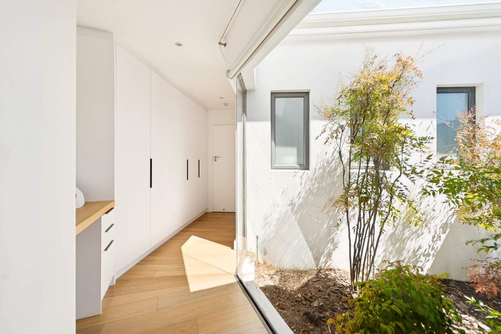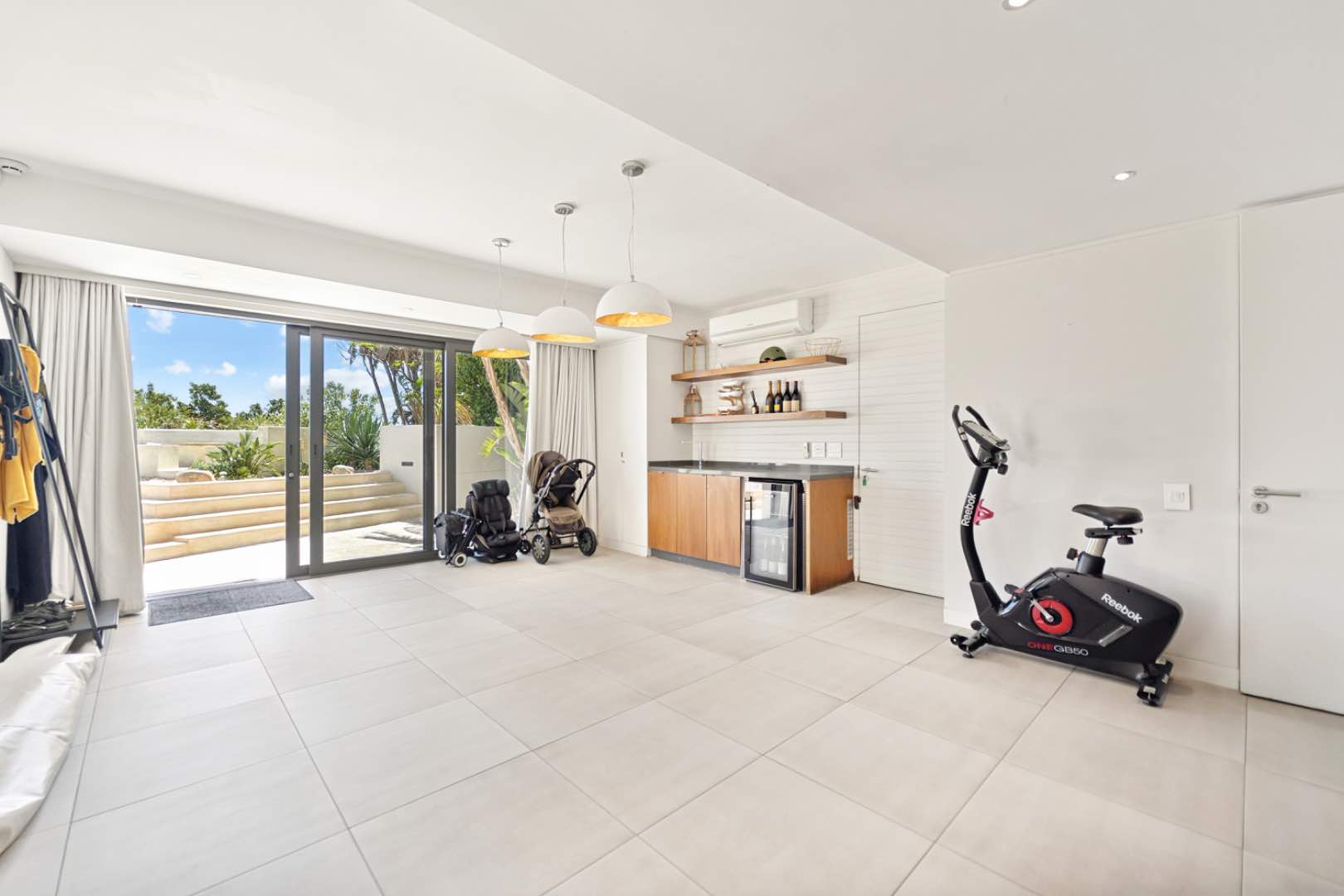 A staircase from inside the living area leads downstairs to a versatile space featuring a bar area and a guest toilet. This room is ideal as a spa or entertainment room, as glass doors lead out to the front garden with the inviting pool.