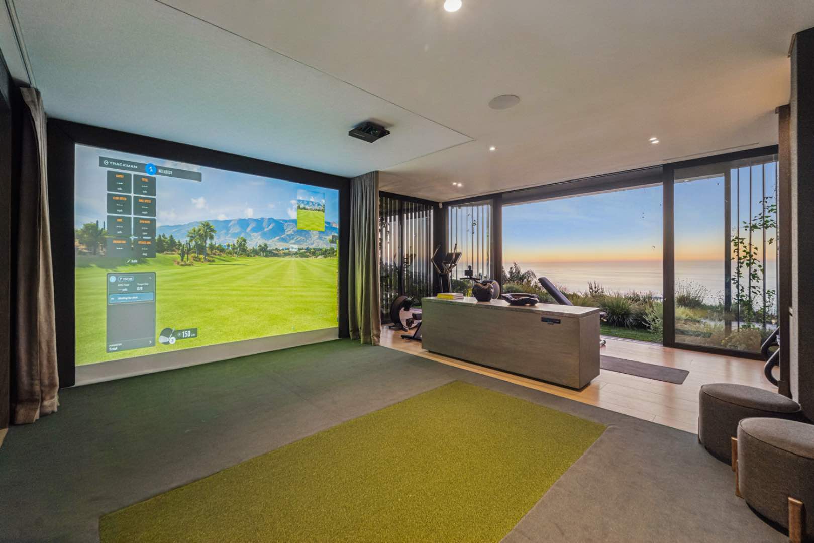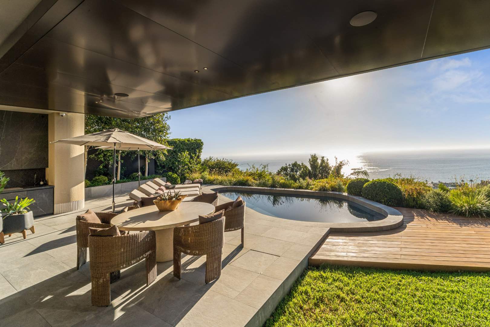 The ground level is dedicated to leisure and entertainment, featuring a temperate controlled 1000 bottle, open display wine cellar and a perfectly position bar/dining counter, TV lounge, private office, guest toilet, built-in coffee station, gym and, golf simulator room. This level flows directly onto the landscaped garden and timber entertainment deck with heated reinforced concrete pool and boma fire pit. From here, the views are exceptional — stretching across Camps Bay and the Atlantic, with Lion's Head to the right and the majestic Twelve Apostles to the left.