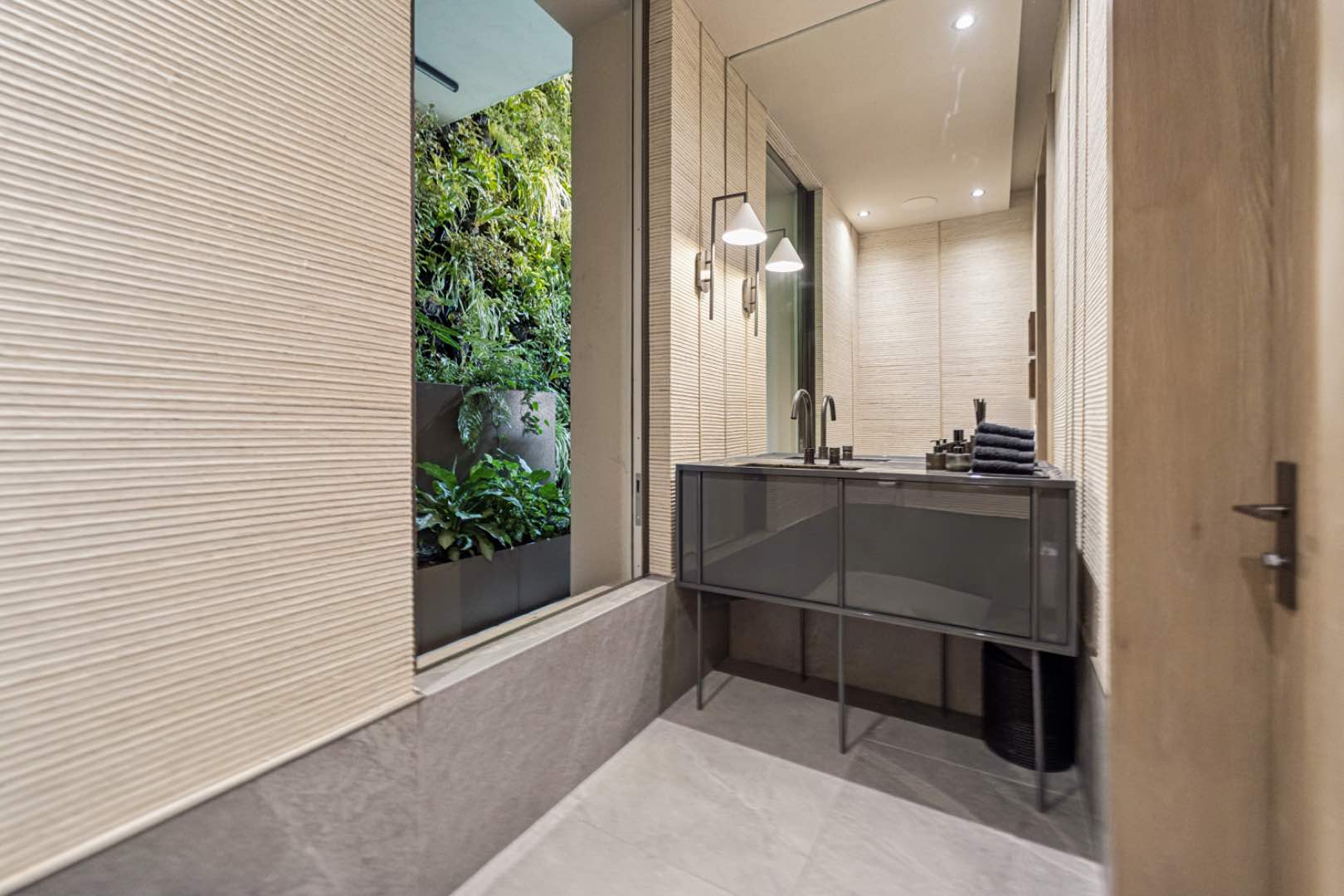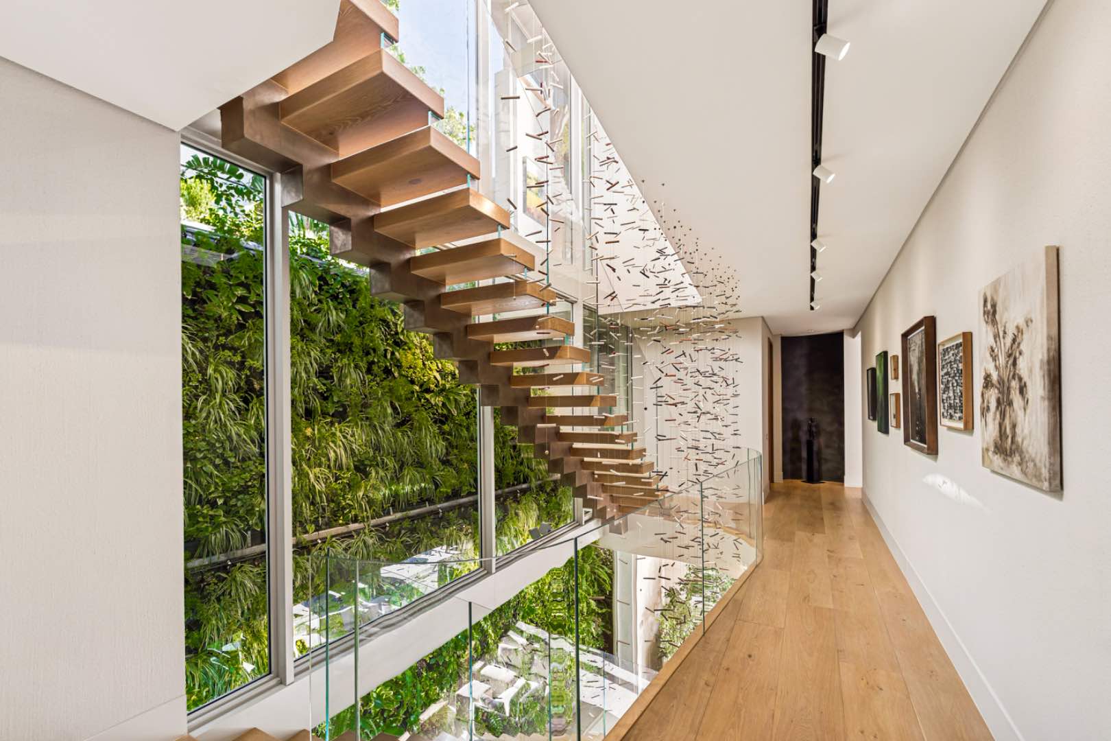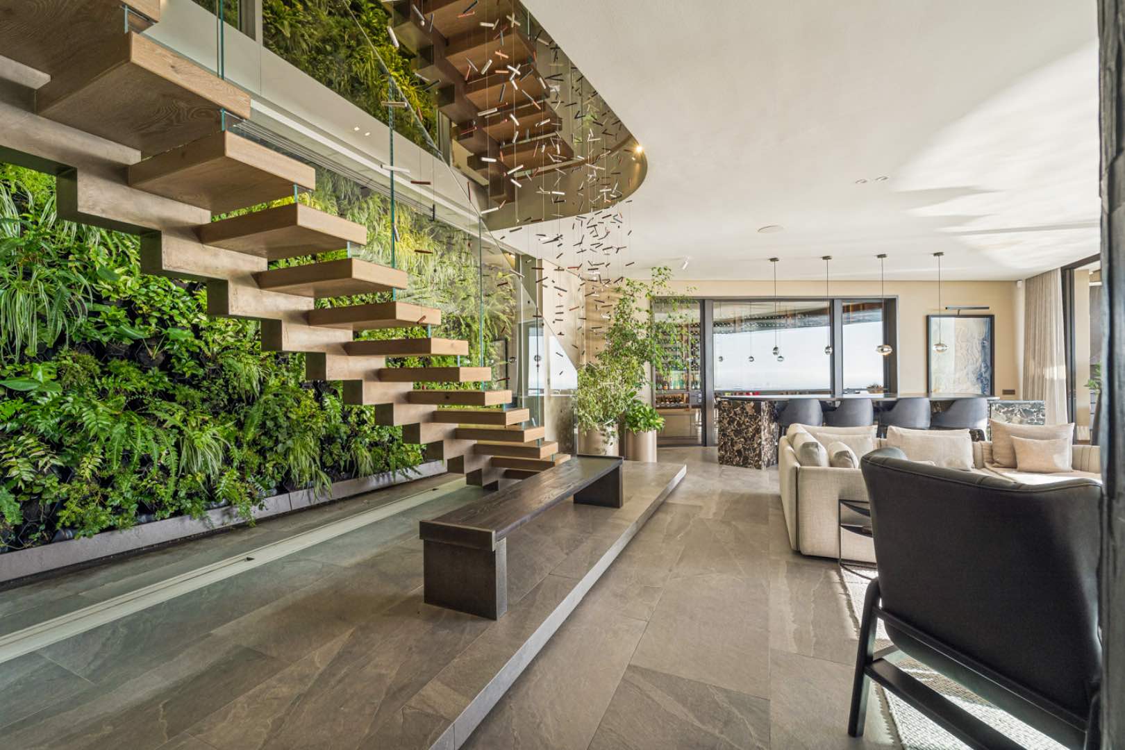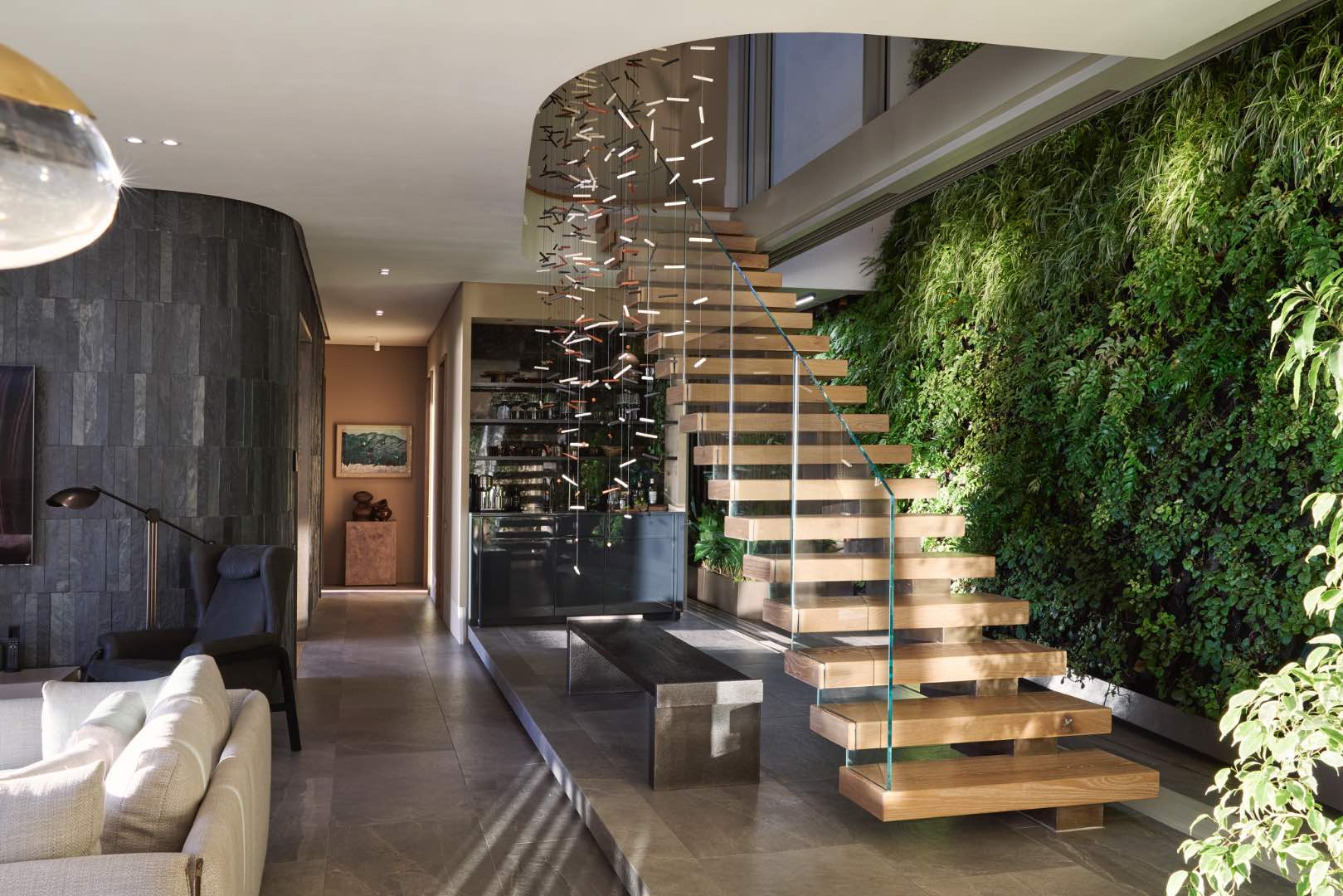 The level below hosts 4 luxurious en-suite bedrooms. 3 of the bedrooms are north west facing, while the 4th is uniquely set within a tranquil, forest-like environment. Each suite includes a walk-in closet and underfloor-heated bathrooms. There is also a laundry room on this level for practical ease. Alongside the floating staircase that connects all 3 levels, a dramatic live garden wall rises two storeys, reinforcing the home’s strong biophilic design.