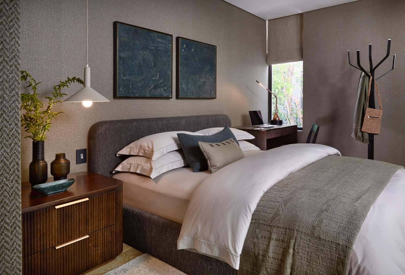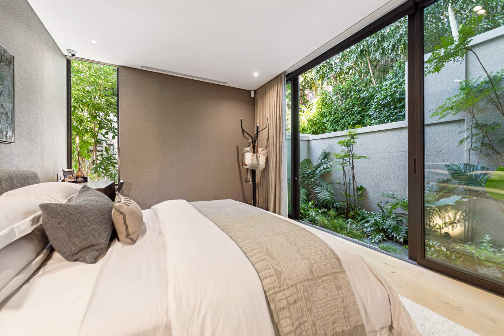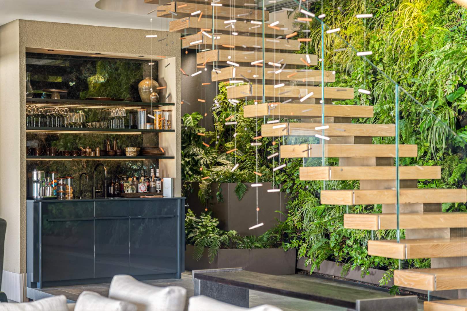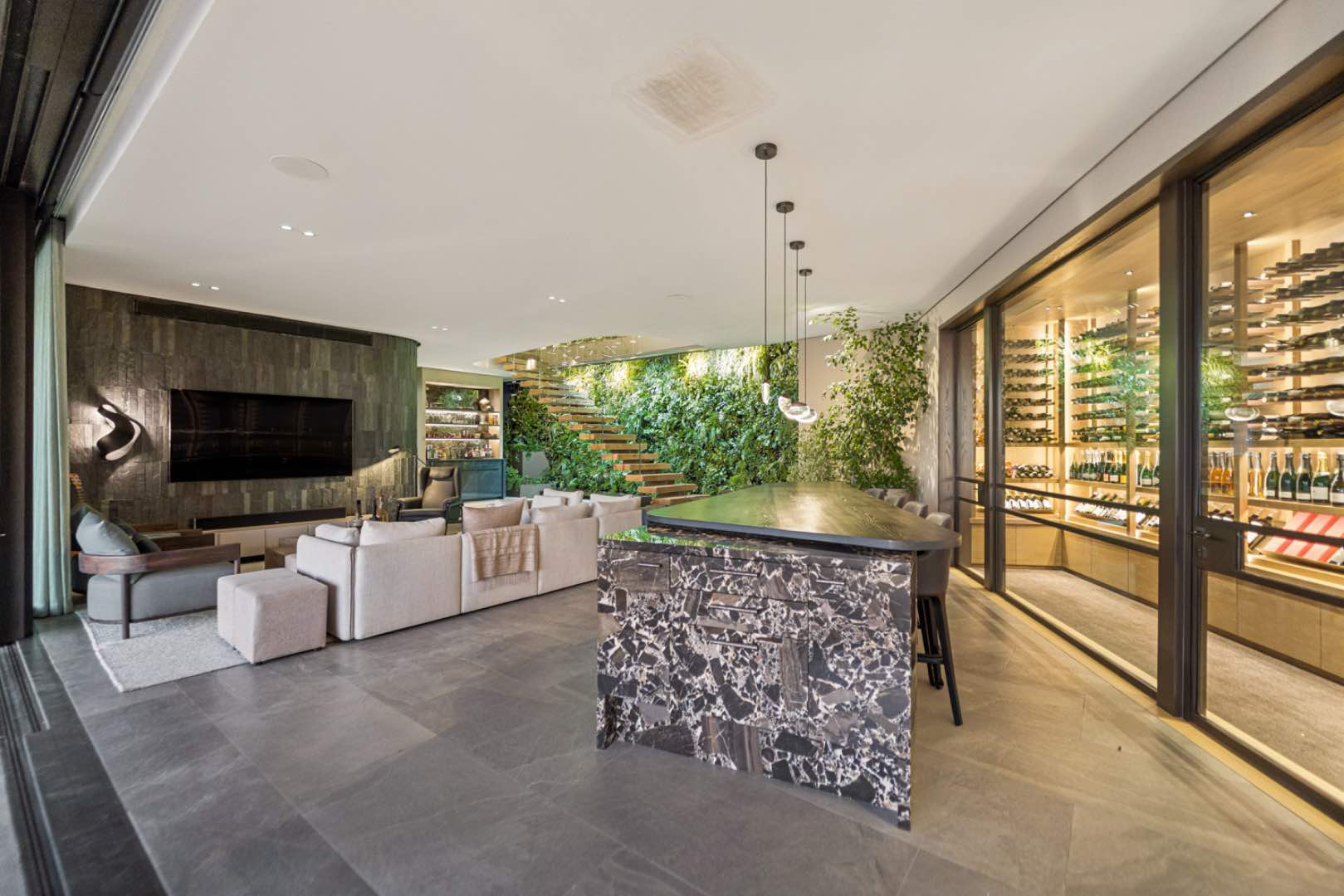 The level below hosts 4 luxurious en-suite bedrooms. 3 of the bedrooms are north west facing, while the 4th is uniquely set within a tranquil, forest-like environment. Each suite includes a walk-in closet and underfloor-heated bathrooms. There is also a laundry room on this level for practical ease. Alongside the floating staircase that connects all 3 levels, a dramatic live garden wall rises two storeys, reinforcing the home’s strong biophilic design.