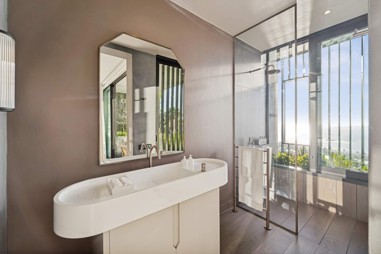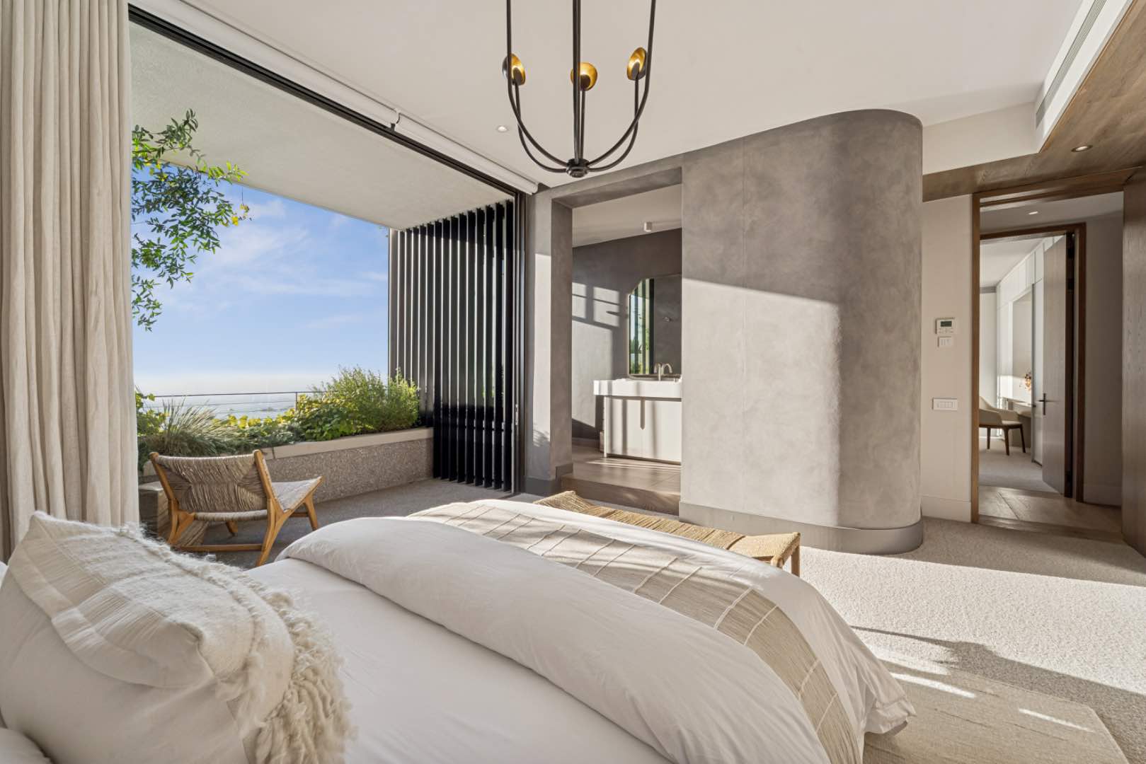 The arrival experience immediately sets the tone. A striking front entrance framed by large boulders of organic stone walls creating a sense of permanence and quiet luxury, echoing the rugged landscape beyond. As the large glass entrance door opens you are greeted by the azure waters of Camps Bay with its infamous palm fringed beach. This home reveals exceptional craftsmanship — from sweeping curved glass and softly sculpted walls to dramatic double-volume door frames. The finesse of the layered finishes and lighting is truly magnificent.