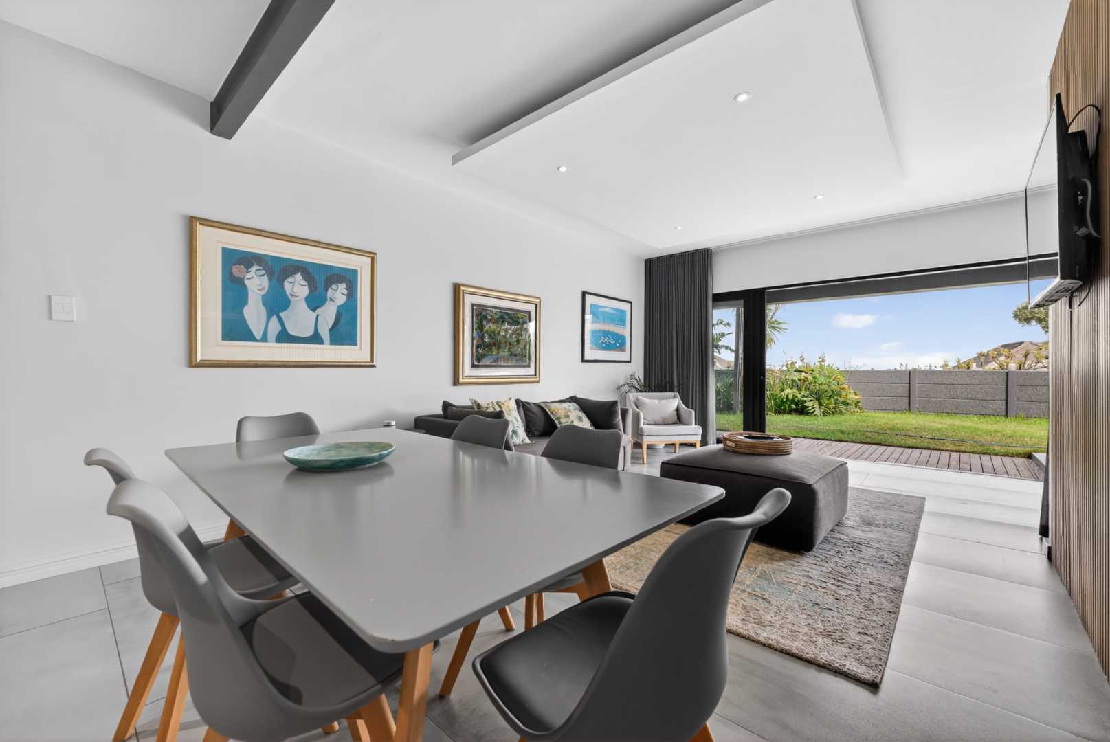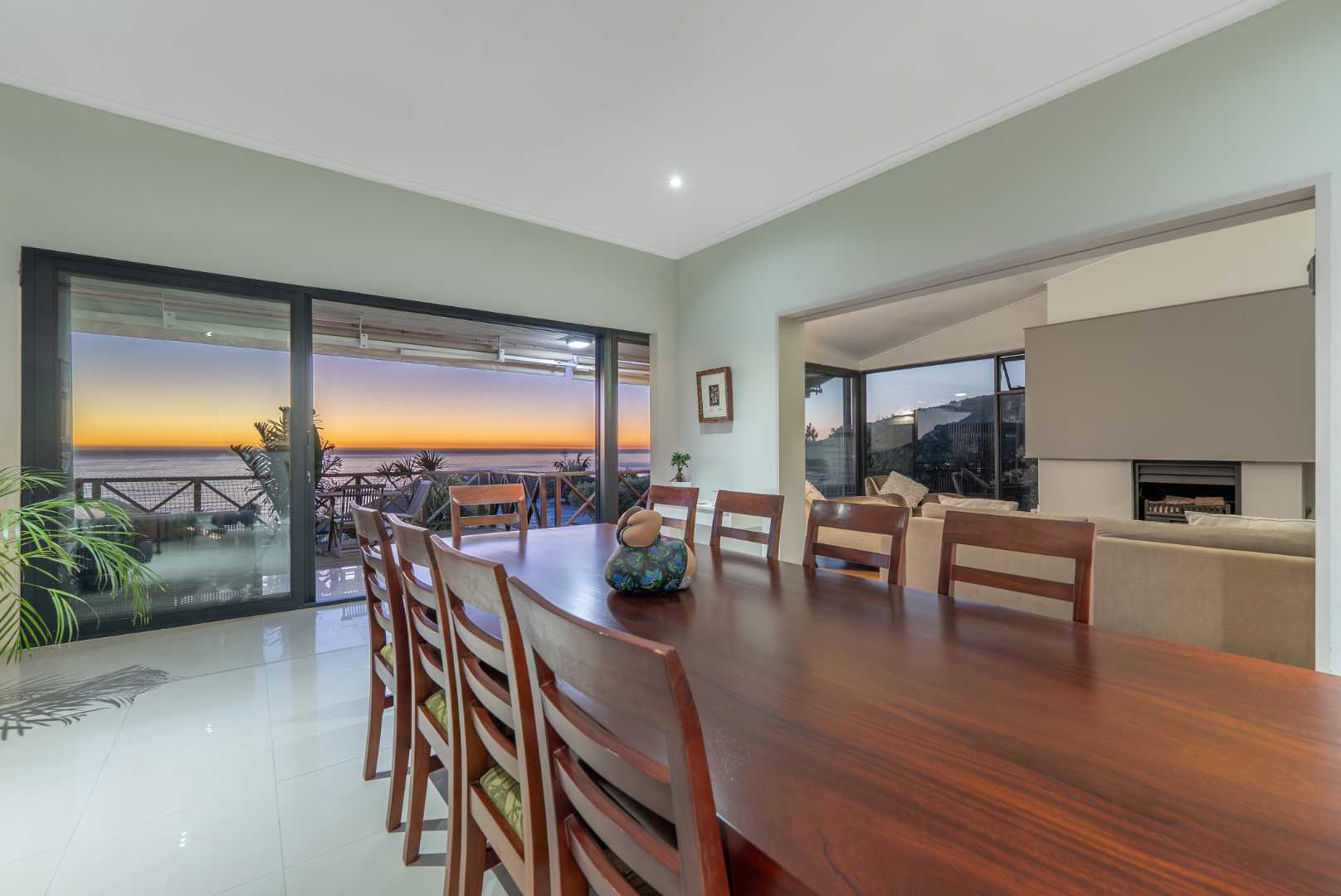 The semi-separate dining area flows into a spacious lounge with a wood-burning fireplace, both opening through floor-to-ceiling stacker doors onto a large, partially covered deck with retractable awning—perfect for enjoying the sea views and entertaining.