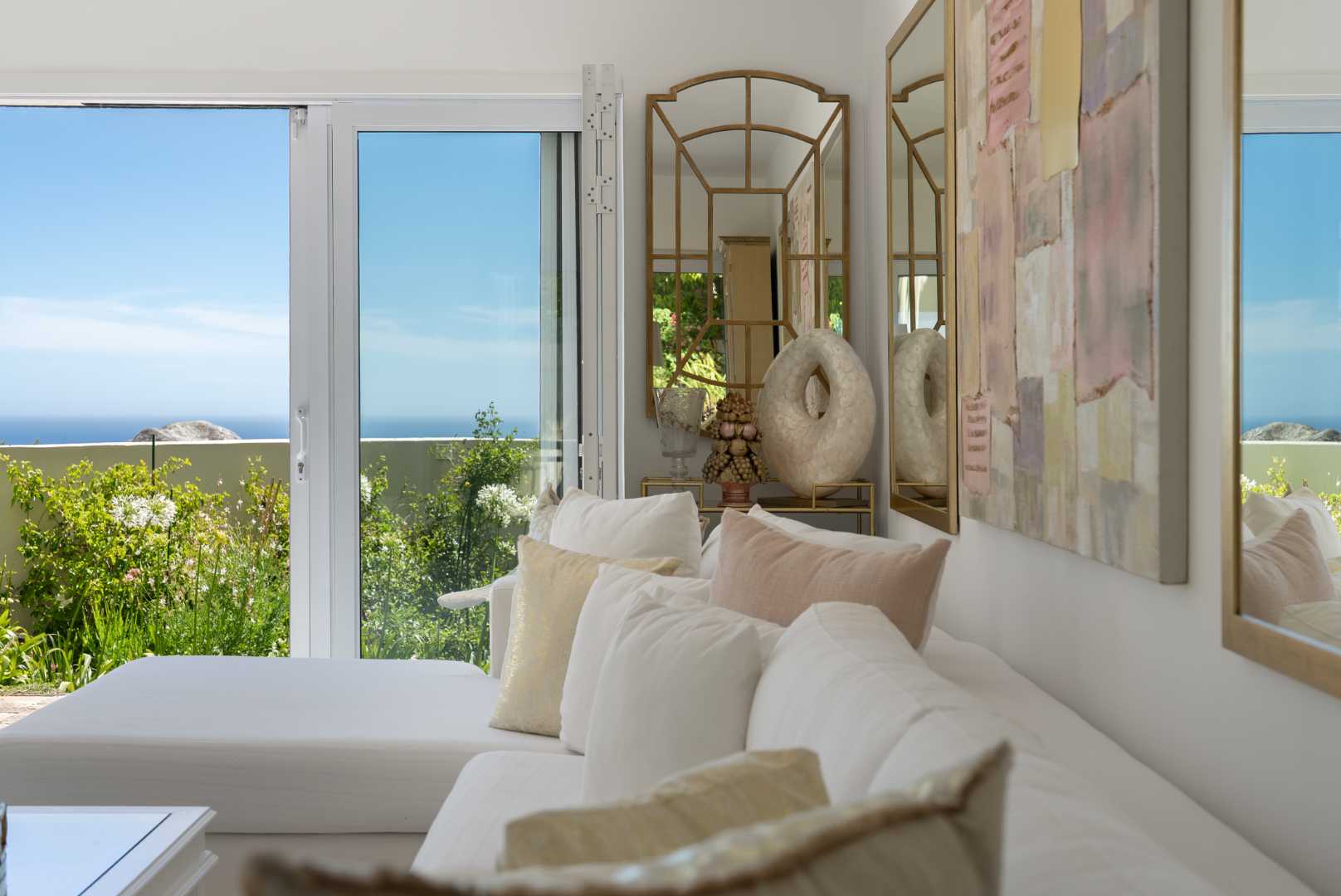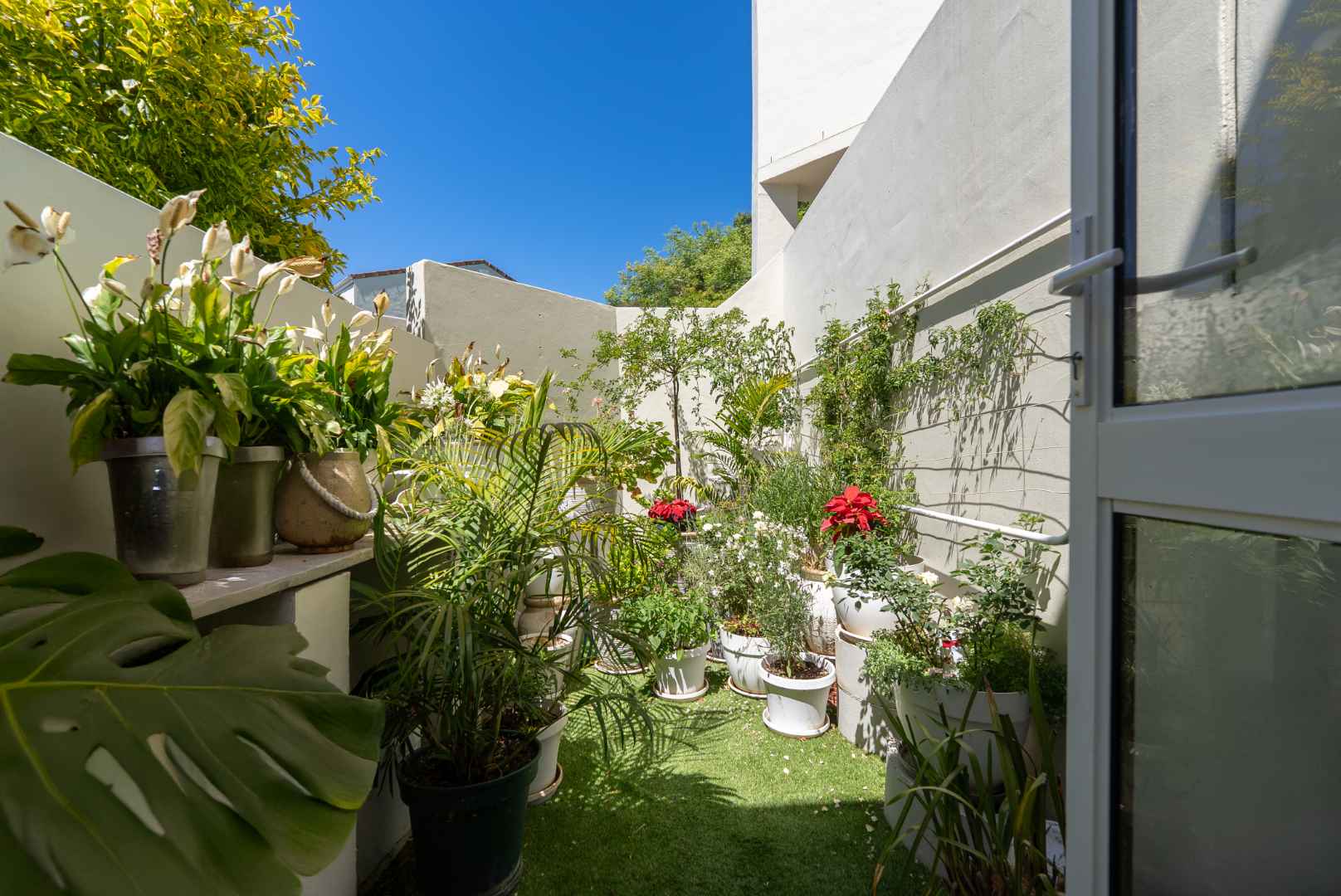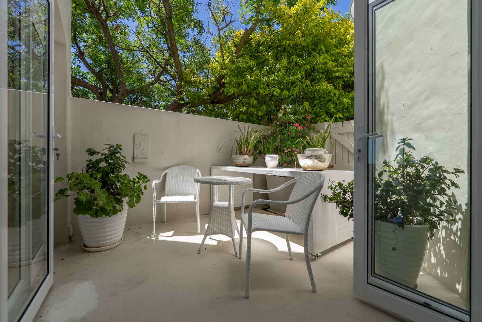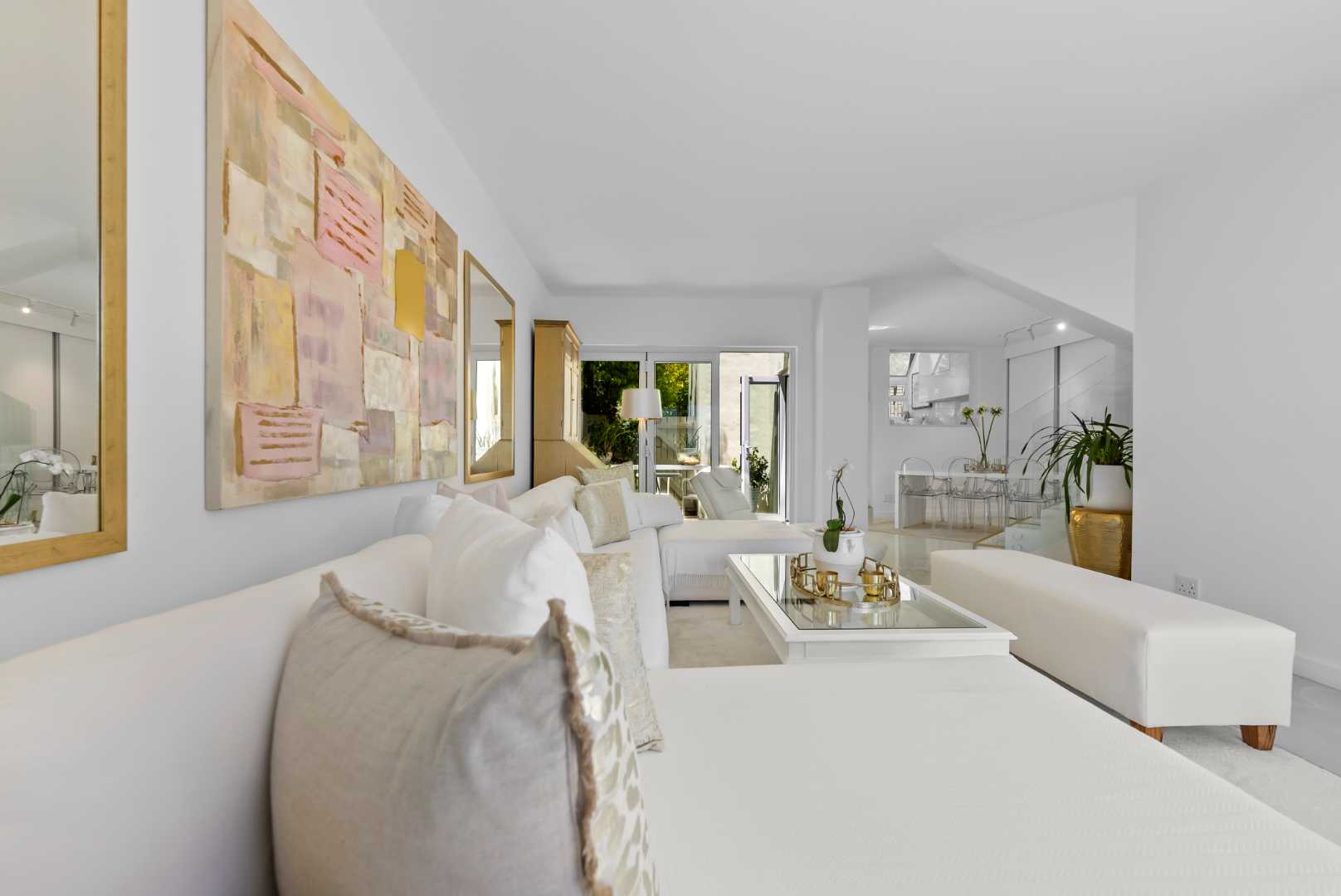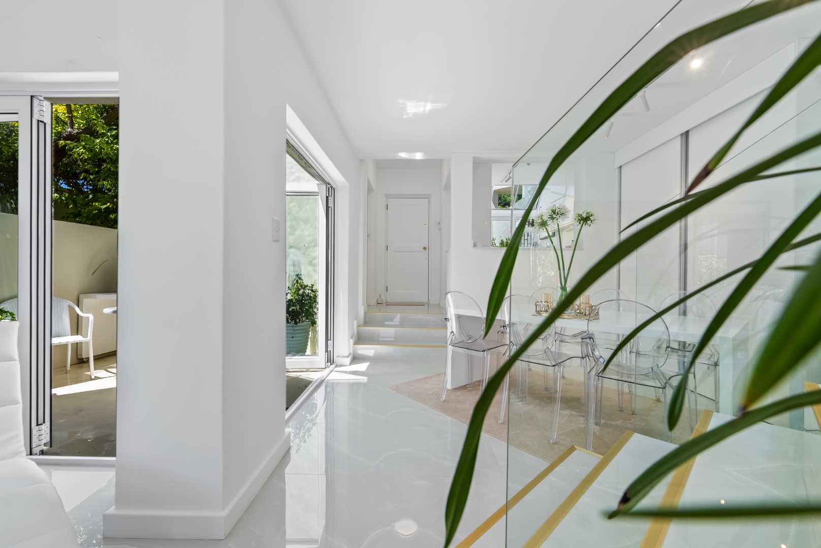 The townhouse-style apartment has been thoughtfully updated, with a clean, understated finish and a layout that prioritises light and flow. Large windows frame mountain and sea views, while the open-plan living and dining area opens onto a private garden, creating a practical indoor-outdoor connection.