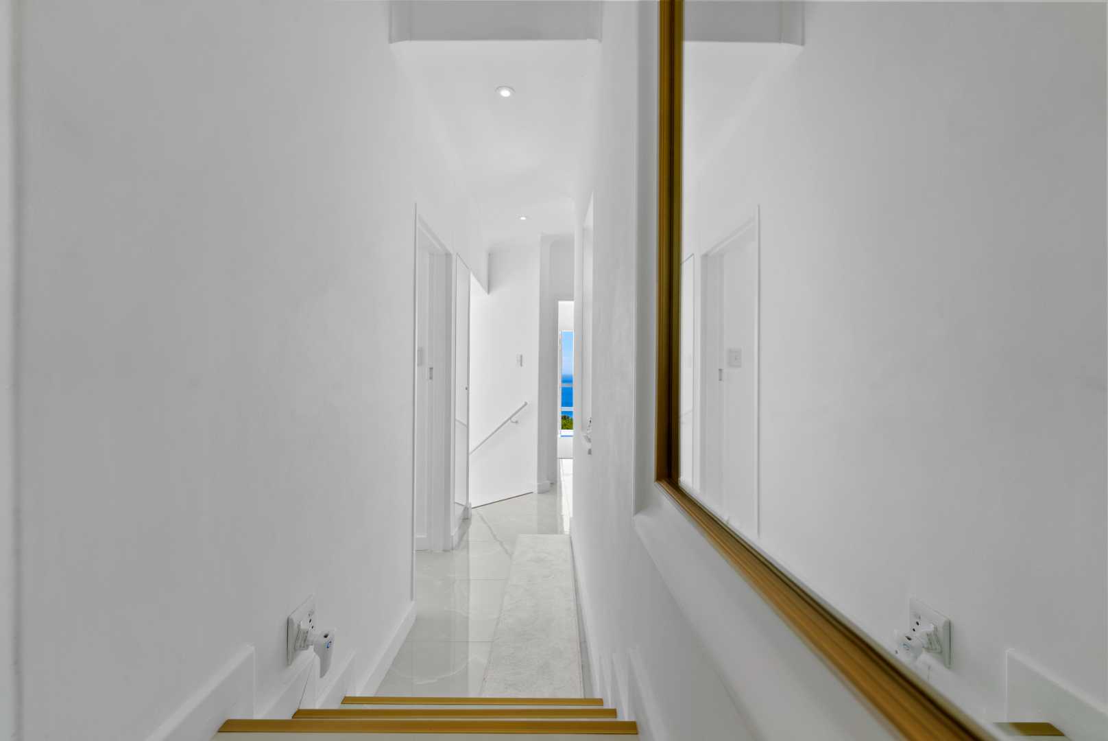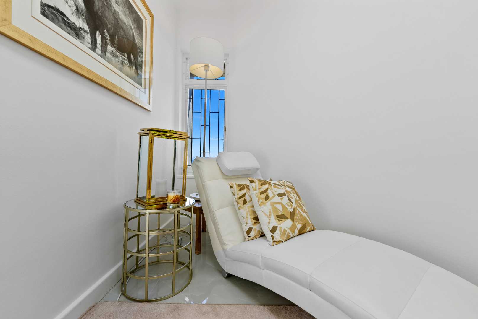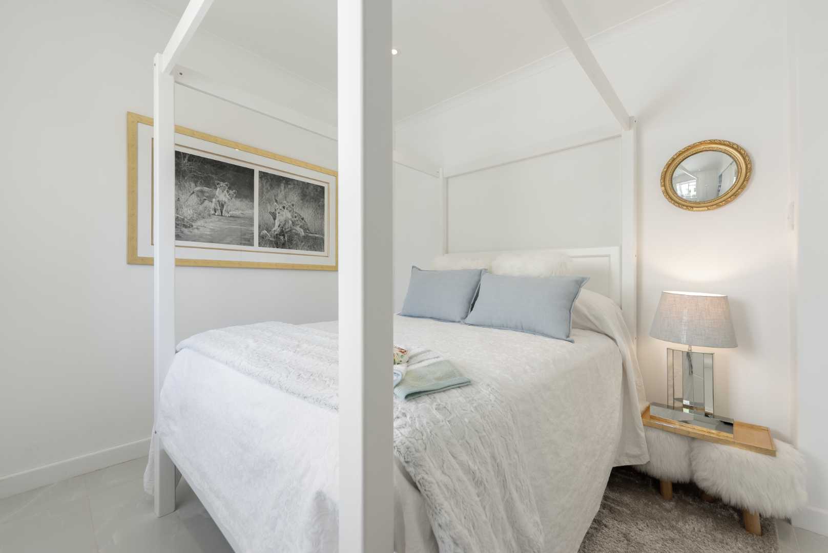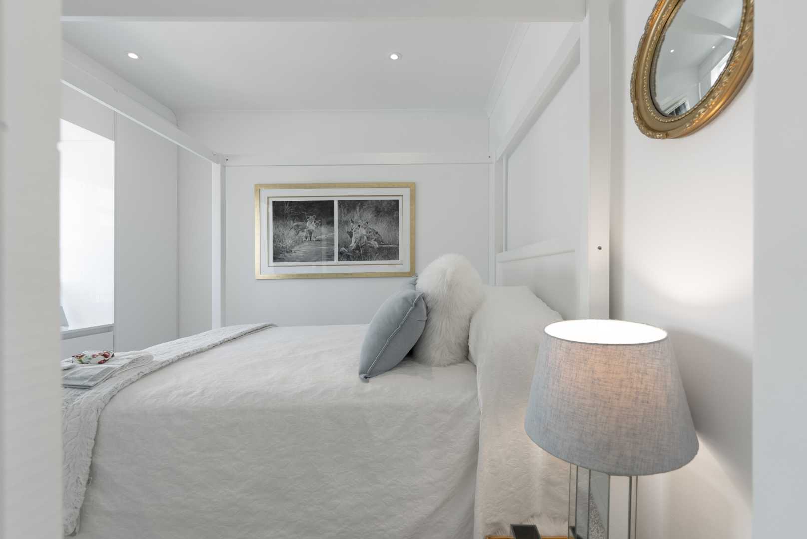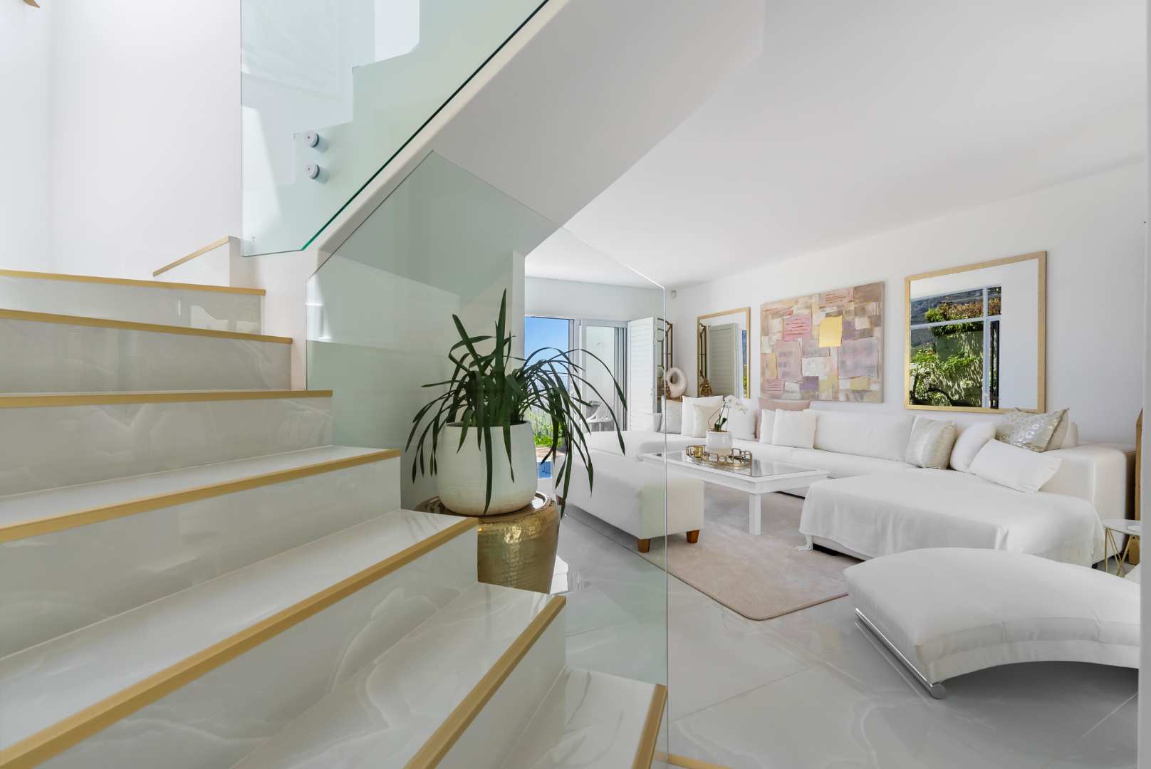 The townhouse-style apartment has been thoughtfully updated, with a clean, understated finish and a layout that prioritises light and flow. Large windows frame mountain and sea views, while the open-plan living and dining area opens onto a private garden, creating a practical indoor-outdoor connection.