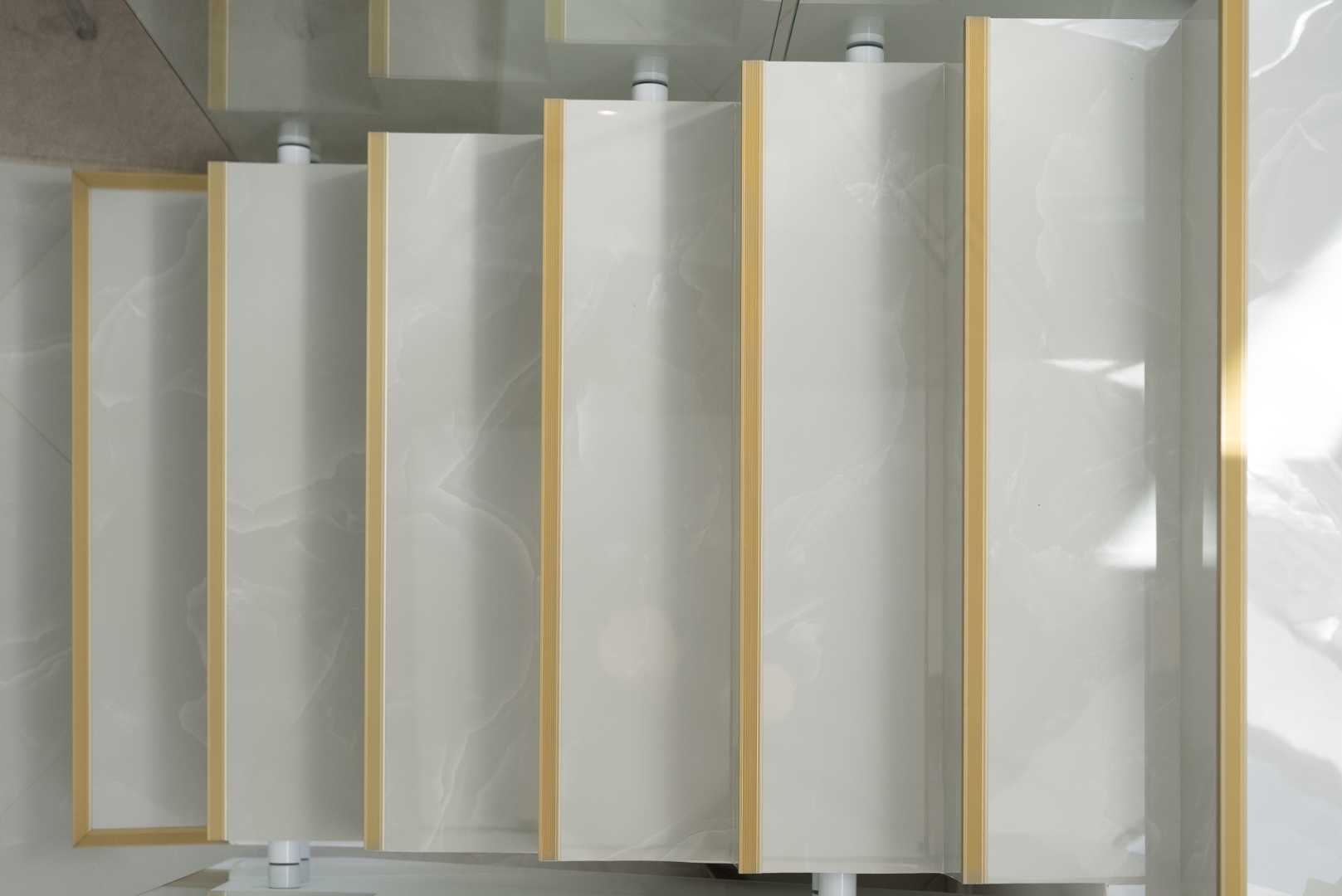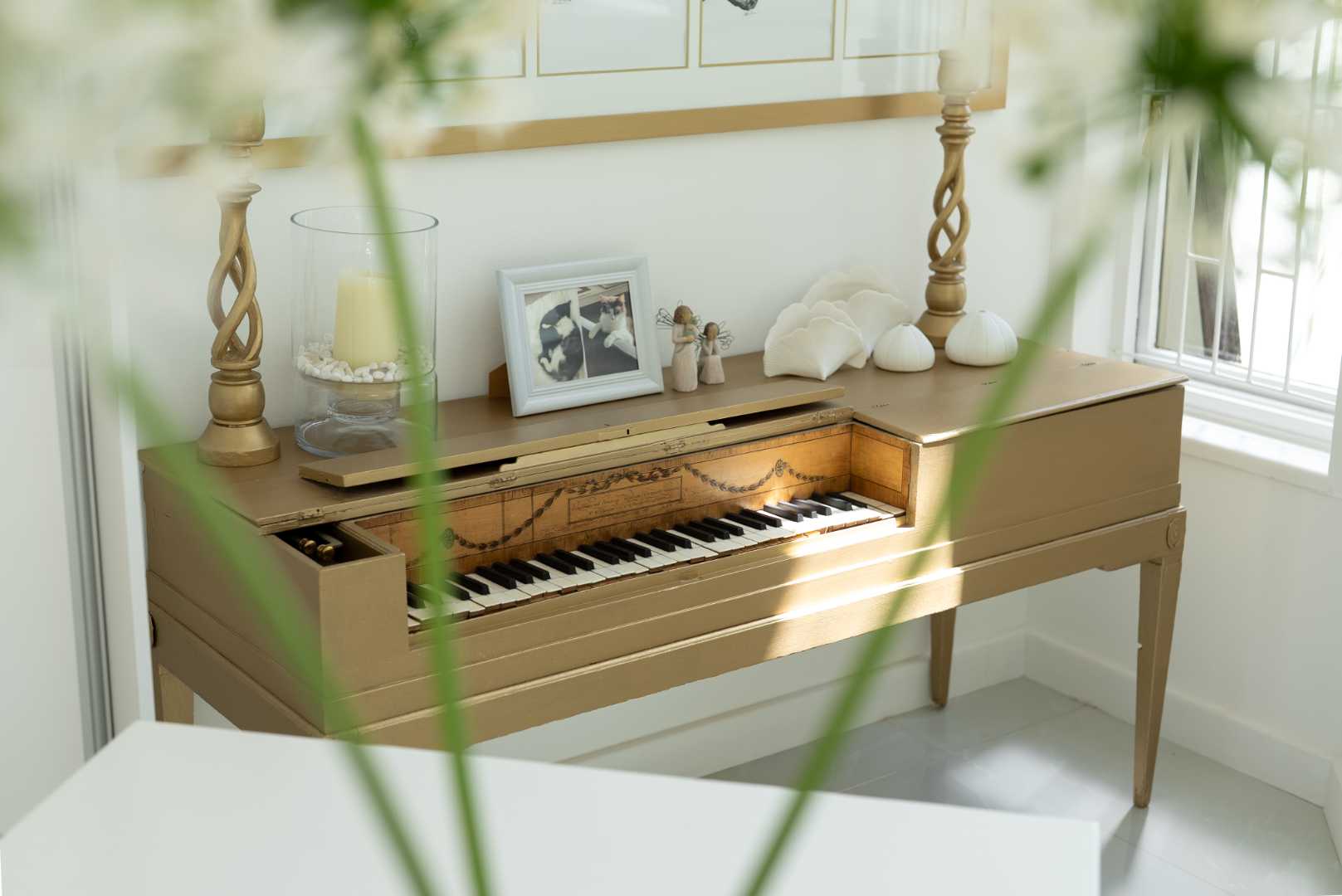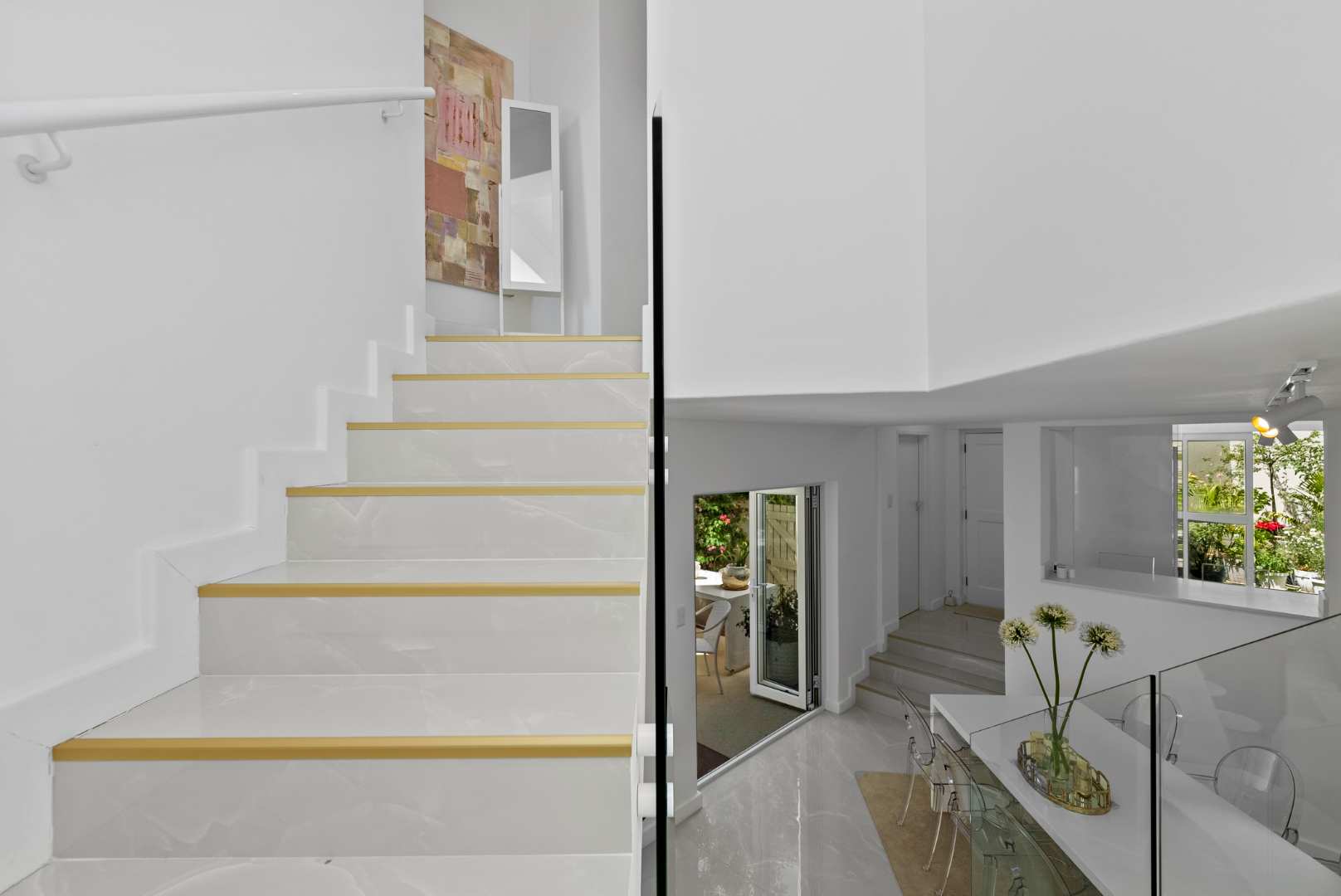 The kitchen is light and functional, with a small patio leading off the space, allowing for additional natural light and ventilation. The redesigned staircase improves circulation through the home and creates a more open feel between levels.