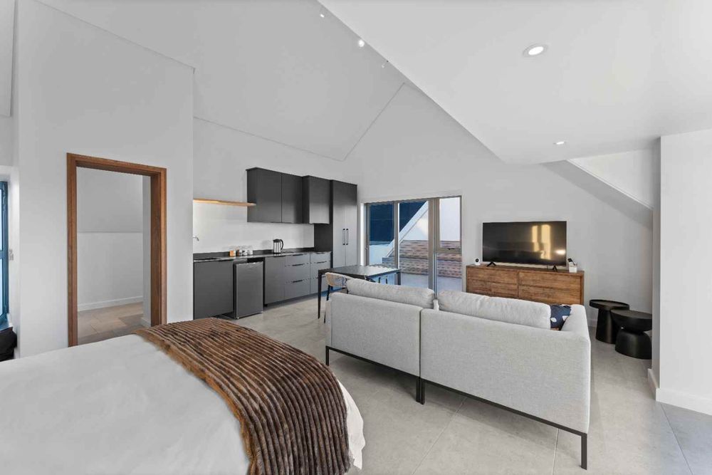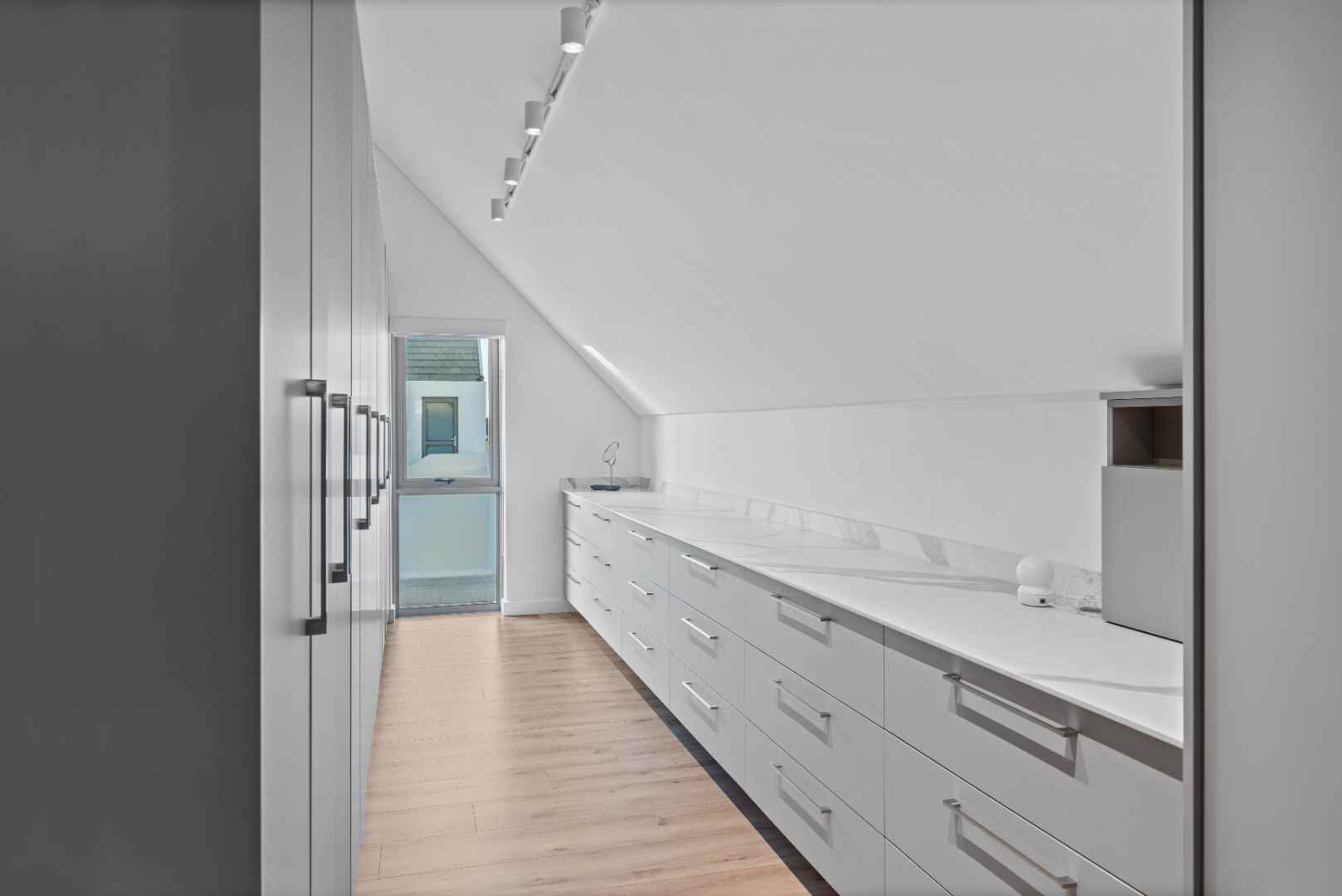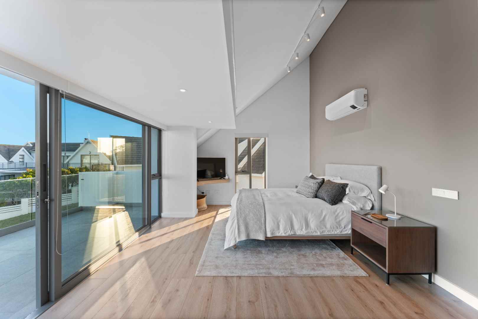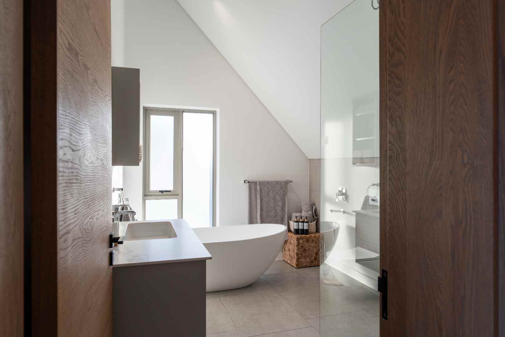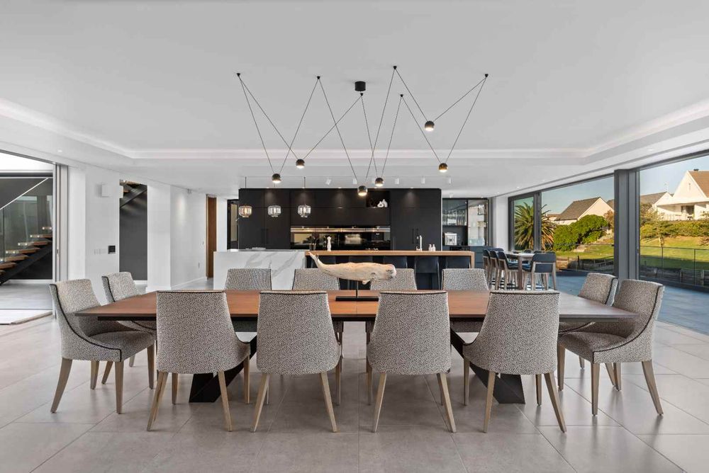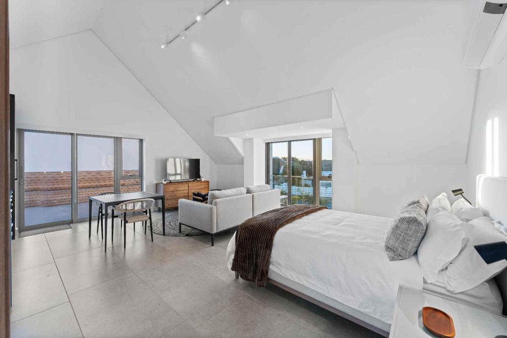 The open-plan kitchen, dining, and living area is anchored by high ceilings and clean architectural lines, opening onto a wind-sheltered outdoor space with pool. Three bedrooms are located on the ground floor, while upstairs offers a second lounge, an expansive primary suite with balcony and canal views, and another large en suite bedroom.