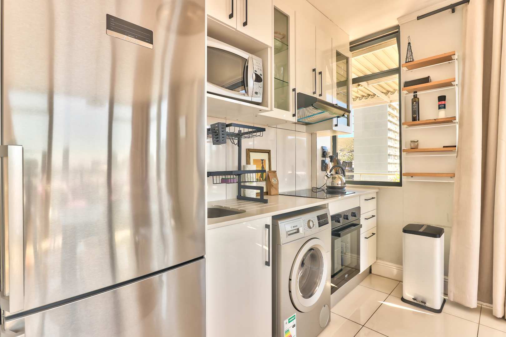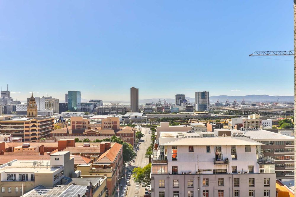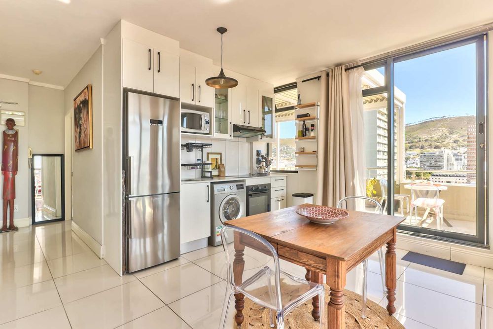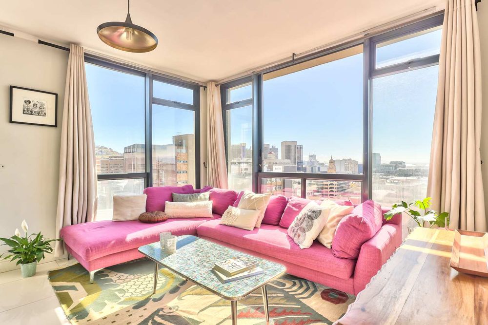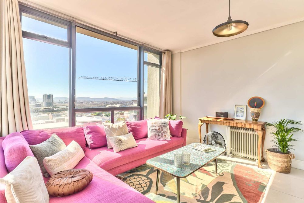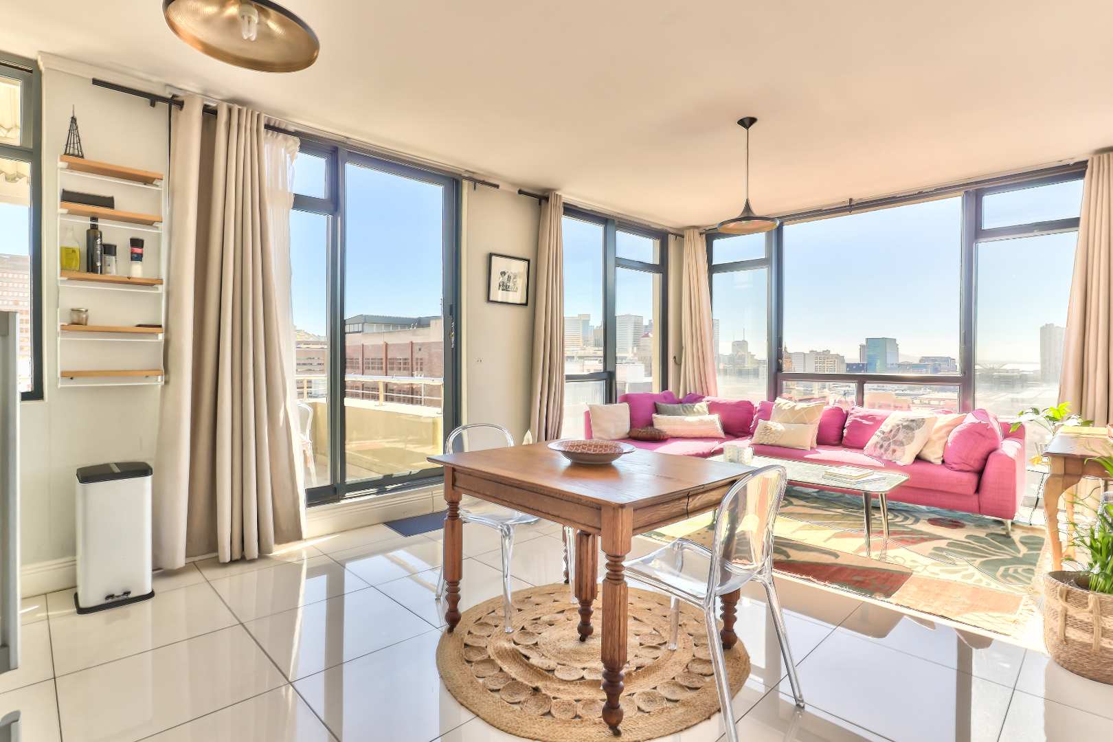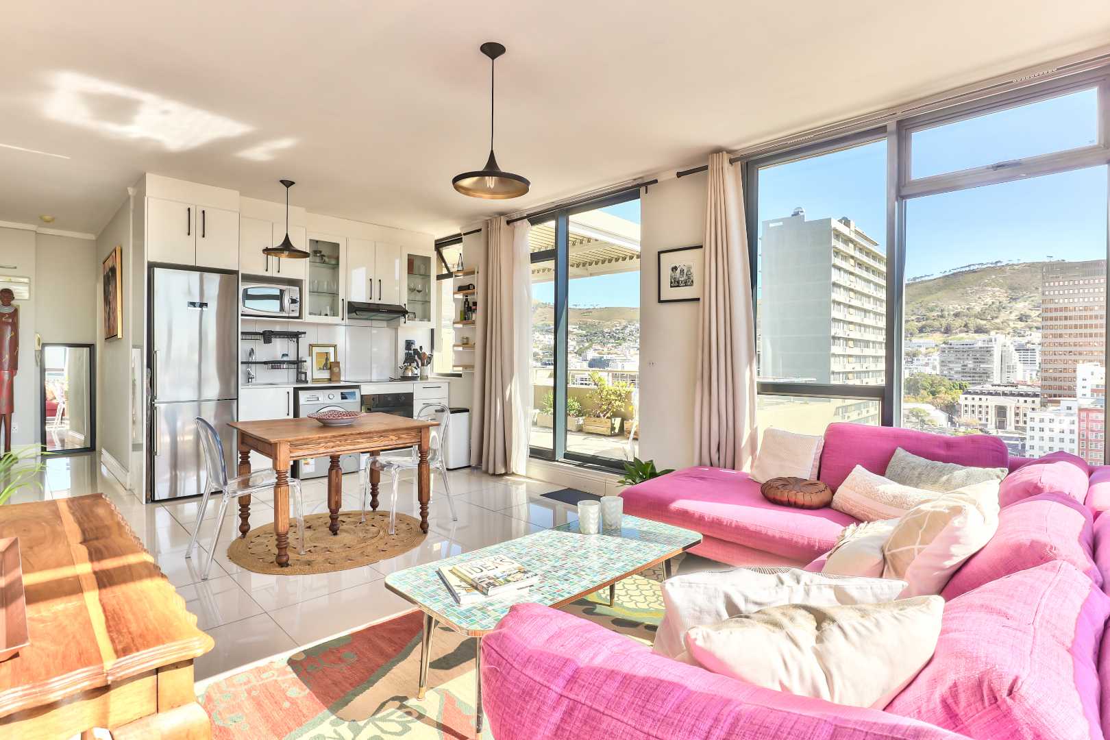 Open plan kitchen and lounge with north facing light overlooking the city