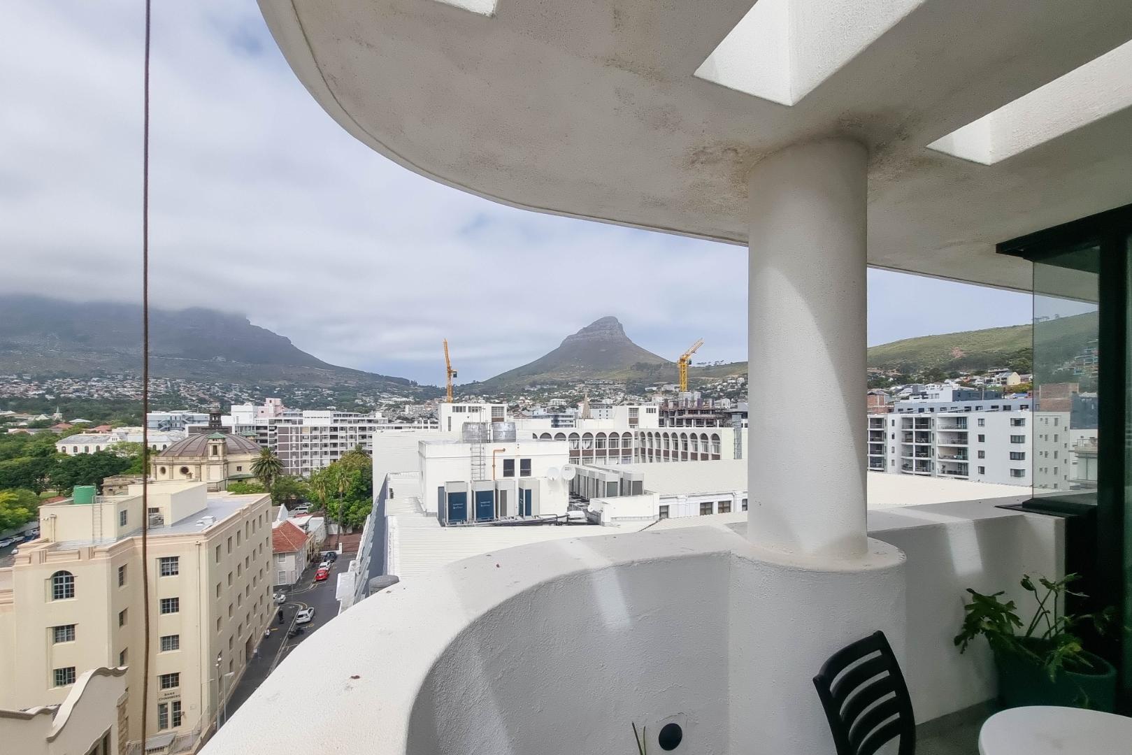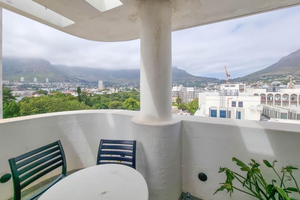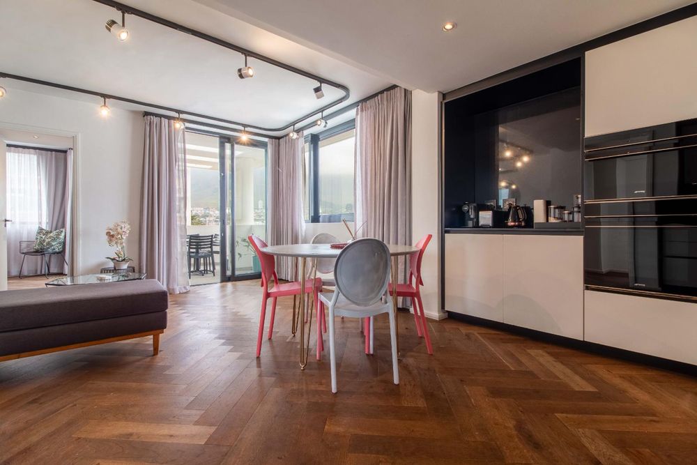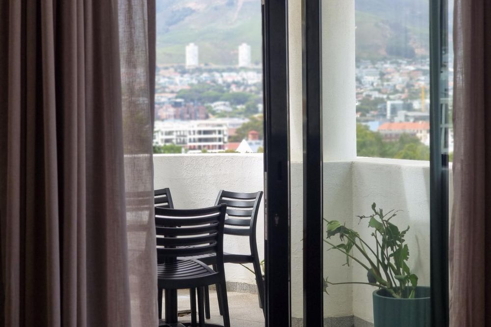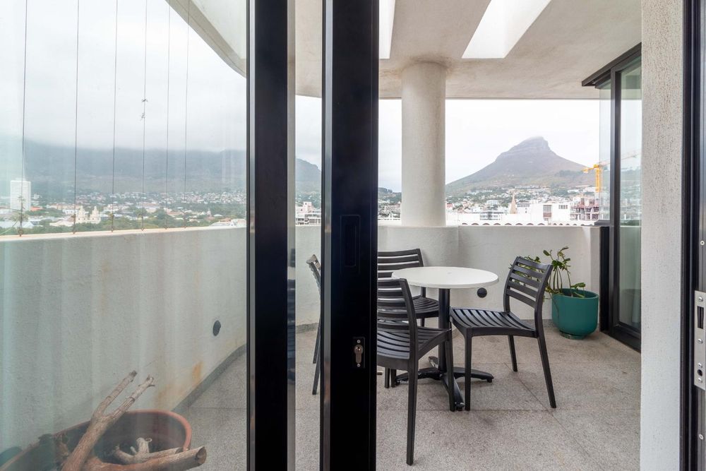 Open plan living area, leading to a balcony with sweeping views of the city with Table Mountain as a majestic backdrop.