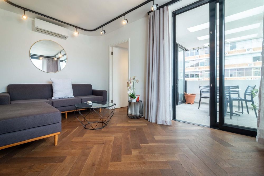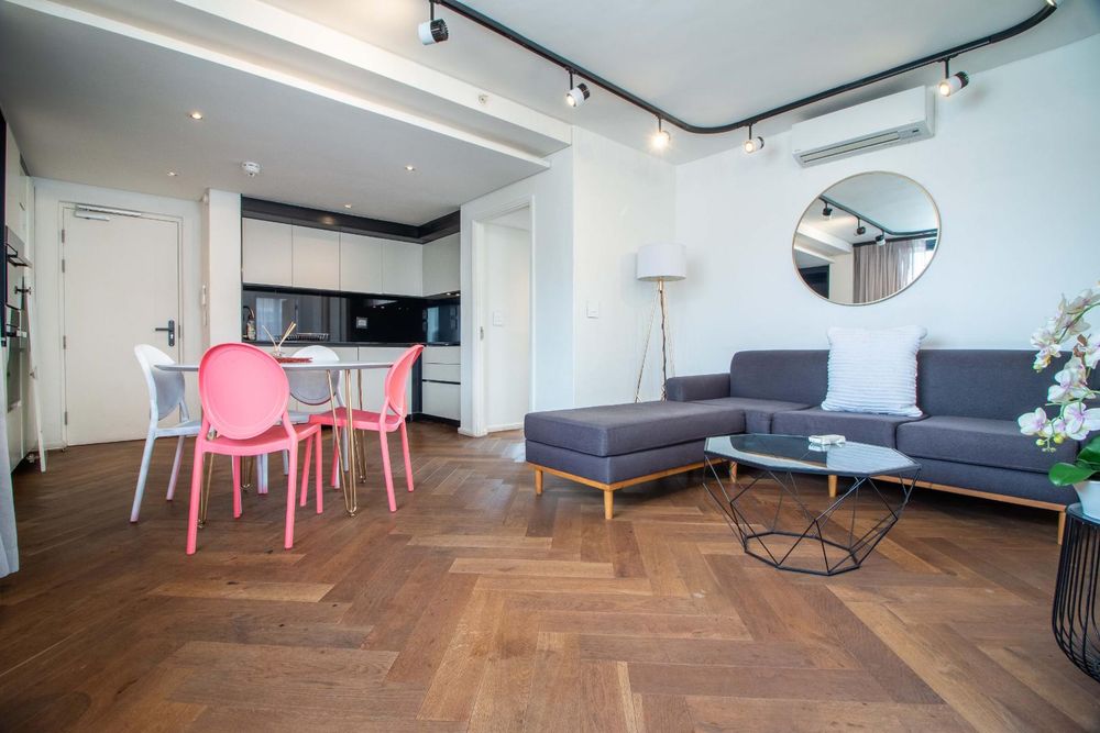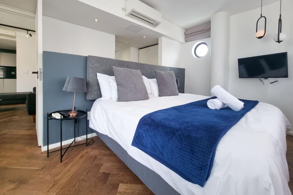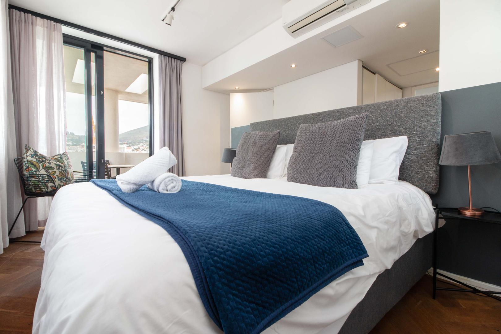 Open plan living area, leading to a balcony with sweeping views of the city with Table Mountain as a majestic backdrop.