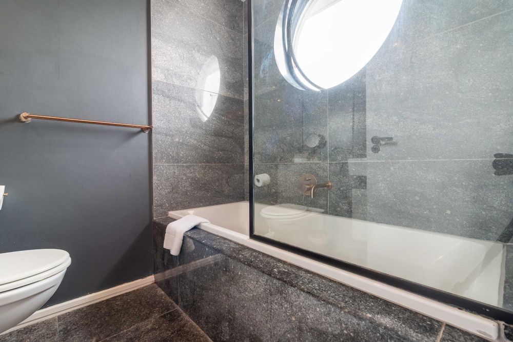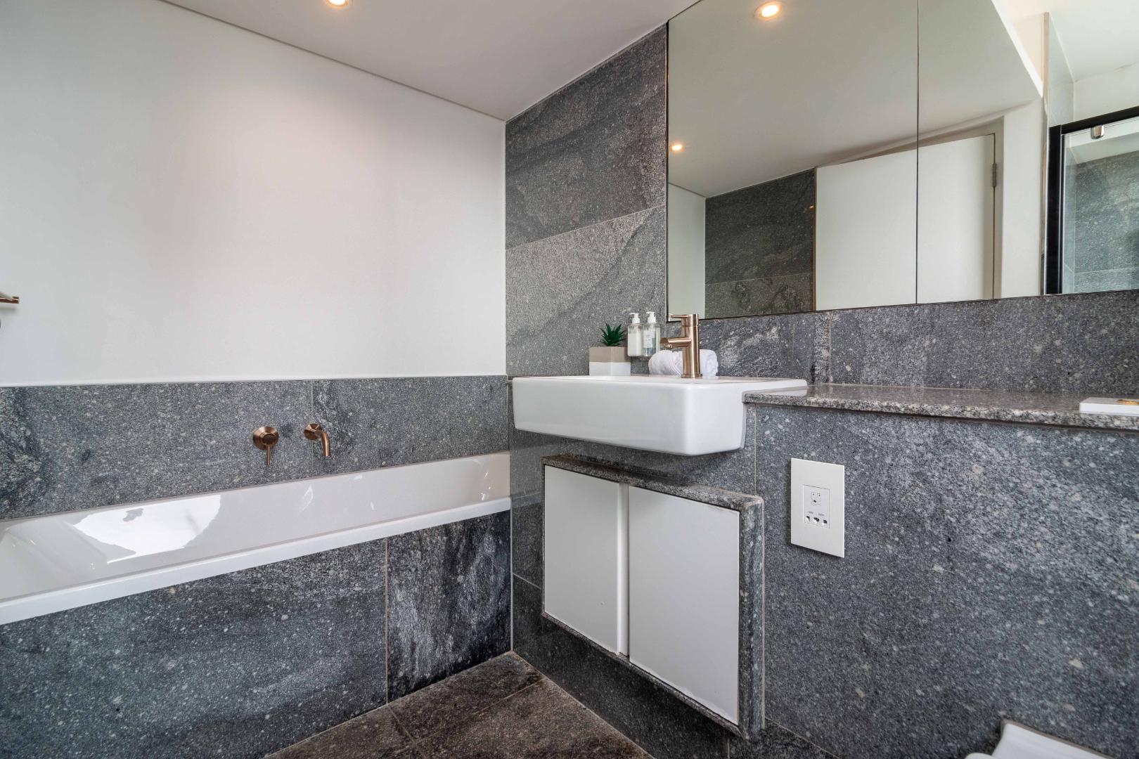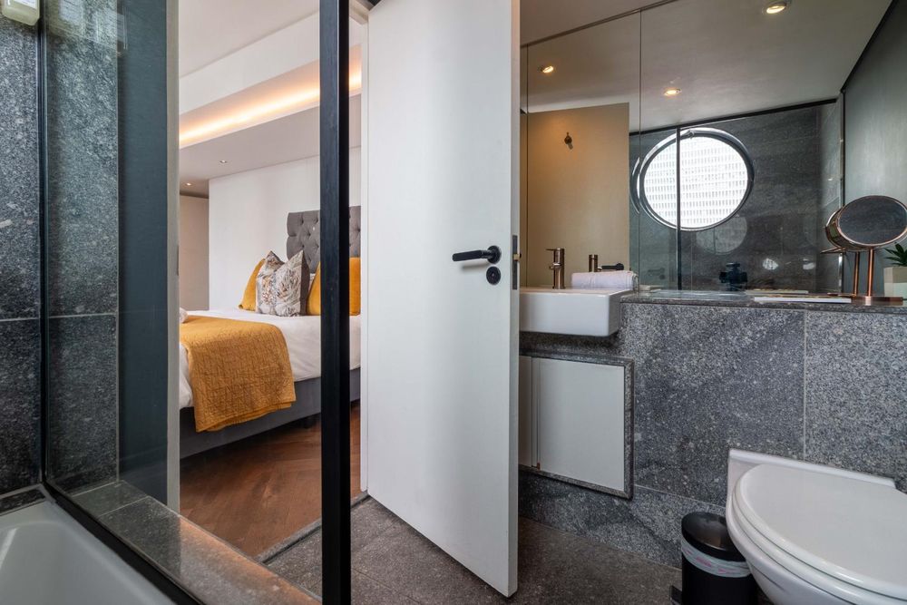 Two spacious bedrooms, both with lavish en suite bathrooms containing a shower and a bath.