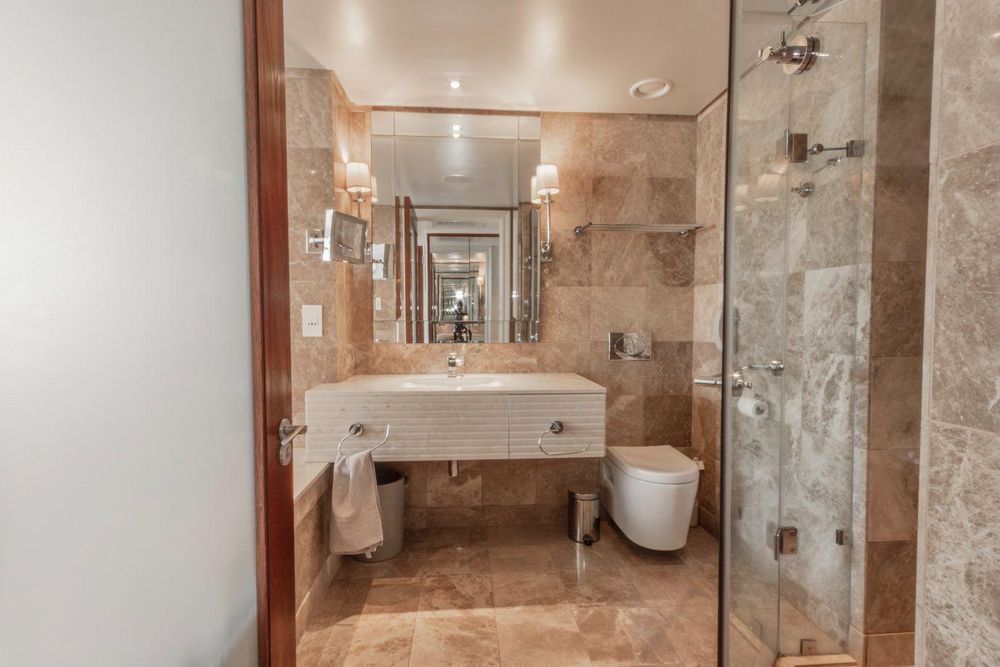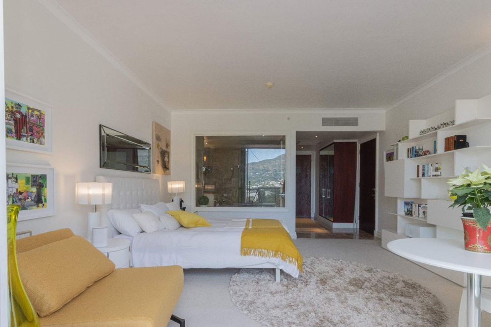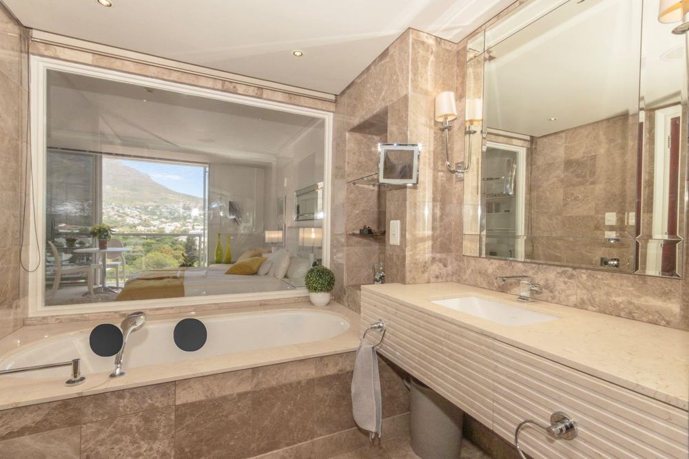 Experience refined city-living at its finest in this exclusive 44 m2 penthouse-style unit on the 15th floor of the Taj Cape Town. Positioned to deliver serene height and stunning vistas of Table Mountain, Lion's Head, and Devil's Peak, as well as the Company Gardens and Parliament Building, this home captures the essence of luxury in the heart of Cape Town. The bathroom is luxurious, the walls fully tiled with Emperador Light marble and Crema Marfil tops, and comprises a shower and a bath with views toward Table Mountain. The elegant suite is Ideal for a short-term rental investment, and this apartment is the ultimate luxury tourist launchpad.