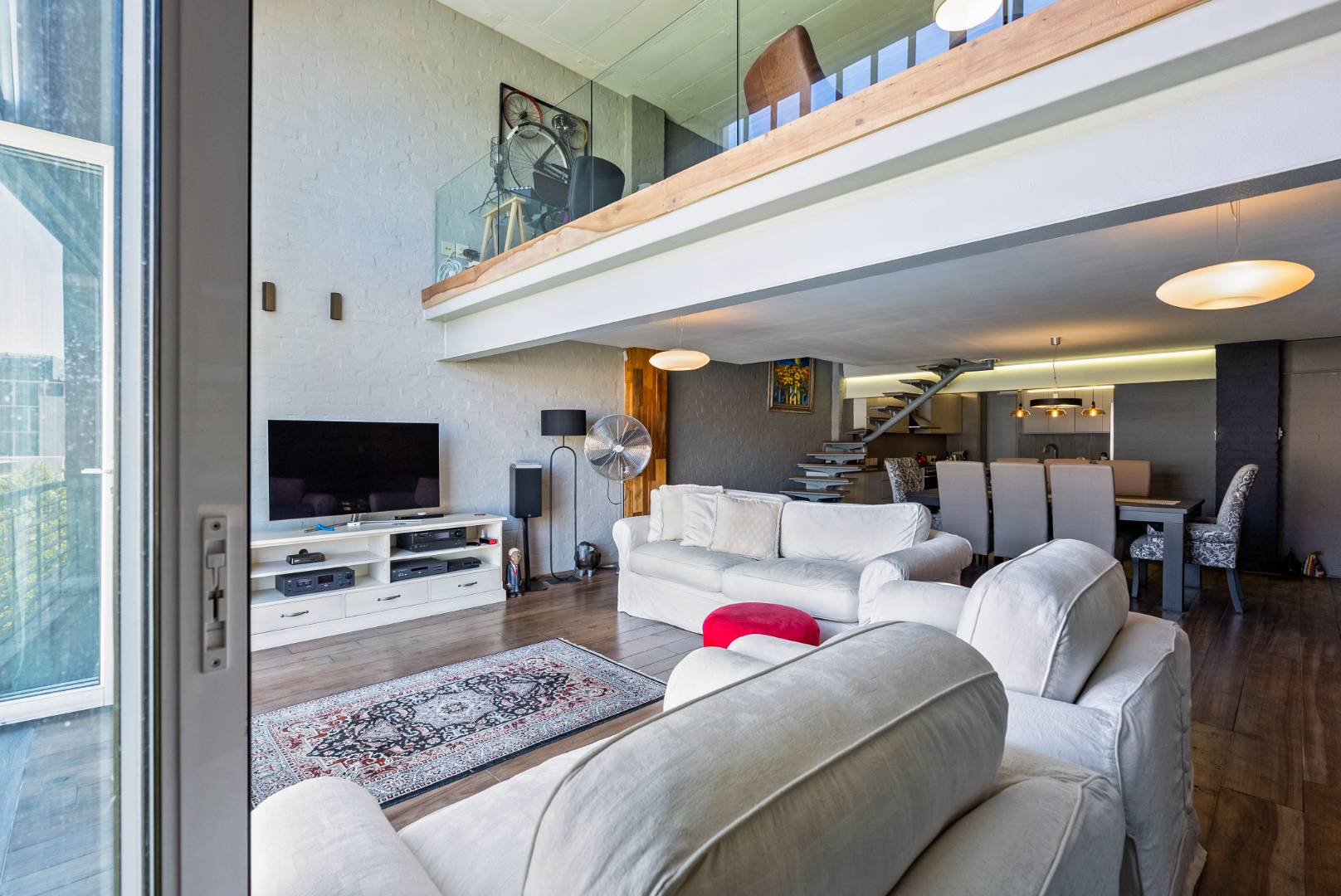 Spread over two levels, the loft combines volume, light, and texture in a seamless open-plan flow. High ceilings further emphasize the authentic loft character, creating an airy, architectural sense of space.