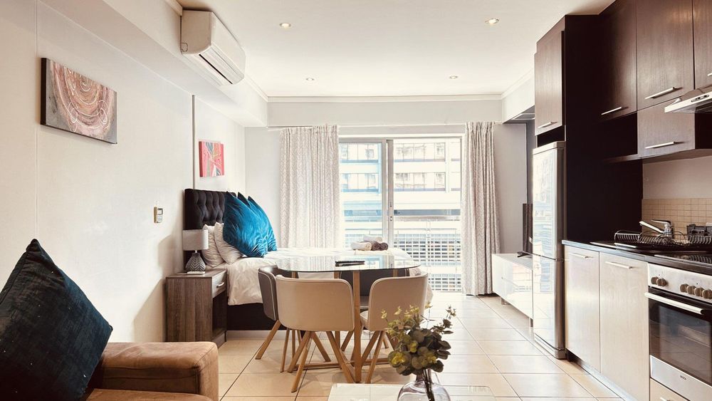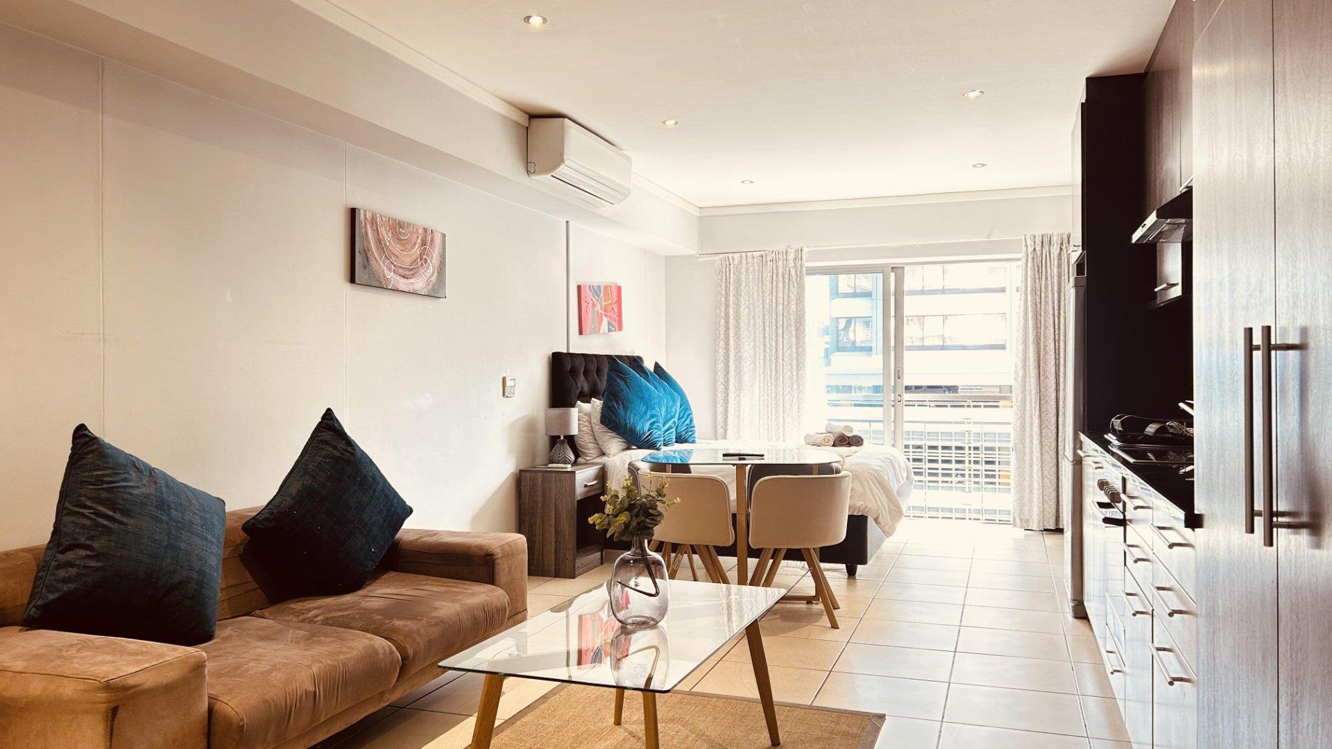 The apartment features a cleverly designed open-plan layout with air-conditioning throughout, creating a comfortable and functional living environment. The kitchen, dining, and living areas flow seamlessly into the sleeping area, separated by sliding doors, where you can enjoy charming glimpses of Table Mountain. Ample built-in storage enhances practicality, making excellent use of the space.