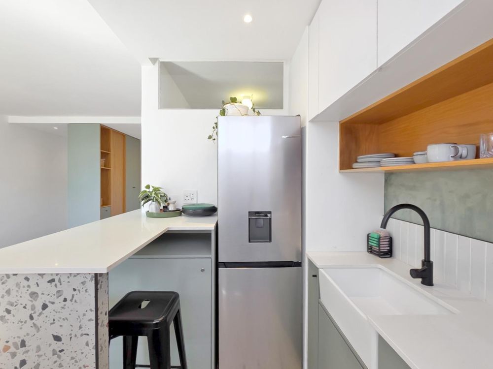The modern, minimalist, L-shaped kitchen layout makes the most of the small footprint. The aesthetic is a blend of natural and contemporary materials all grounded by a distinctive terrazzo floor and island face. Open wooden shelving adds a warm, natural contract to the sleek surfaces. The integration of black faucet and bar stools, along with the muted green accents, contributes to a contemporary aesthetic.