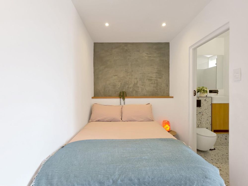 The cozy bedroom leads to a bathroom with modern design featuring terrazzo tiles, minimalist black fittings, light wood vanity cabinet and shower with a rain shower-head. There is a modern custom-built wooden wardrobe and shelving unit that functions as both entry way cabinet and compact wardrobe, separating the spaces.