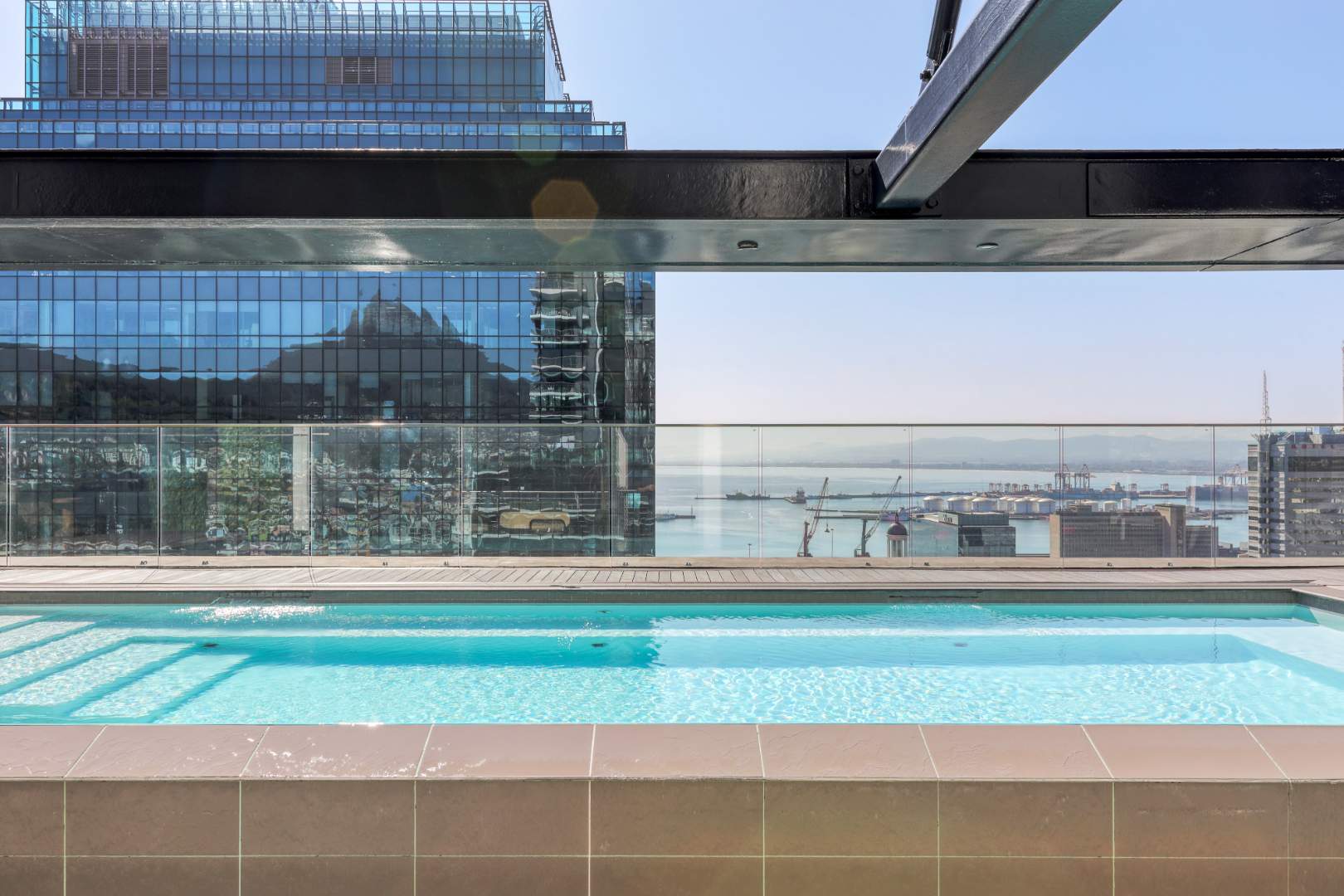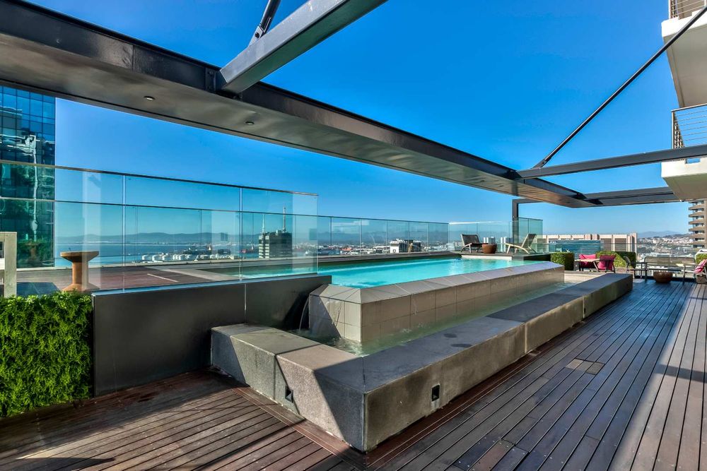 The 27th-floor pool at 16 on Bree in Cape Town is a premier infinity pool offering 360-degree views of Table Mountain, the city, and the ocean. Located at 16 on Bree, the city's tallest residential building, this amenity includes a bar, a deck, and an outdoor gym.