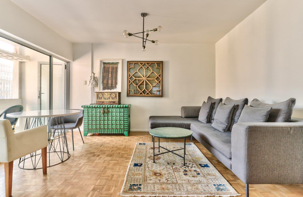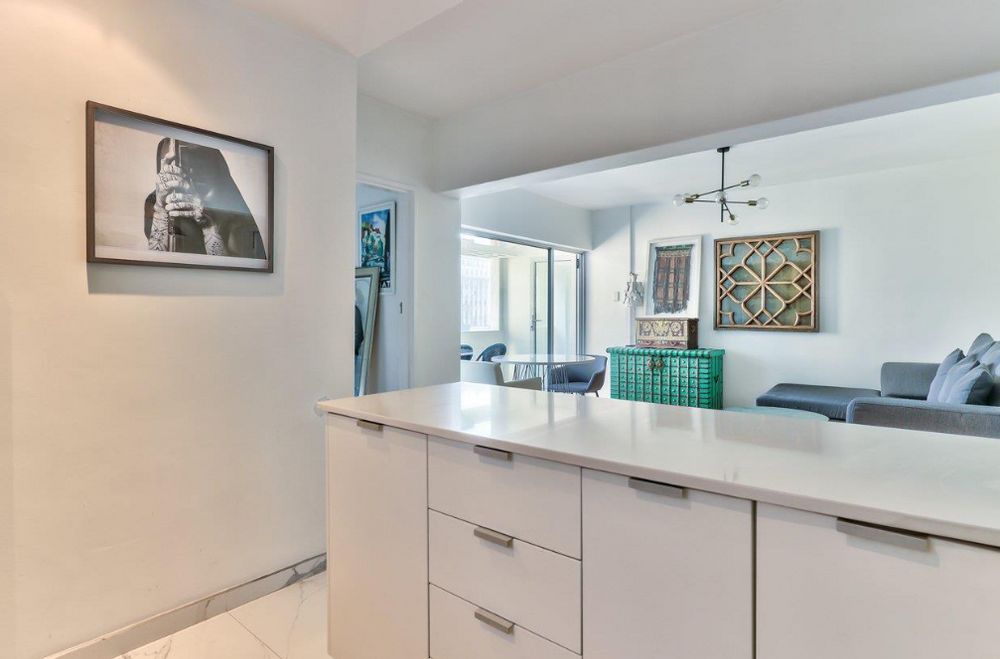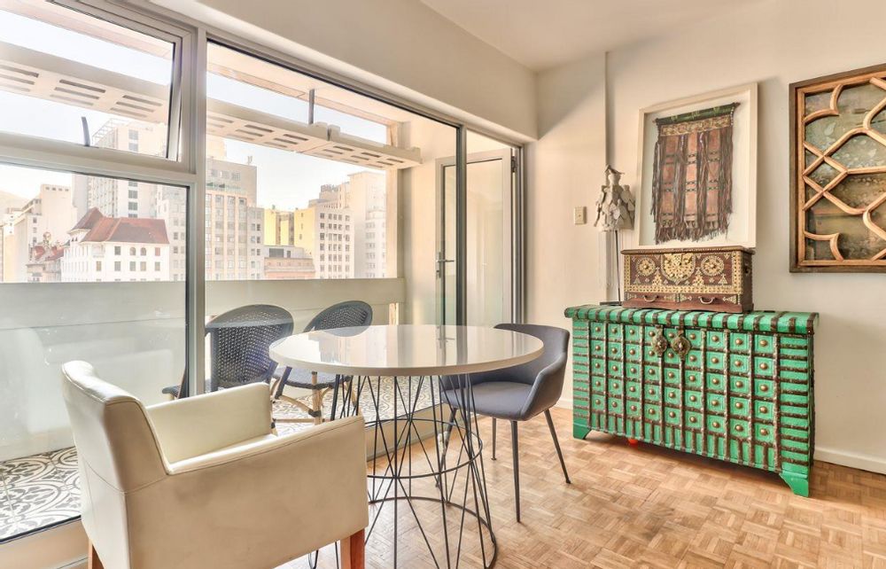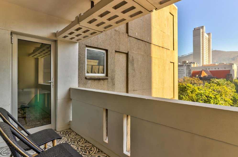 Open-plan lounge with great city & mountain views. Floor-to-ceiling windows leading to balcony. 2 Beds, 1 Bath.