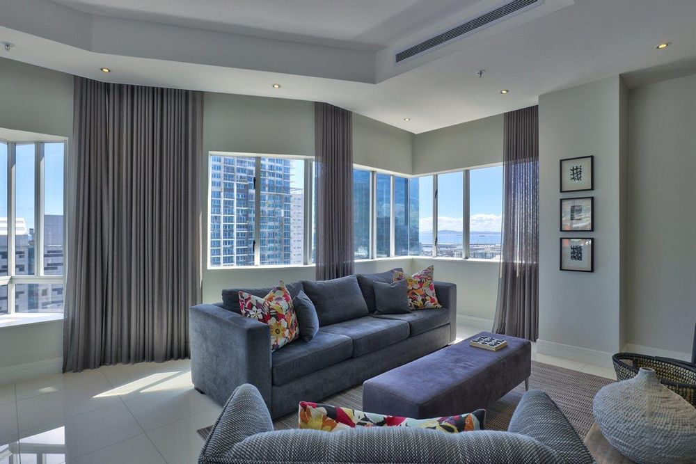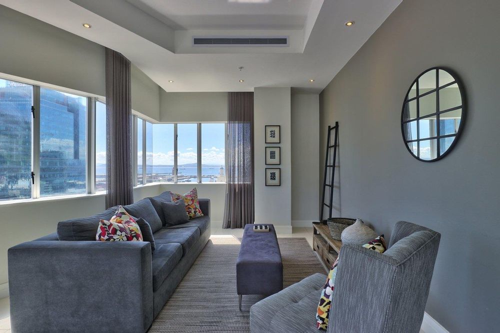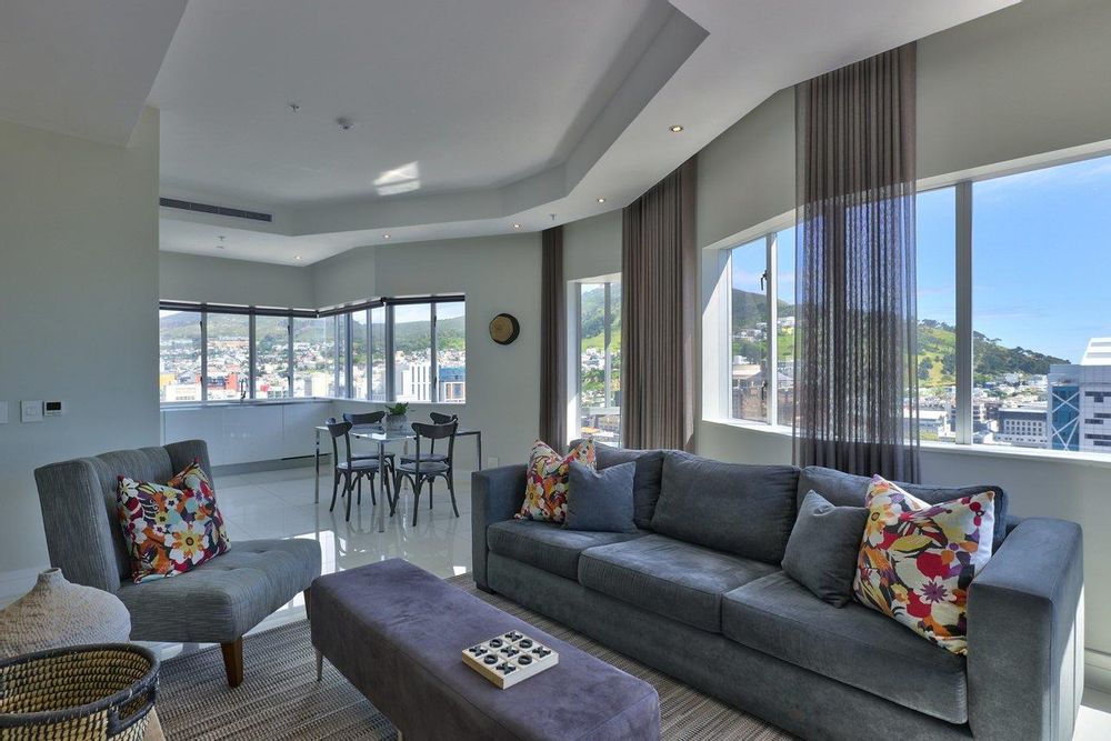 The spacious open-plan living area seamlessly combines a lounge, dining room, and kitchen—all designed to maximize the stunning views. The first bedroom offers captivating views of Table Mountain, Lion's Head, and the Upper City. The main en-suite bedroom overlooks the vibrant Foreshore and Cape Town Harbour.