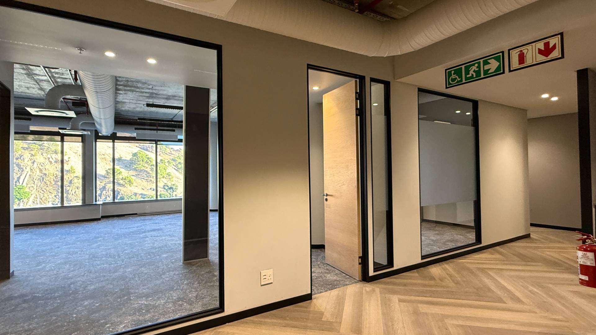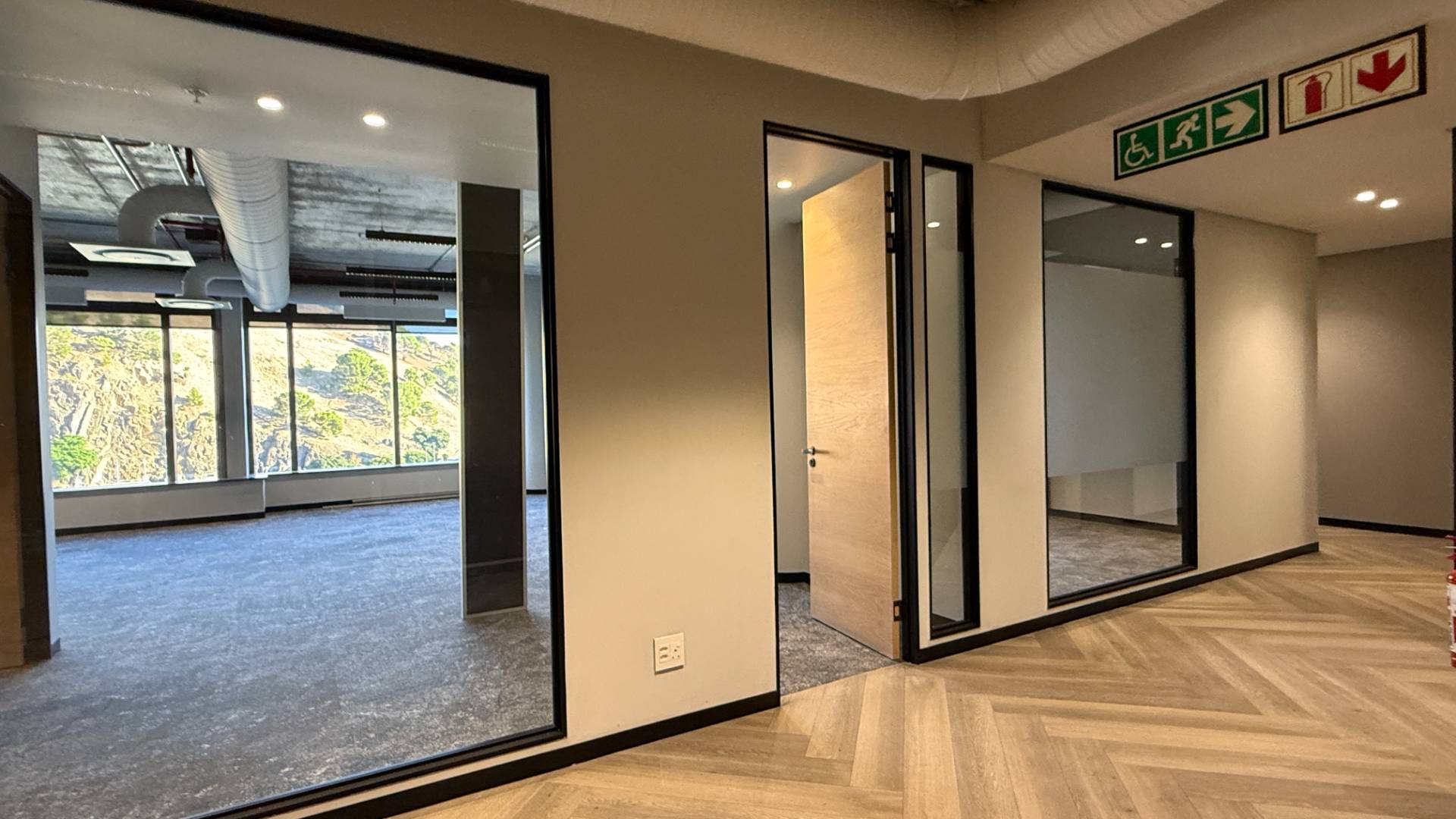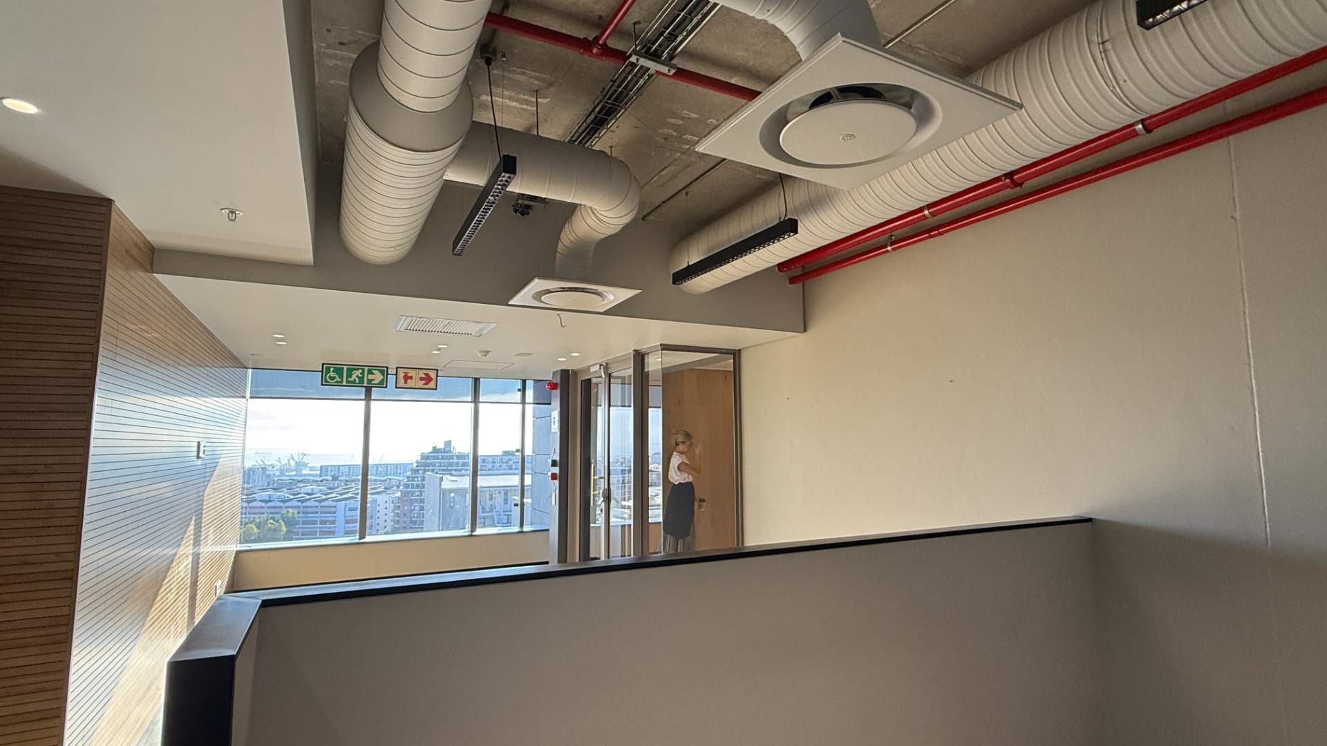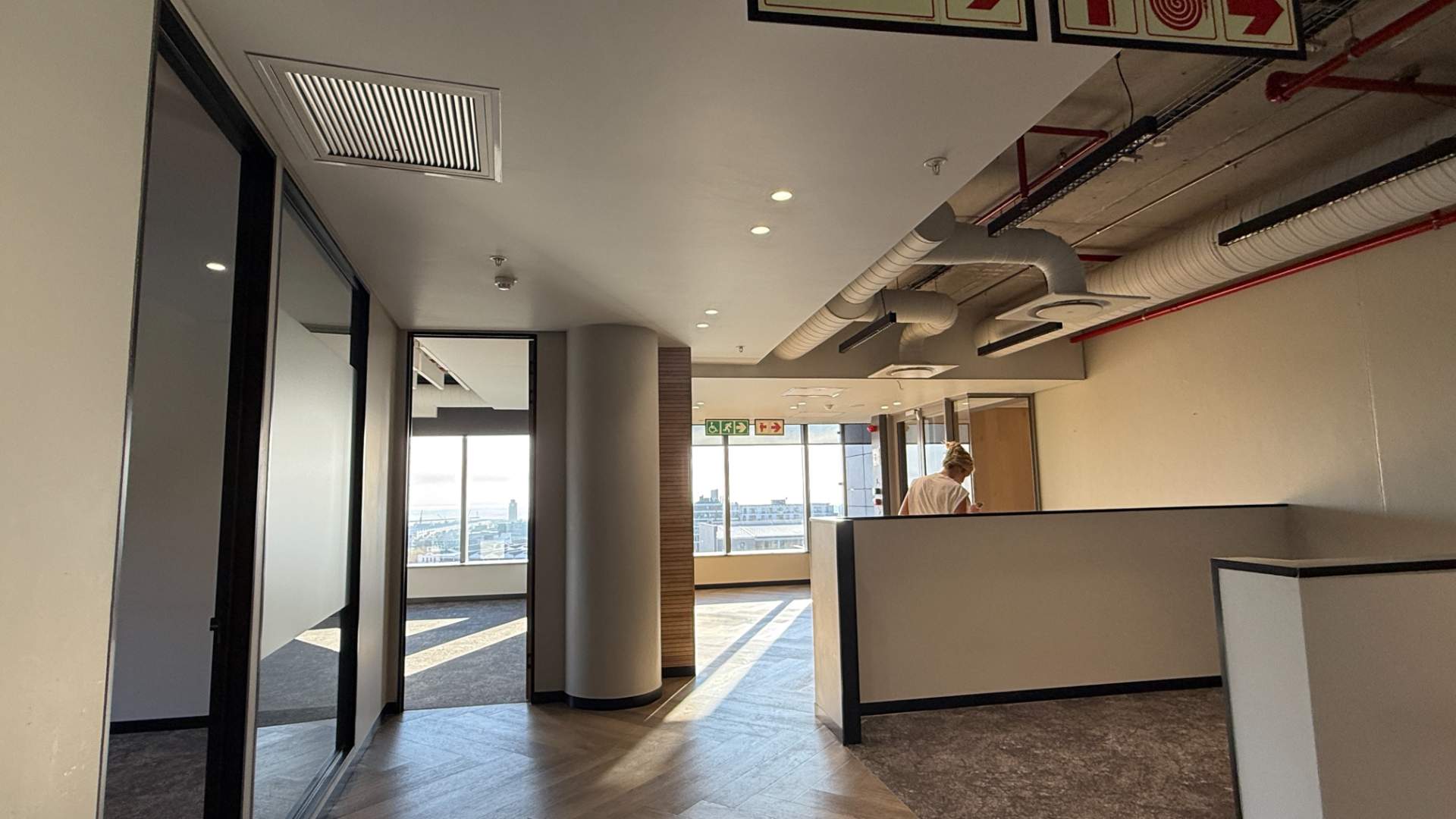 The office features an existing fit-out with partitioned offices and open-plan areas, allowing for immediate occupation or easy reconfiguration to suit your operational needs. Large windows provide abundant natural light and sweeping views over the city, creating a bright and inspiring working environment.
