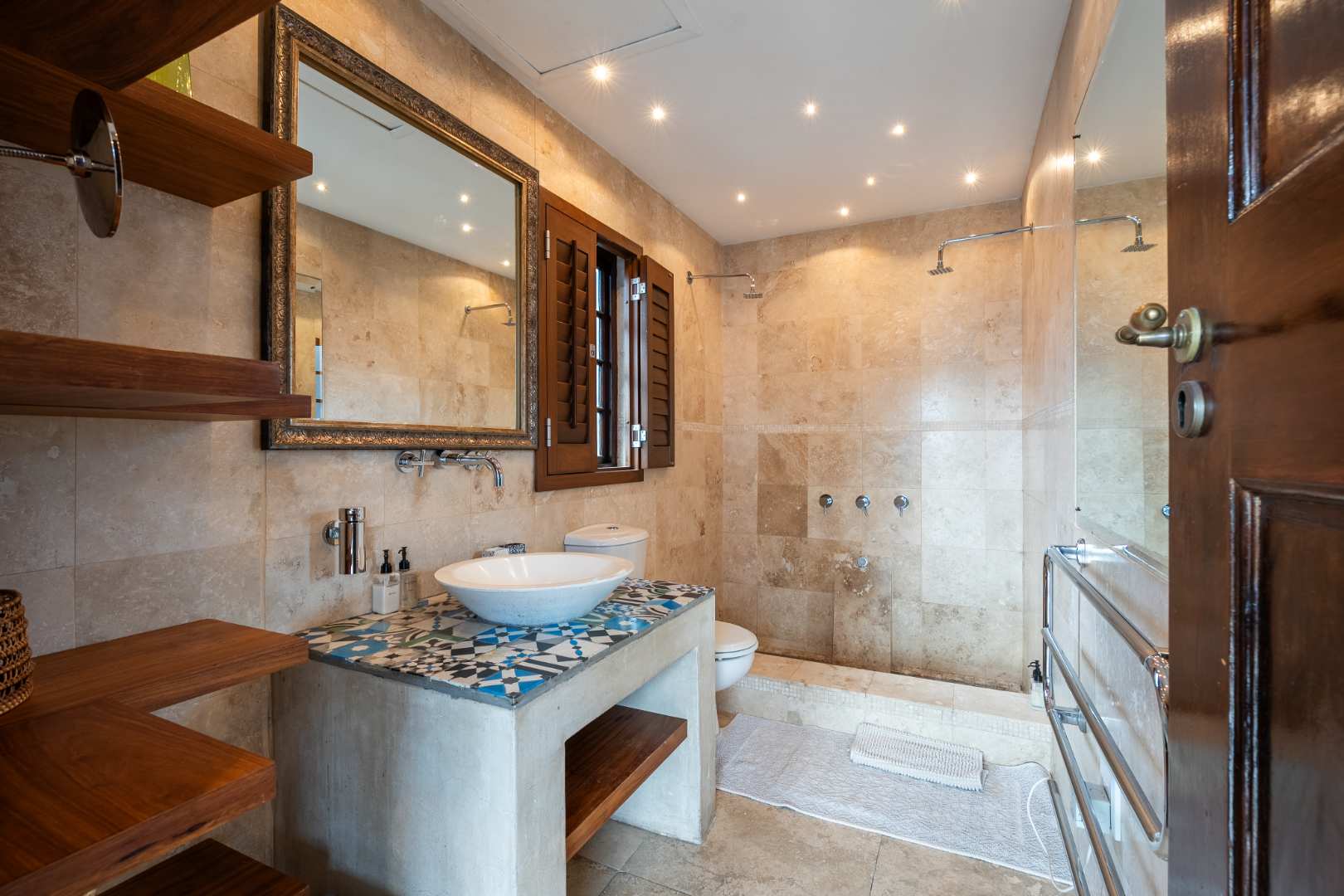 Floor-to-ceiling frameless stackable glass doors create seamless indoor-outdoor living. Wooden stackable shutter blinds enhance both aesthetics and functionality.