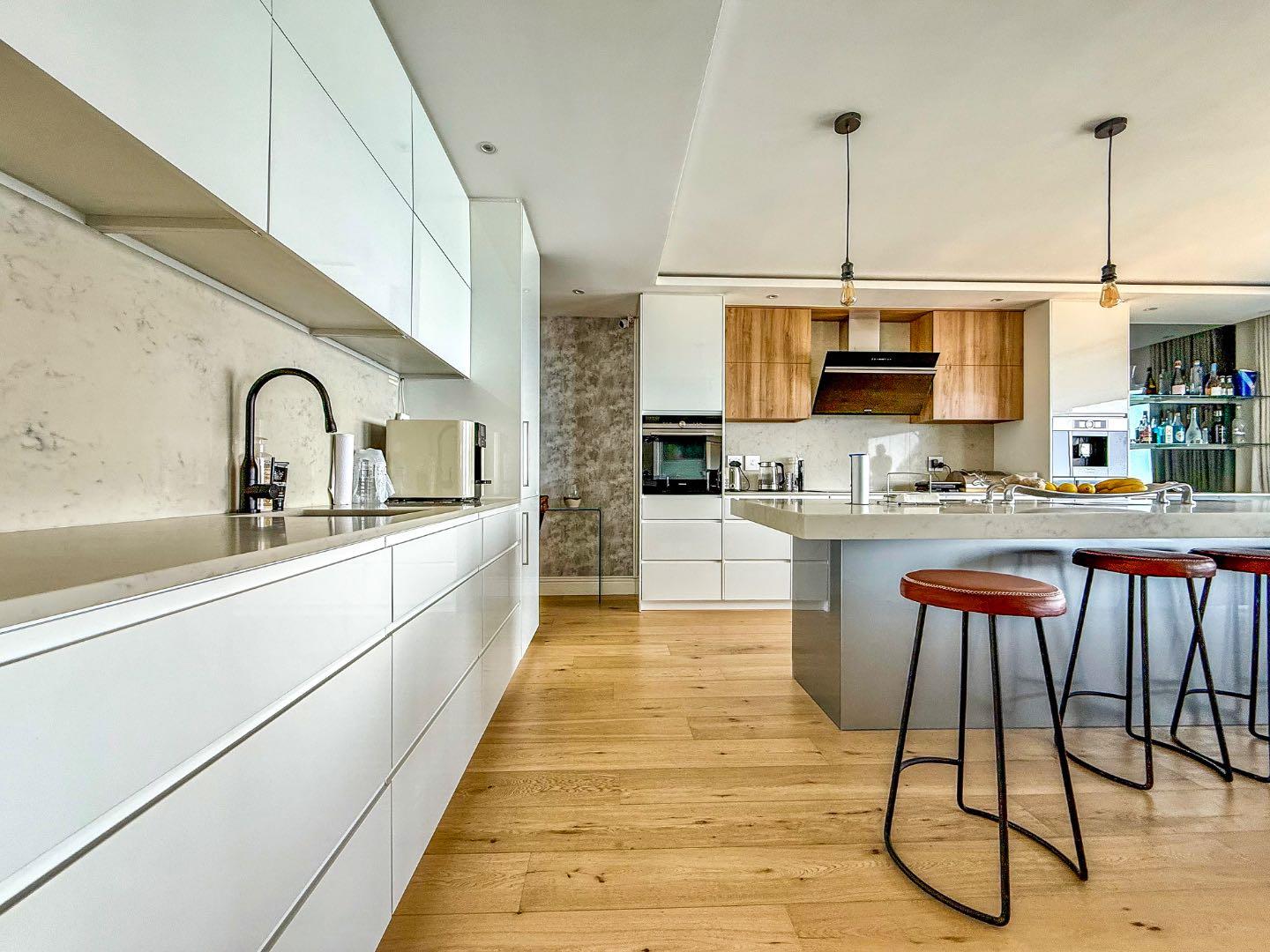* Sleek Open-Plan Design: A contemporary kitchen flows seamlessly into a dining area, perfect for entertaining.
