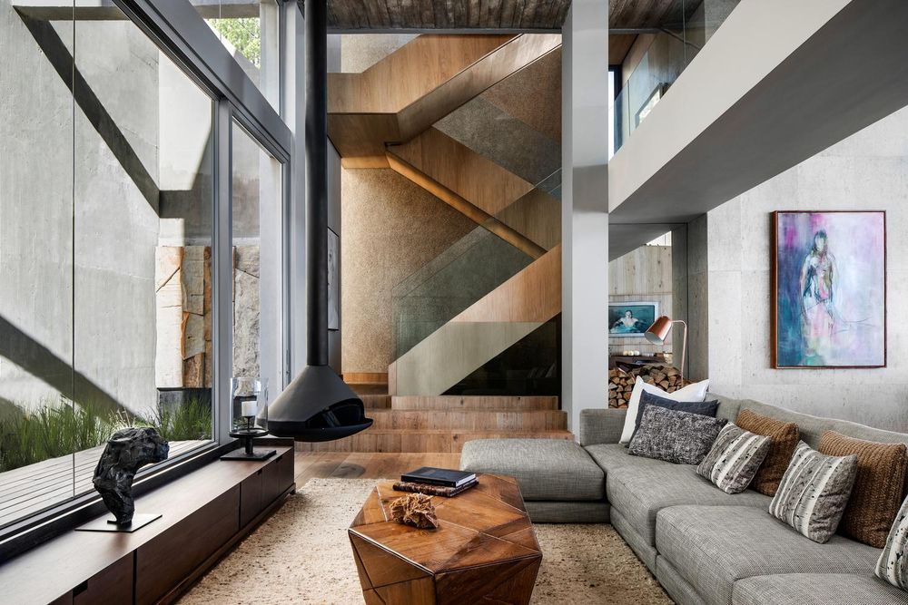 On top of this is a transitional space that is expressed as a green terrace and braai area, representative of what would have been the landscape’s foliage level. All levels of the house are connected via a sculptural timber staircase, like a folded ribbon that, appropriate to the home’s design narrative, gradually lightens in tone as it rises.